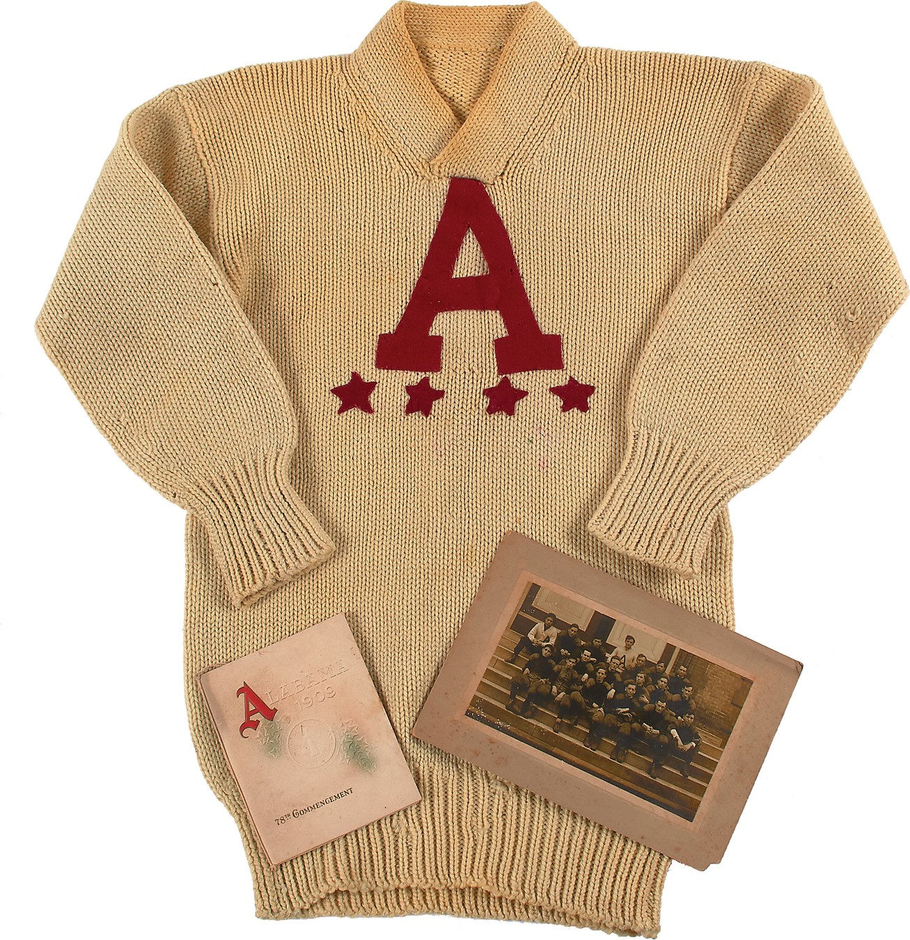 Roll with the Tide! This vintage V-neck sweater was worn in 1909 by player and assistant coach Clan Countess, who played for the University of Alabama and later became a respected attorney in the area. The garment has some minor holes and fraying, as well as a little red/pink staining that is barely noticeable. There is a large letter "A" on the front with four red stars below. The lot includes a matted team photo that measures 7.5x5" and a commencement program (measuring roughly 5x6"), both of which are in VG condition. The photo shows Countess at the top center wearing a similar sweater.