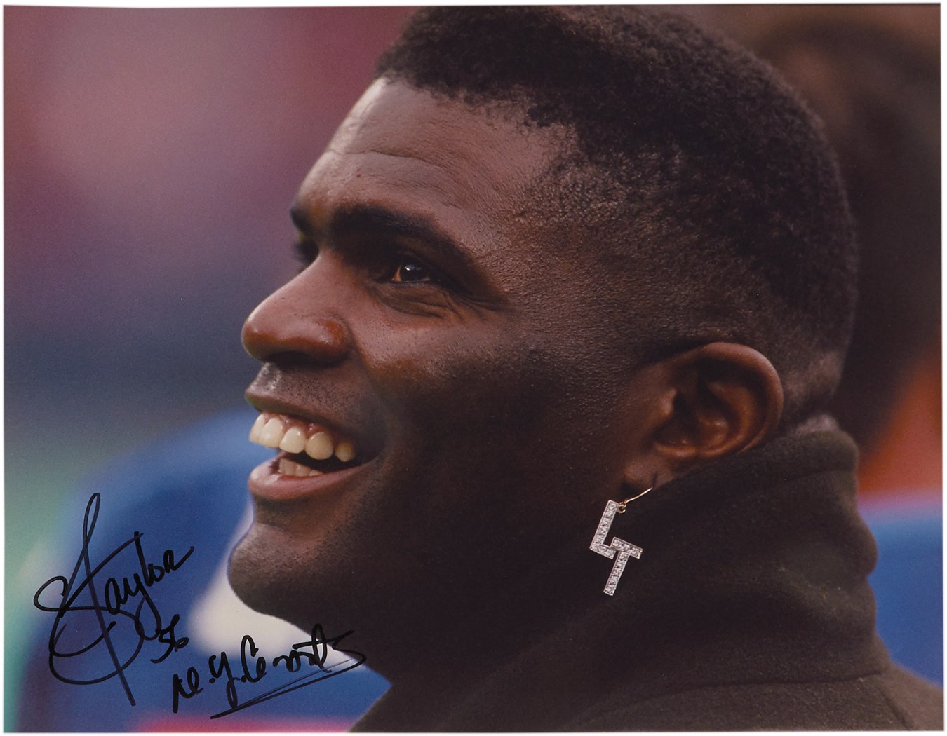 NY Giants & Meadowlands VIP photographer Richard Brightly printed this amazing quality Type I image himself and got the signature at the Meadowlands as well. Sharpie sig is HUGE: "Lawrence Taylor...56...N.Y. Giants." Richard Brightly photographer's stamp on verso, MINT condition.