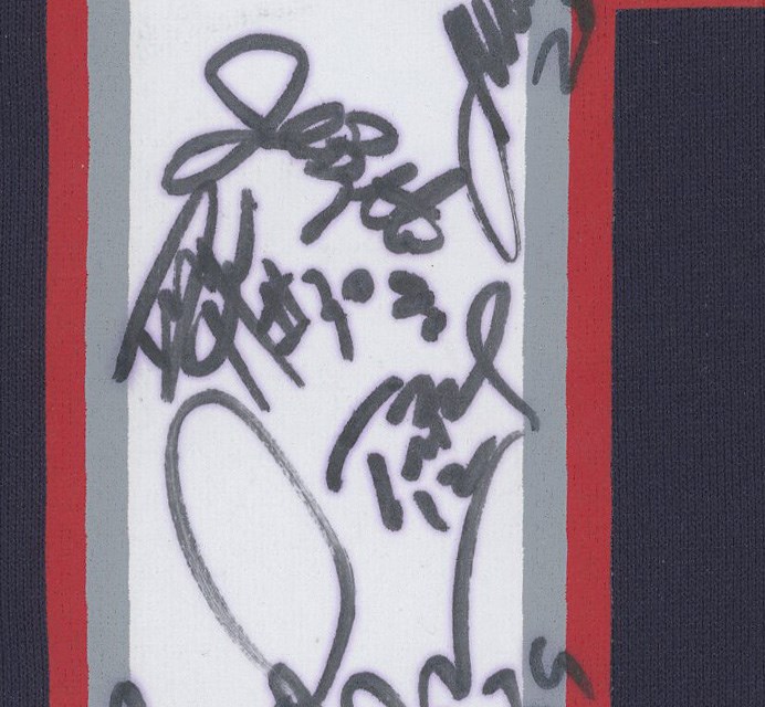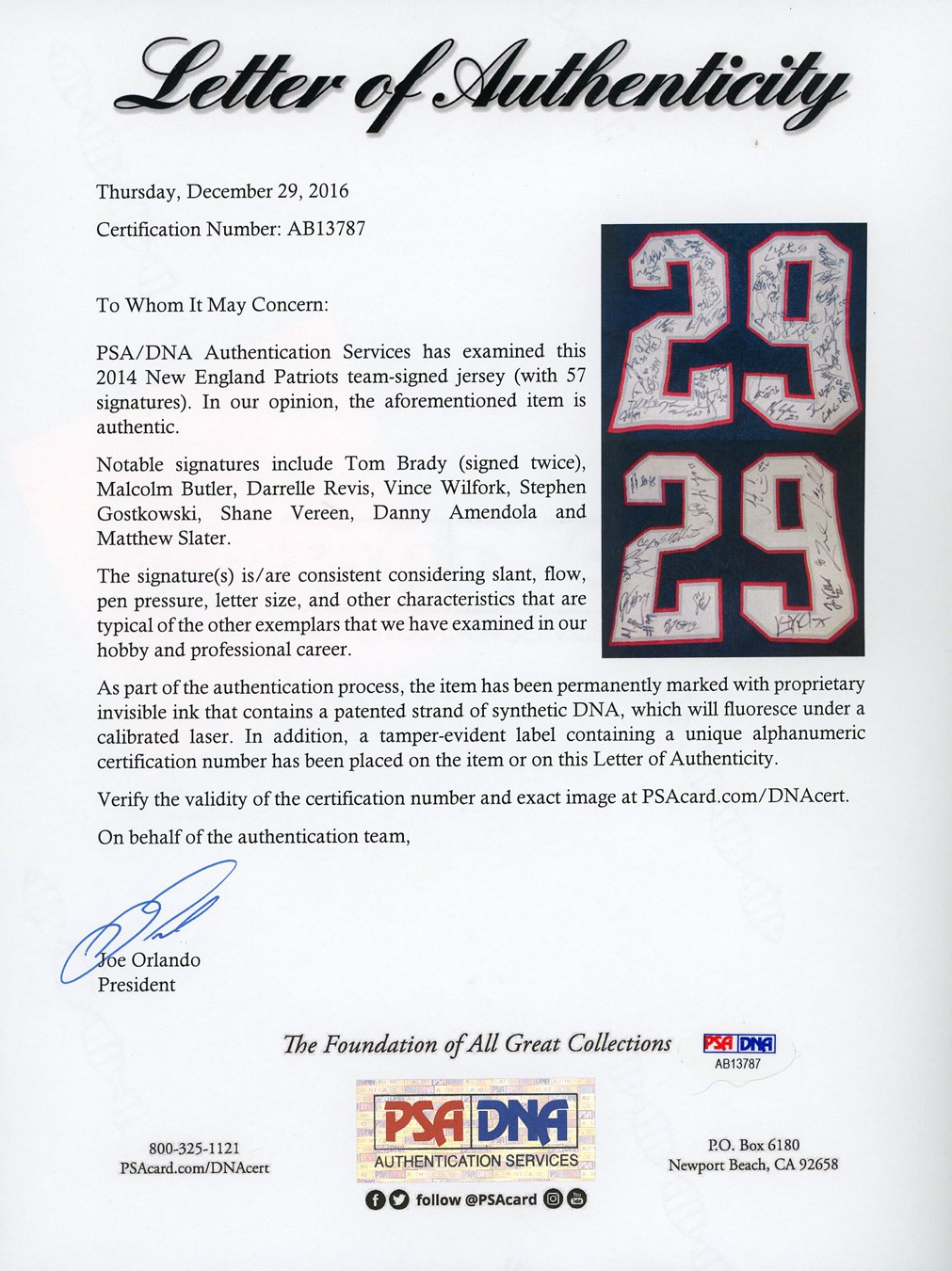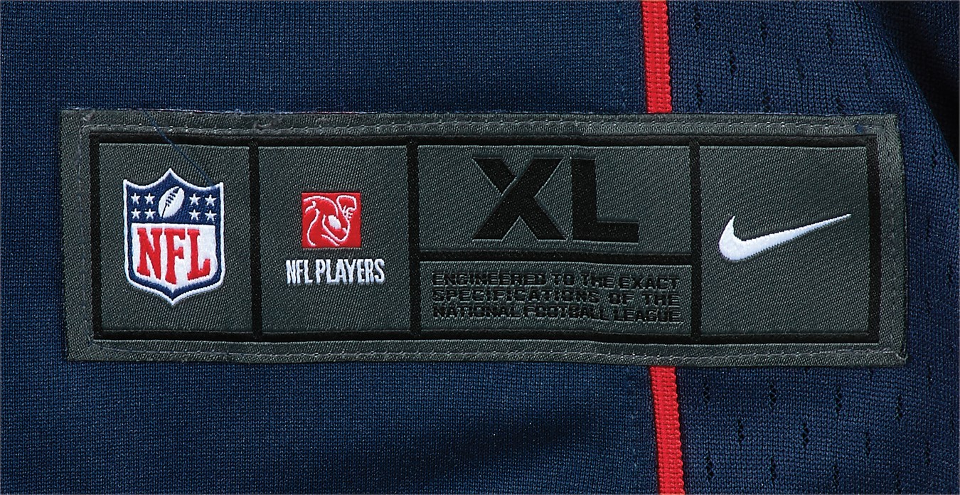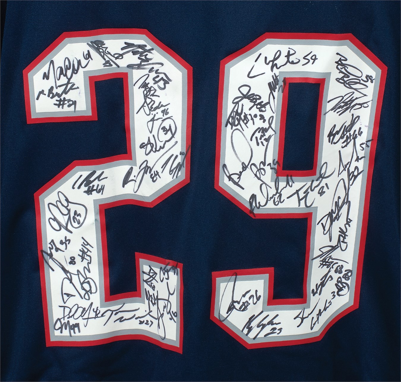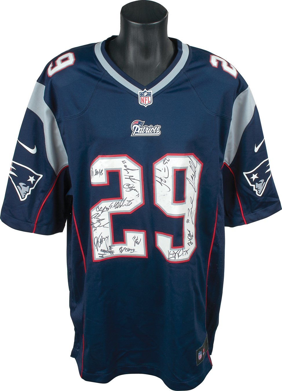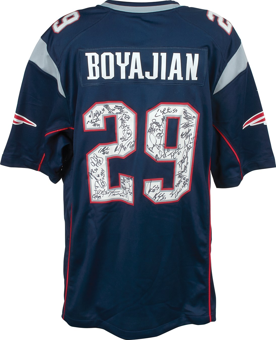 Both controversy and success have followed the New England Patriots in recent decades, and this 2014-15 Super Bowl Champion "Deflategate" Pats jersey was given to long-time employee George Boyajian. It is signed in black Sharpie by 56 members including: Tom Brady (twice), Darrelle Revis, Danny Amendola, Brandon LaFell, Stephen Gostowski, Malcolm Butler, Jimmy Garoppolo, Shane Vereen, Patrick Chung, Devin McCourty, Brandon Browner, Jerod Mayo and many more, with Brady appearing on both the front and back. The last name Boyajian is in white lettering on a name plate on the back with number "29" representing his 29th year working for the Patriots. Tail tag indicates the navy blue Nike On Field top is size XL. Comes with PSA LOA.