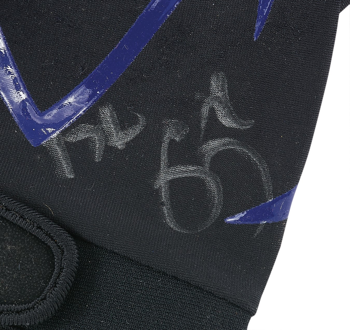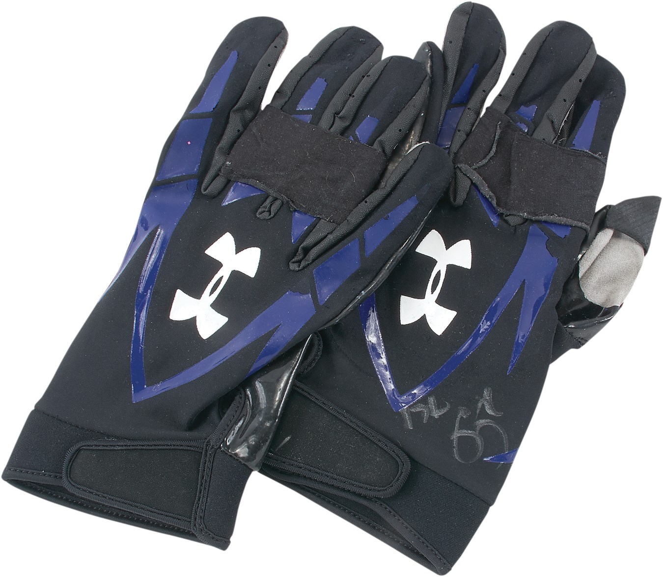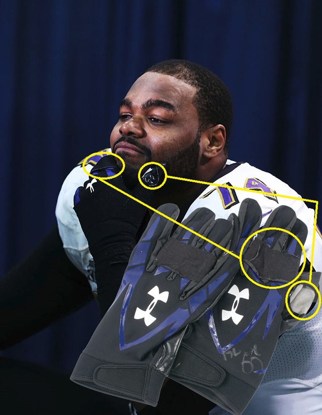 He was the subject of an acclaimed book and Oscar-winning movie that brought the football term "Blind side" into the mainstream. With the help of an adoptive family and school officials, Carolina Panthers offensive tackle Michael Oher made a miraculous transformation from neglected child and poor student into a successful NFL player. He wore these black-taped Under Armor gloves during game action when he was with the Baltimore Ravens, signing one in silver: "Michael Oher from Super Bowl XLVII vs. 49ers." They have been photomatched exactly and come with a JSA COA. Don't turn a "blind" eye on this special lot, which carries both sporting and cultural significance.