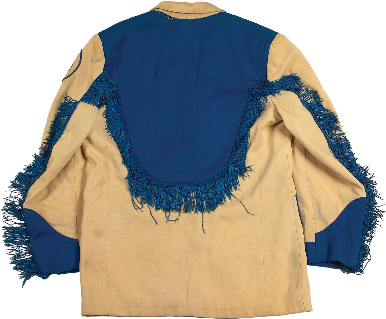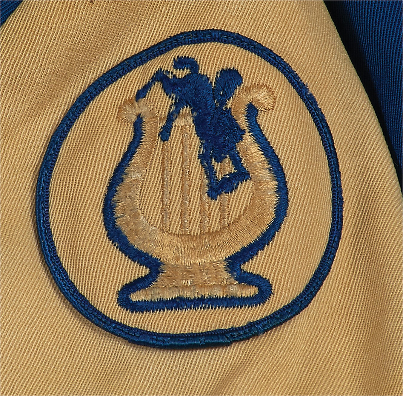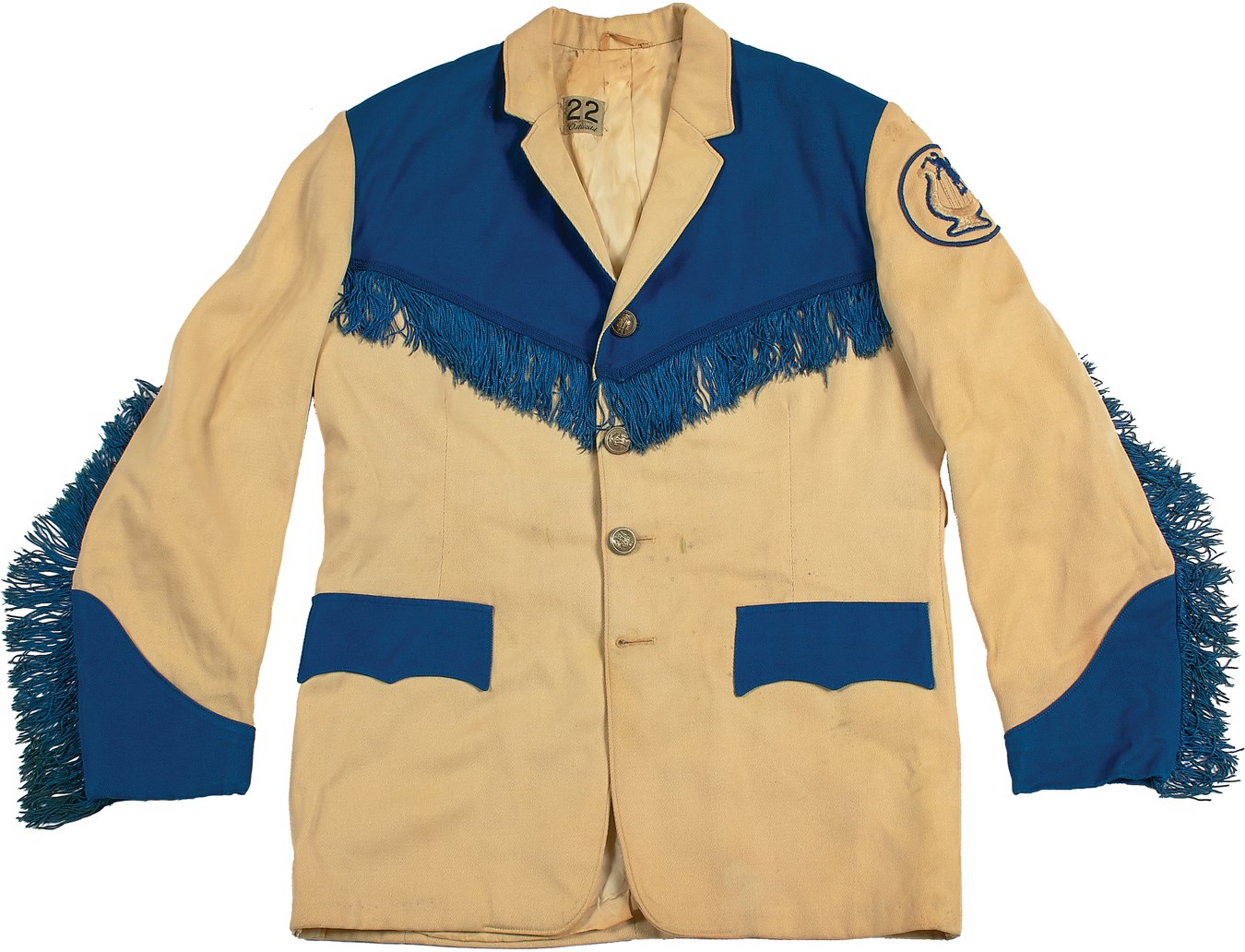 They are "The Band That Wouldn't Die," as so named by Academy Award winning director Barry Levinson, one of Baltimore's native sons. As noted in his 2009 sports documentary, the Baltimore Marching Ravens band has supported three different franchises in that city since 1947 and was temporarily silenced as a result of the infamous relocation of the Colts to Indianapolis in 1984. Here is a blue and gold band member's uniform from the early days of the troupe. It features blue fringe, three metal buttons down the chest (one is missing), Ostwald tag in the collar with the number 22 and the Colts logo patch on the left shoulder. A cool and colorful collectible.