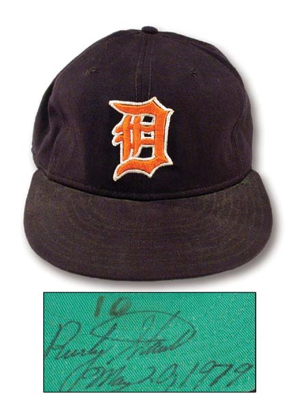 Two months to the day after the big redhead shucked this cap and signed it for a fan, Staub was traded to the Montreal Expos, ending his days in the Motor City. Size 7 1/2 "New Era" cap shows fine use, with sweat-stained headband, and vintage number "10" in marker under knob, with 10/10 black marker signature and dated "May 20, 1979."