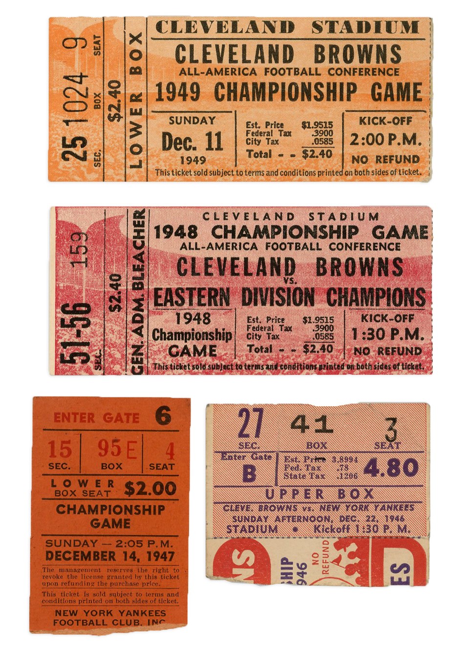 It wasn't around long, but the All-America Football Conference gave the NFL a run for its money from 1946-49, with the Cleveland Browns winning all four championships over the span. These four ticket stubs are very tough to locate but here is a complete set just for you. They break down this way: 1946 Browns vs. New York Yankees, 1947 Browns vs. Yankees, 1948 Browns vs. Buffalo Bills and 1949 Browns vs. San Francisco 49ers. The tix are in EX condition overall.