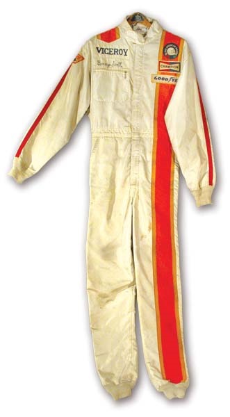 Heavily-worn fire suit dates from the time when the drivers used to wear them more than once before getting a new one. Note how the back is much darker than the front? That's sweat and g-forces at work. All kinds of endorsement patchs decorate the front, from "Champion" to "Goodyear." Patch on upper right chest reads, "Black American Racers." Main sponsorship is "Viceroy." Includes photo of Scott wearing similar suit. From the Paul Hill Collection.