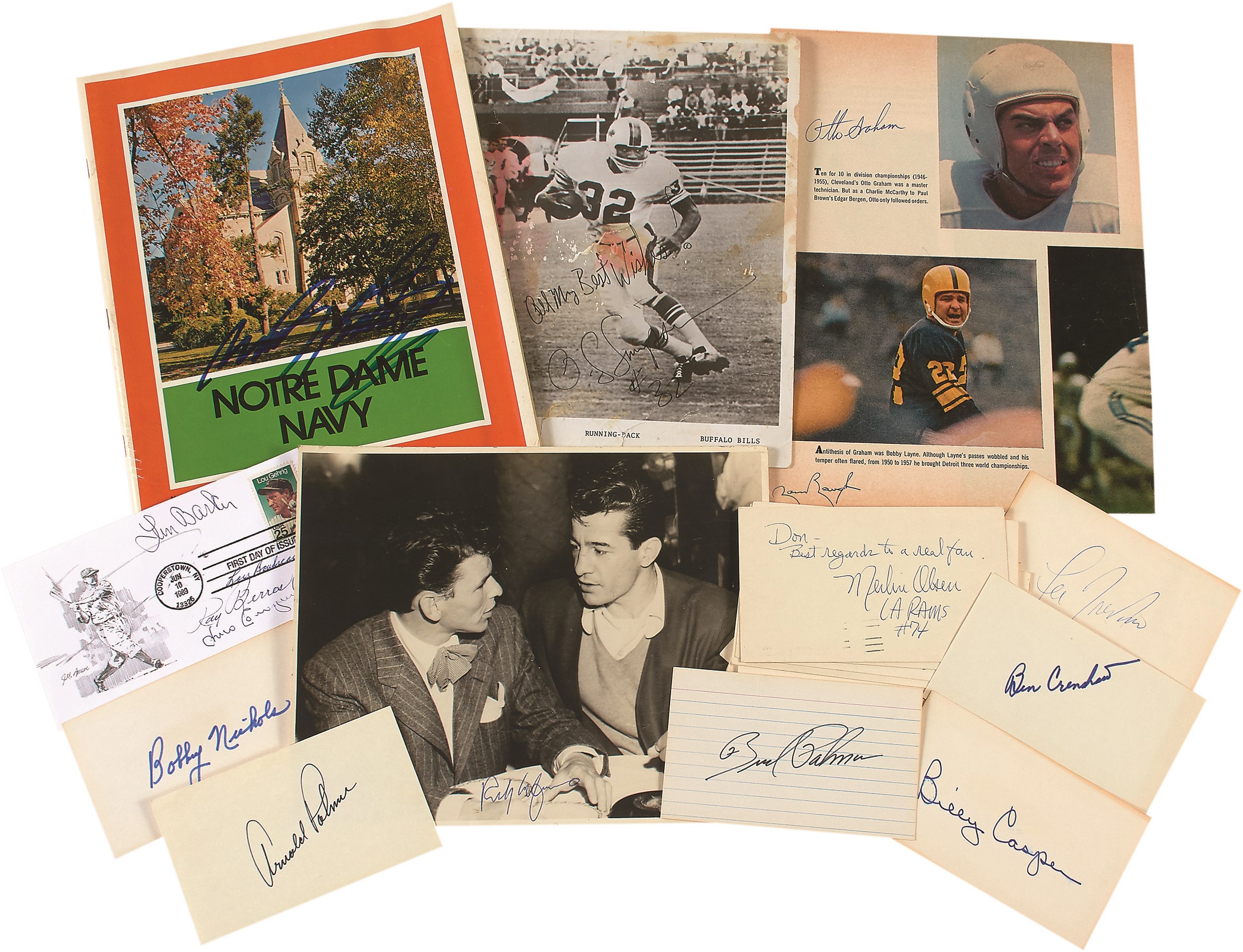 Featuring a little bit of everything with sports icons from boxing, football, racing, golf, baseball and more, this grouping of over 25 autographed pieces includes legendary athletes. Among the autographs available are: Arnold Palmer, Jack Nicklaus, Rudy Ruettiger, Rocky Graziano, Otto Graham, Sammy Baugh & Sid Luckman, OJ Simpson, Frank Gifford signed index card, Mario Andretti, Billy Casper, Roman Gabriel, Bobby Nichols, and more. Most are on 3x5" index cards, and there are signed photos as well as a Notre Dame vs. Navy program from November 1, 1975.