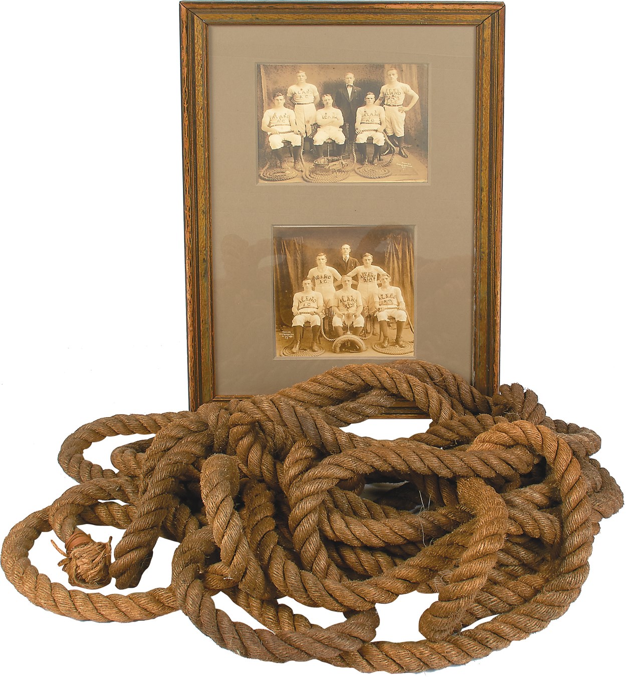 If you feel like you're at the end of your rope, just put a bid in and grab this unique artifact that was used for tug-of-wars in the early 1900s. The substantial thick-braided actual rope comes with two Type I photos of it framed together to 17x27", showing the participants from the Alano Athletic Club of New York. Another name for Al-anon, club members were obviously a formidable group, as their chests are covered with medals in the images.