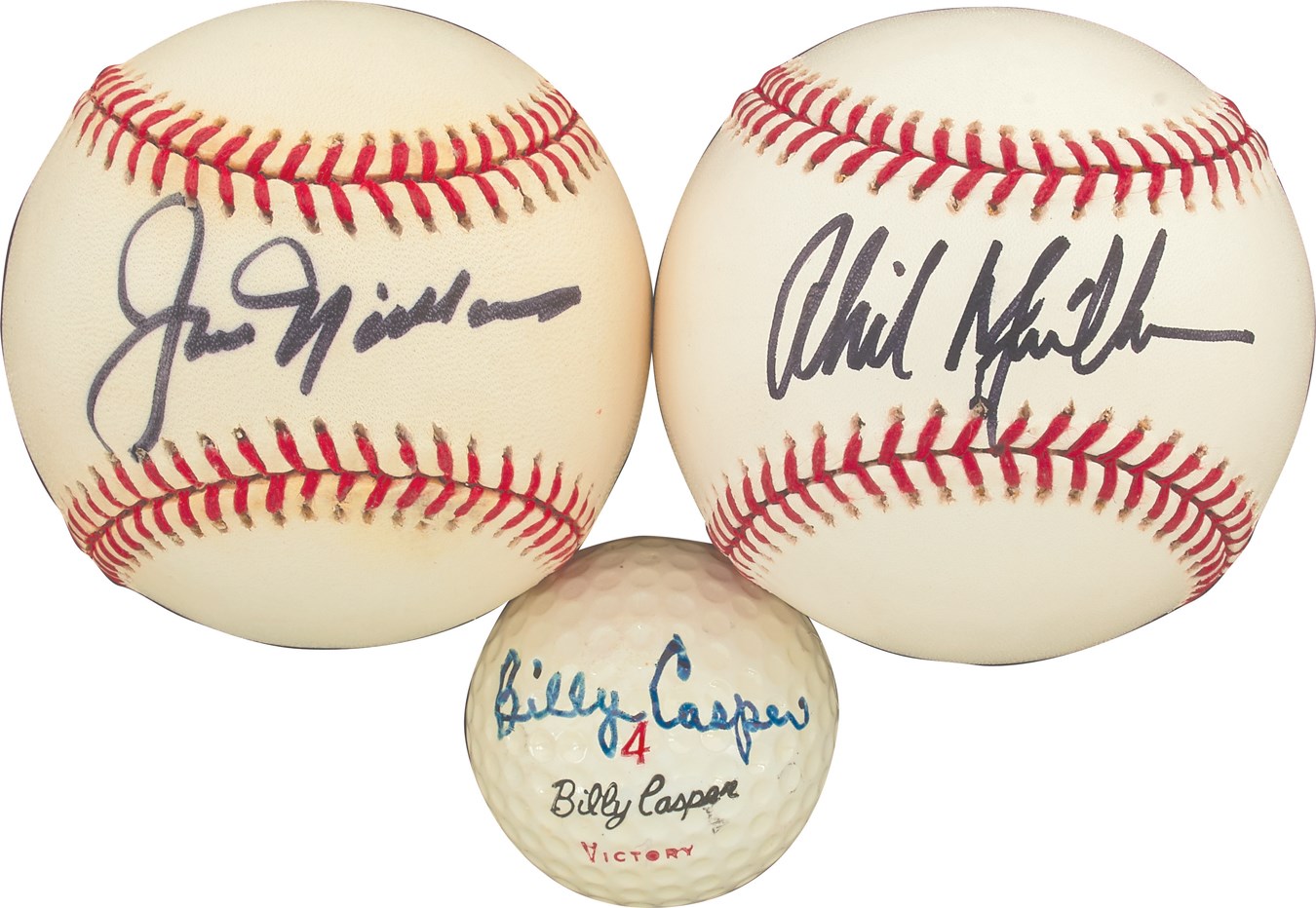 A trio of links legends have offered signatures in this lot. Two single-signed baseballs are adorned with Phil Mickelson and Jack Nicklaus, both signed on the sweet spots in 9/10 black Sharpie. Both NRMT condition baseballs, the Mickelson is on an Official Major League (Barry Bonds 600th) baseball with JSA authentication sticker affixed, while the the Nicklaus is on an Official National League (Coleman) baseball. Also included is a Billy Casper signature model Wilson golf ball, which is NRMT and signed by Casper in 8/10 black felt tip. Overall the three greats amassed a total of 239 career PGA Tour wins.