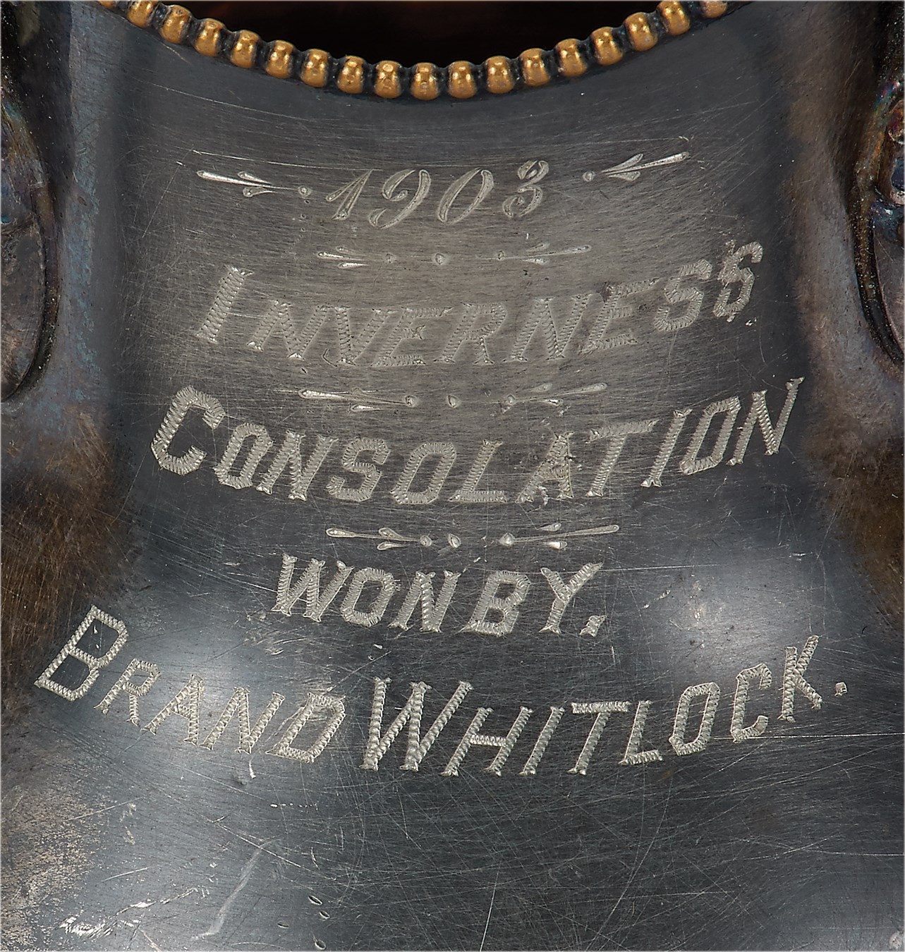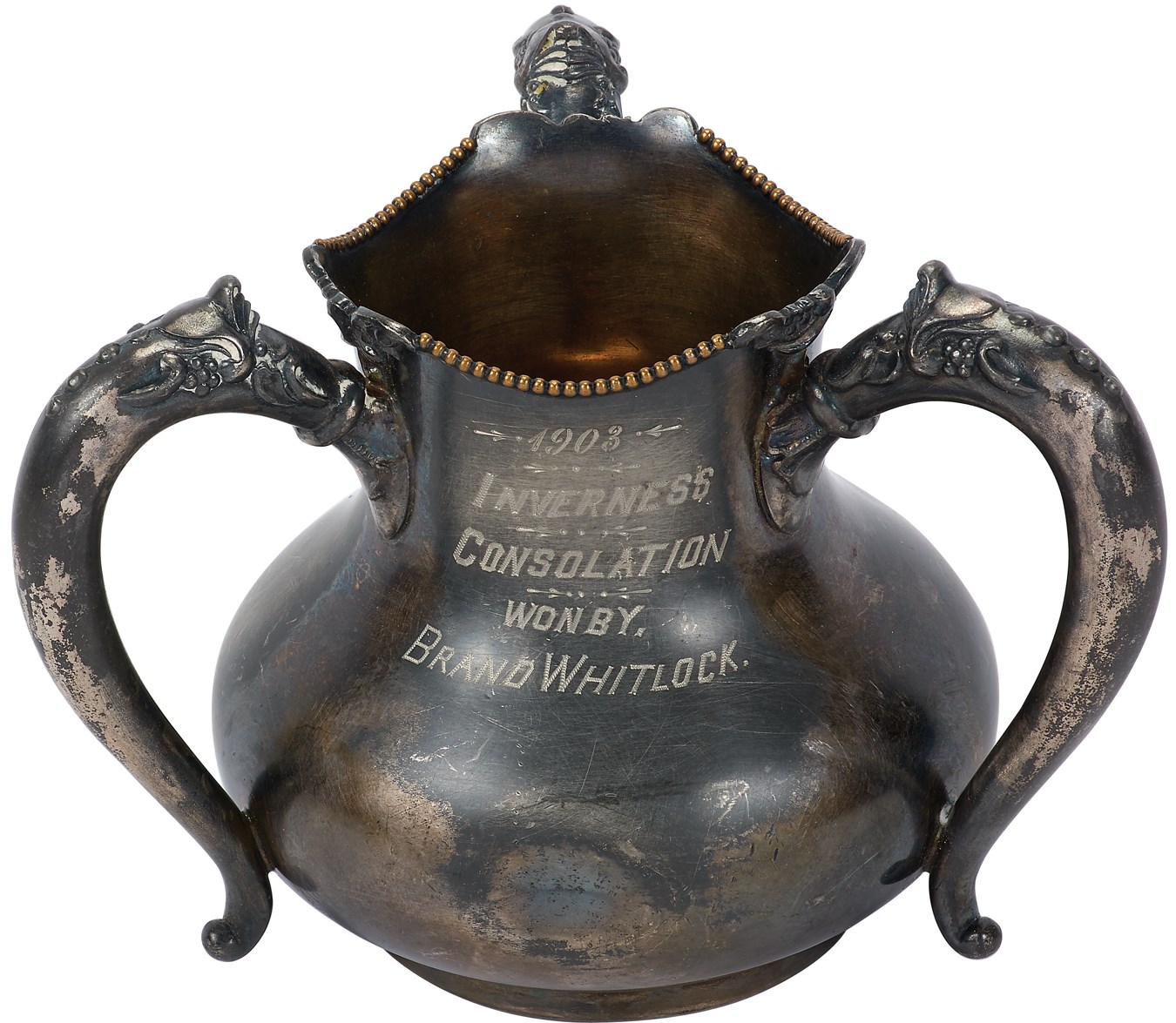 Inverness Club is a golf course which has hosted four U.S. Opens, two U.S. Senior Opens, two PGA Championships, and a U.S. Amateur. This is its first year first ever championship trophy silver bowl. Made of silver plate by Poole Silver Co., it reads "1903 Inverness Consolation Won By Brand Whitlock." The three-handled pitcher with ornate scroll work measures 5.25" high and has one ding, no other flaws. Whitlock became a celebrated Mayor of Toledo and has a statue dedicated to him (see postcard).