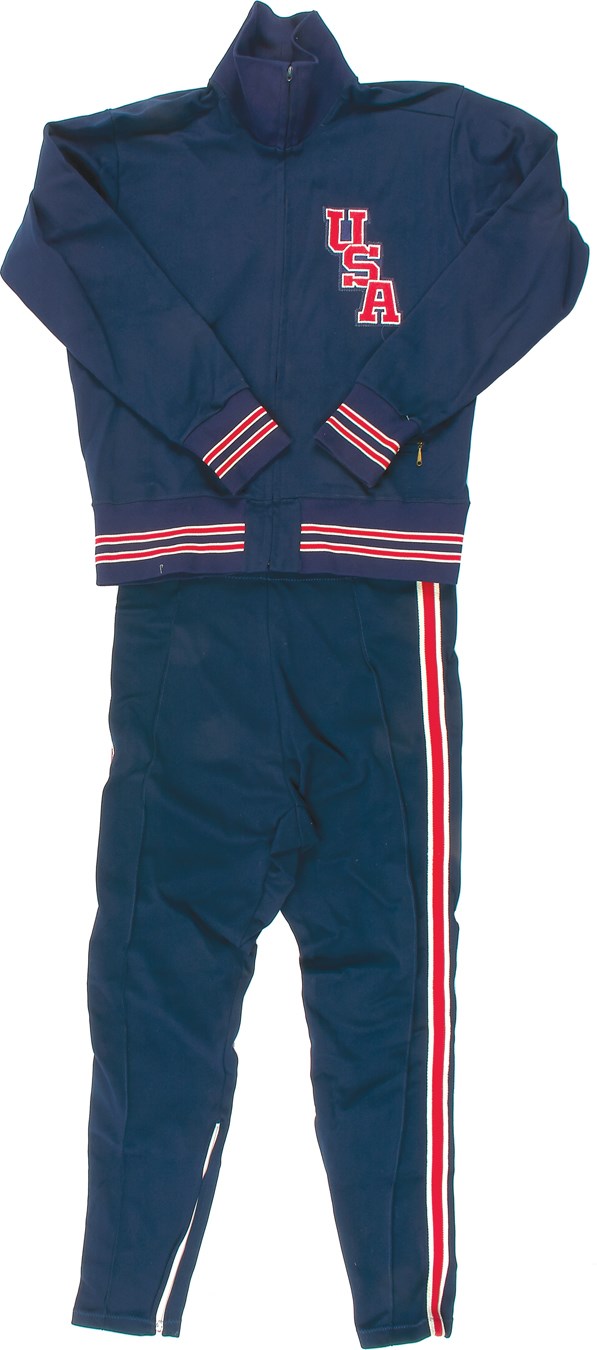From the Mexico City Summer Olympics of 1968, offered here is a Team USA warm-up suit consisting of top and pants. The navy blue Wilson zip-front top is noted on the manufacturer's tag as size Large, and there is a smaller tag with "M" affixed. The USA crest is embroidered on the left breast above the only pocket, which also zips. The drawstring-waist bottoms are also navy blue, with red-and-white piping down the leg and zip cuffs. Both tags appear to bear the handwritten name "Axelrod," which would link it to five-time Olympic fencer Albie Axelrod. The suit is heavy knit - perhaps surprising as intended for Mexico City in the summer - and displays nice use with great logo and colors.