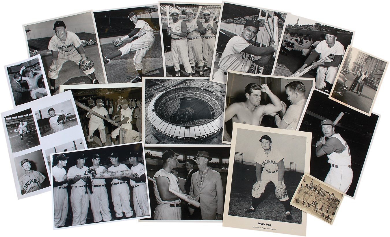 A great selection depicting Cincinnati Reds history, all of these 18 pieces are original and some originate from the personal collection of Ted Kluszewski. All but three are 8x10" and one is of Klu's batting grip and comes with a letter from his widow, Eleanor. Also included is a nice photo of Klu with Burke and Brace stamp on back. Others include Joe Nuxhall, several of Wally Post including a Burger Beer premium, Ewell Blackwell, Roy McMillan, Sparky Anderson, Frank Robinson and more. Overall in EX condition with images spanning from the 1940s up to late 1972, a period which saw the Redlegs claim four National League pennants.