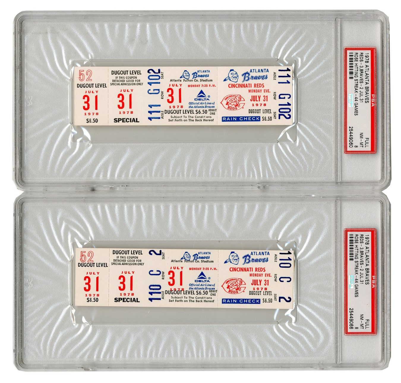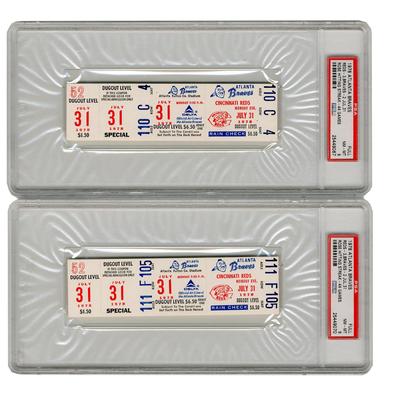 Since Joe DiMaggio made history with his 56-game hitting streak in 1941, only one Major Leaguer has even come within 15 of that vaunted record. All-time hit king Pete Rose recorded an amazing 44-game streak in 1978 that still stands as the National League standard. From that summer come these four full, unused tickets from the July 31 game vs. the Braves in Atlanta that represented the 44th and final game of the streak. Each has been graded PSA NM-MT 8. Rose took an 0-for-4 collar vs. the Braves the next night in a 16-4 loss before going 4-for-5 a day later.