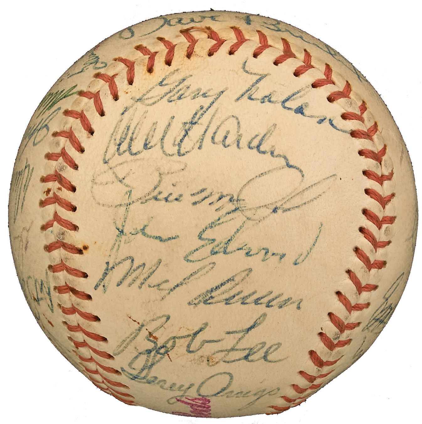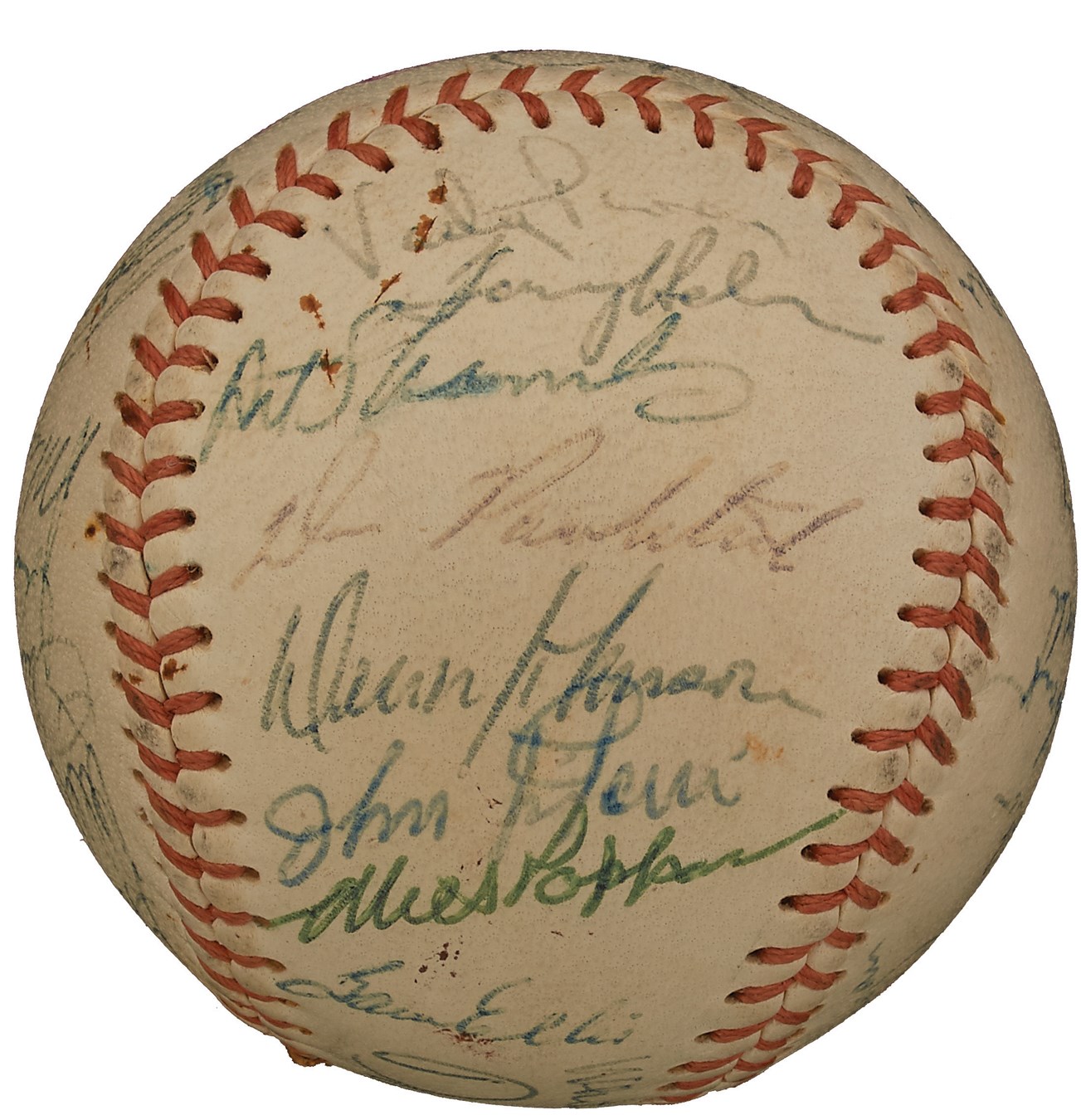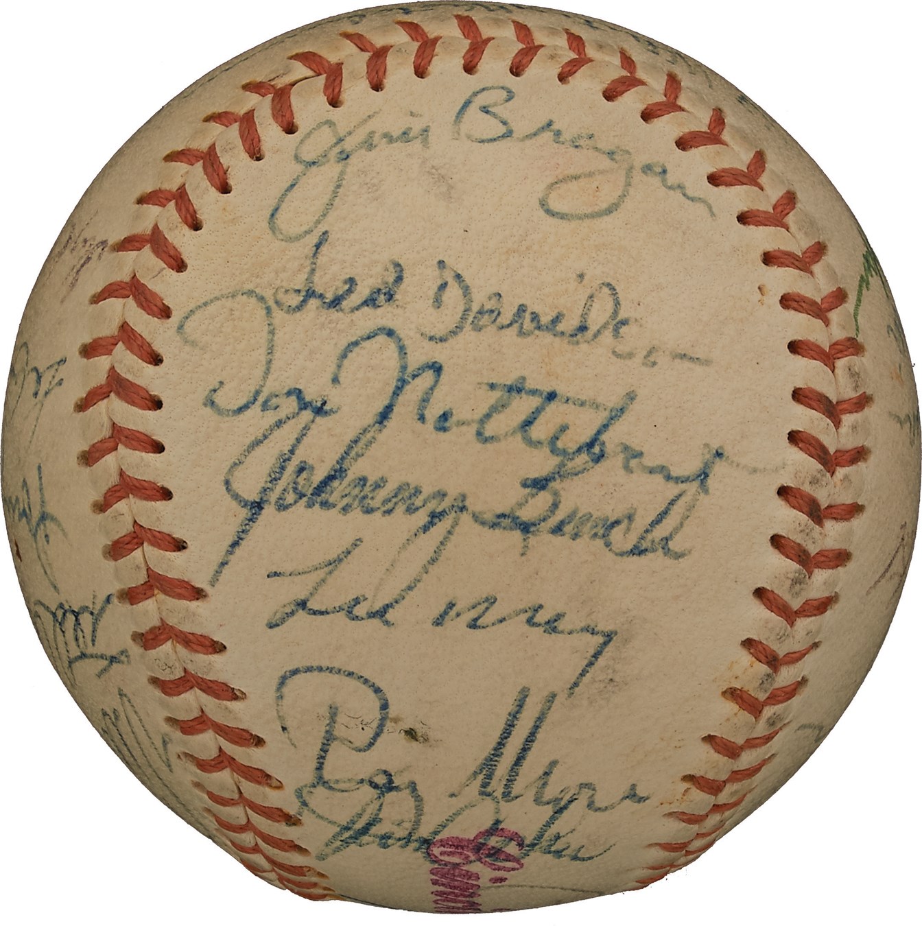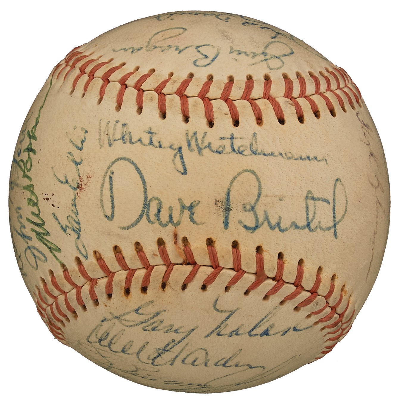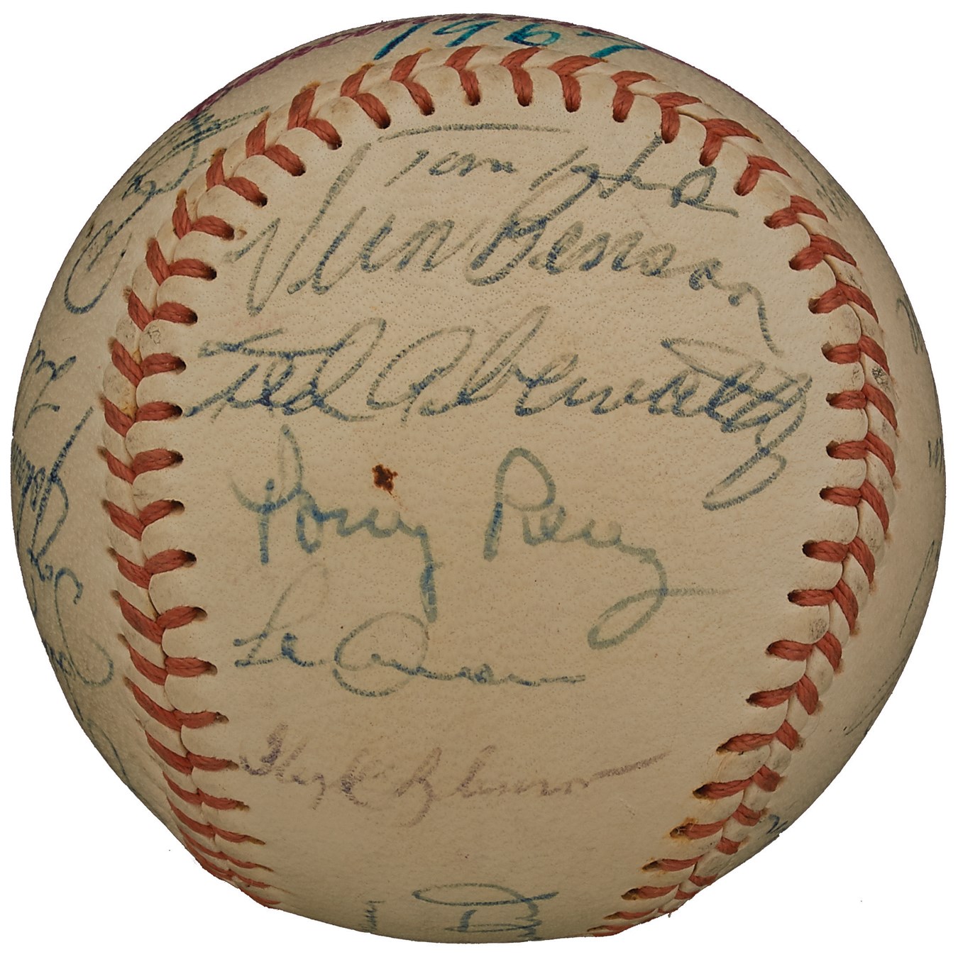 Though they finished fourth in the National League that season, the 1967 Cincinnati Reds had the seeds planted for what was to become the Big Red Machine. This Cincinnati Reds baseball is in NRMT condition with 31 signatures from that squad, averaging 7/10. Highlights include a rookie Johnny Bench, youthful Pete Rose and Tony Perez, as well as Pinson, Bristol, Nolan, and many more, with "1967" written below the Reds' stamp.