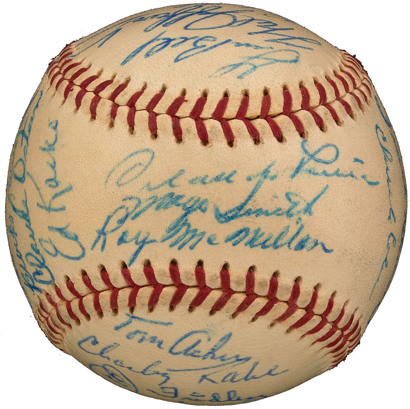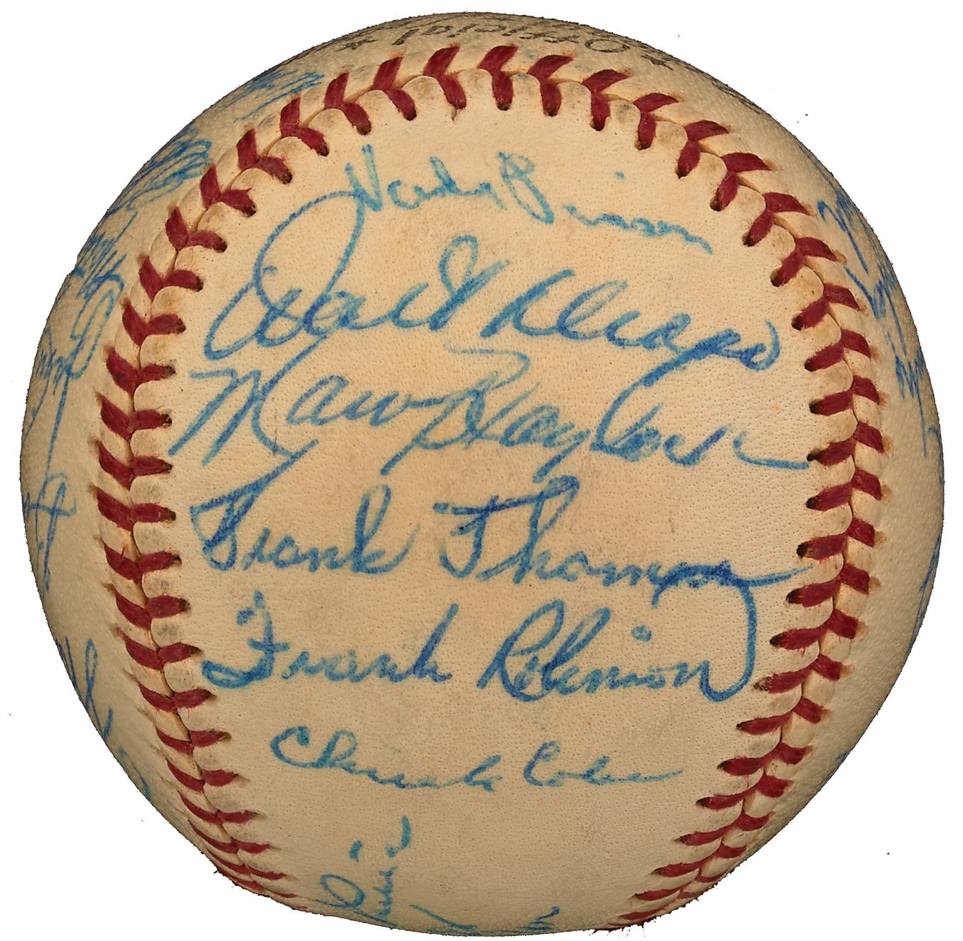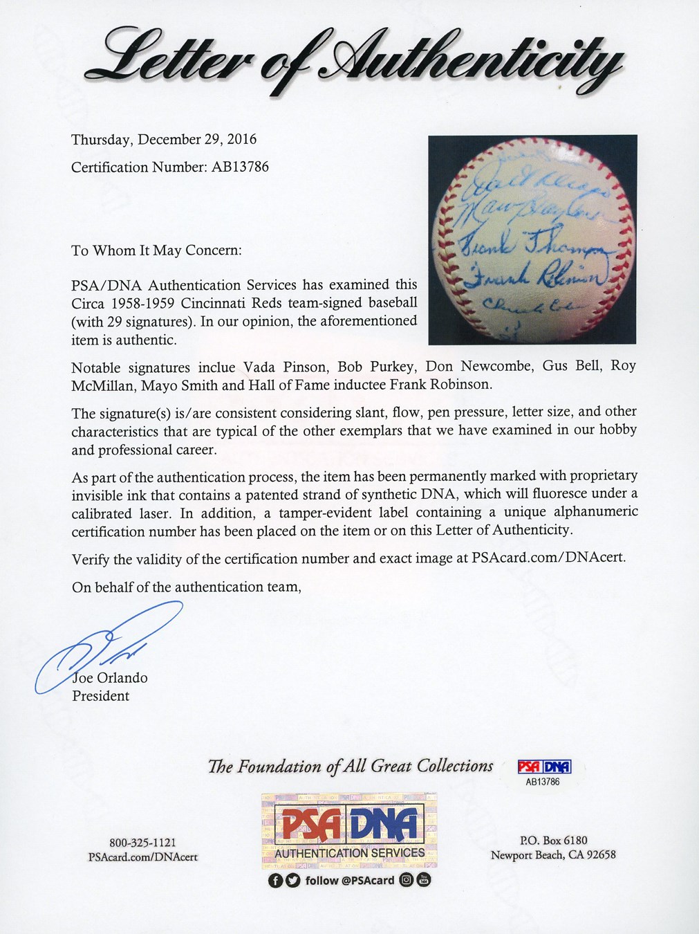 After being called the "Redlegs" in previous seasons, the 1958-59 season saw the Cincinnati team's nickname shortened to Reds from there forward. This Official National League (Giles) ball is in NRMT-MT condition and includes 29 blue ink signatures from that season, averaging 8/10 overall. Highlights include Gus Bell, Frank Robinson, Frank Thomas, McMillan, Osteen, Purkey and many more. Comes with PSA LOA.