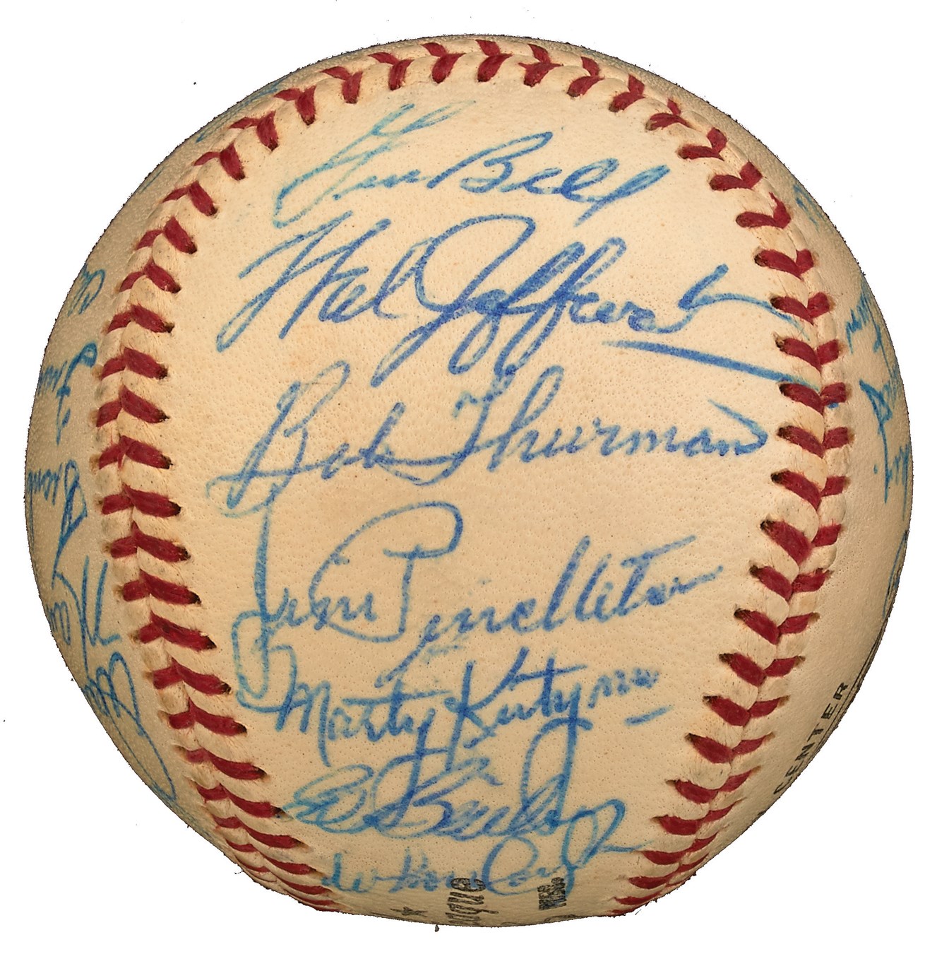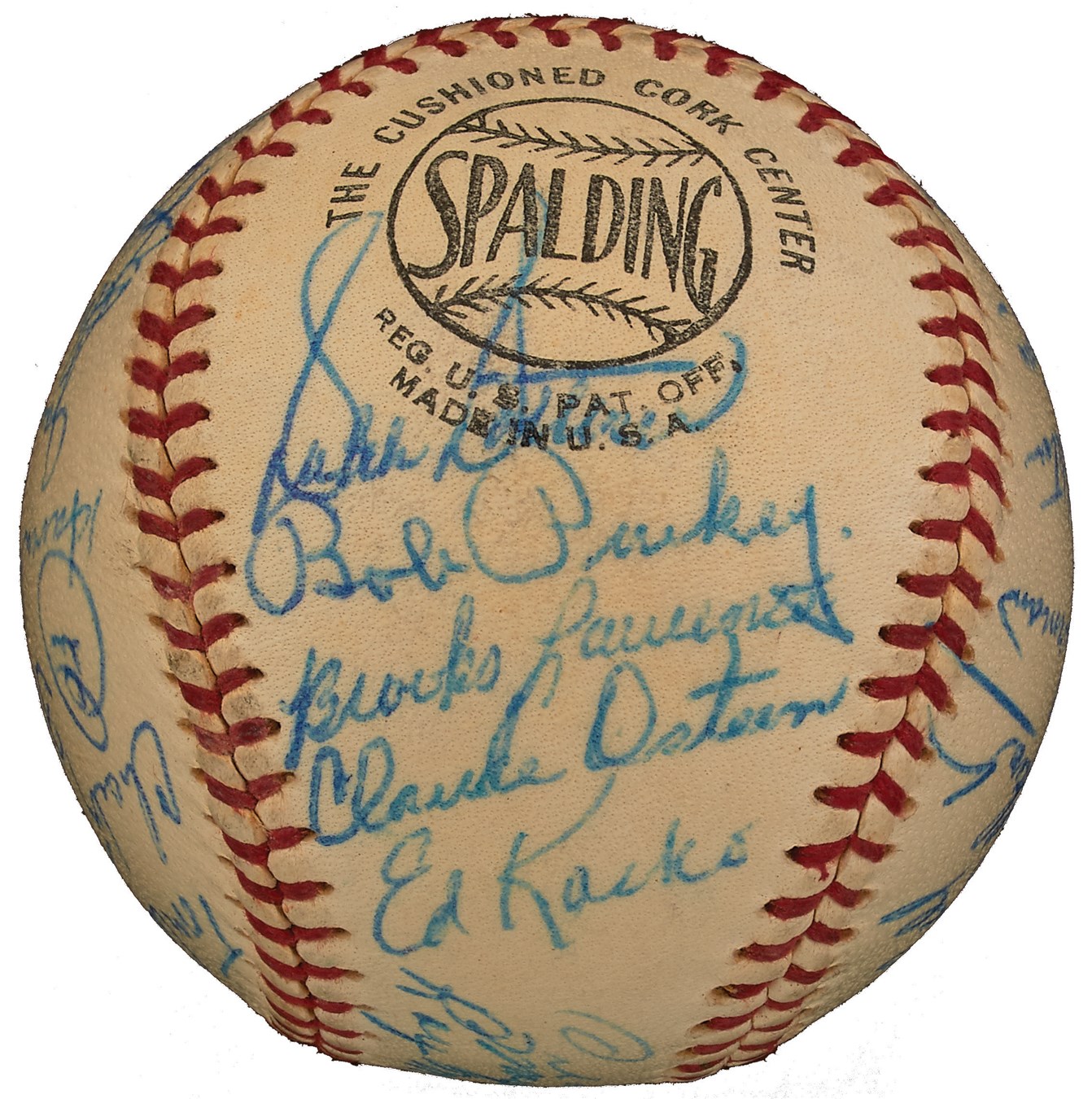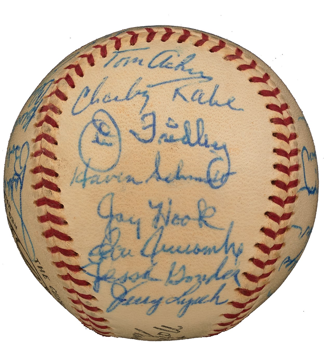 After being called the "Redlegs" in previous seasons, the 1958-59 season saw the Cincinnati team's nickname shortened to Reds from there forward. This Official National League (Giles) ball is in NRMT-MT condition and includes 29 blue ink signatures from that season, averaging 8/10 overall. Highlights include Gus Bell, Frank Robinson, Frank Thomas, McMillan, Osteen, Purkey and many more. Comes with PSA LOA.