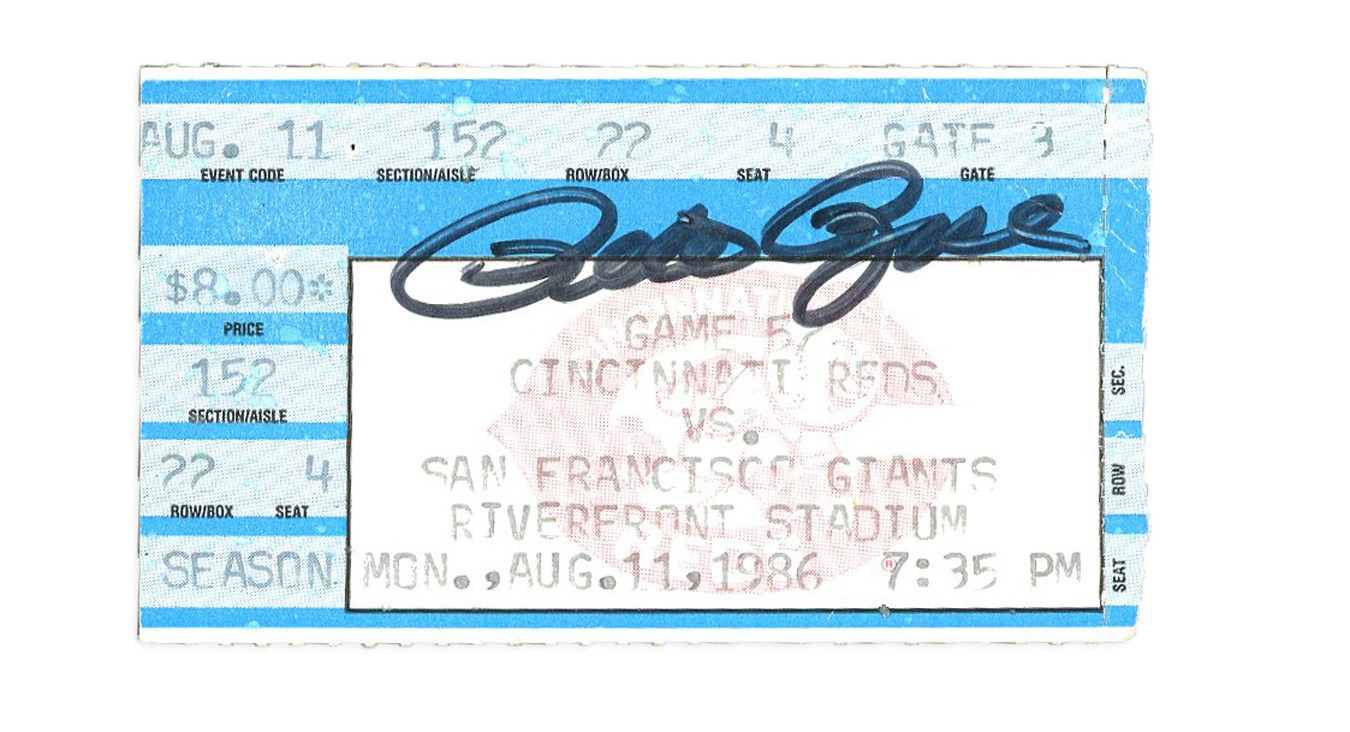 This rarity is from the eighth - and final - time that Pete Rose went 5-for-5 in a Major League game. This stub is from the August 11, 1986, game between the Cincinnati Reds and the San Francisco Giants at Riverfront Stadium, and is signed in 9/10 black Sharpie by Rose. Despite his lifetime ban from the Majors, Charlie Hustle's prolific hitting statistics and records only become more impressive as they stand the test of time.