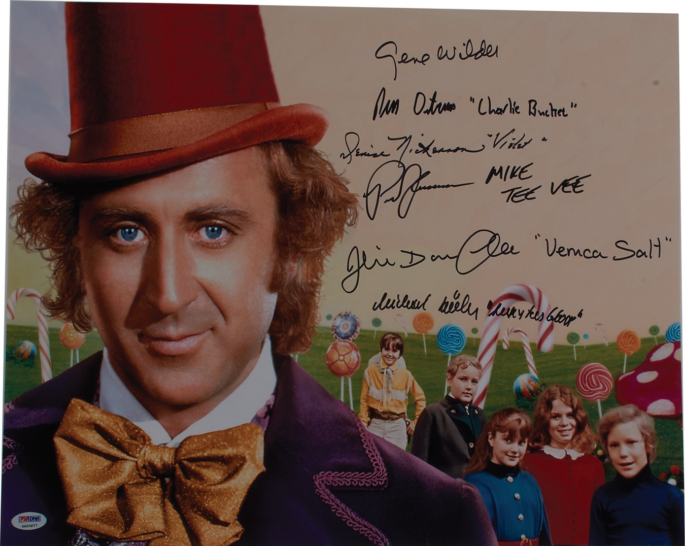 Gene Wilder is the centerpiece as the legendary Willy Wonka in this colorful 16x20" compilation photo, which includes the five children granted the tour of his cinematic Chocolate Factory. Wilder and each of the five have signed in black Sharpie, with autographs including character names in the actor's hand: Peter Ostrum "Charile Bucket," Denise Nickerson "Violet," Paris Themmen "Mike Teevee," Jeri Dawn Cole "Veruca Salt," and Michael Bollner "Augustus Gloop." Includes PSA/DNA authentication, and all except Bollner were signed in the presence of a PSA representative.