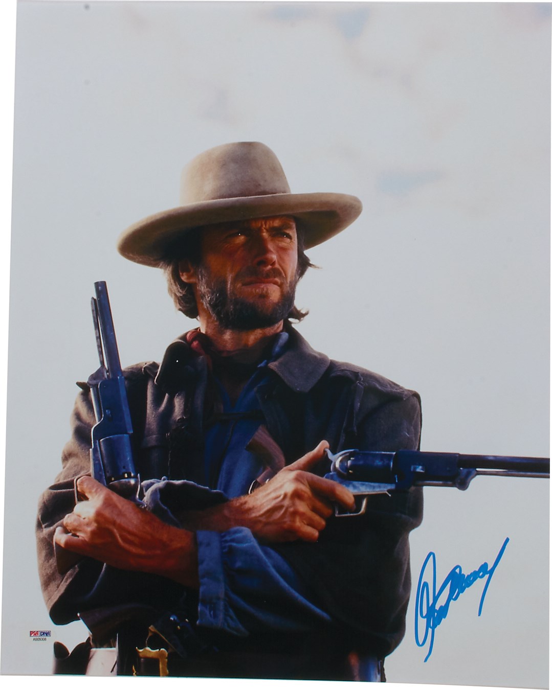 Clint Eastwood is at his gunslinging best in this marvelous 16x20" photo taken from his 1976 film, "The Outlaw Josey Wales." With a Colt revolver in each hand, Eastwood stands tall as the title character and he added a crisp signature in blue marker in the bottom right corner. Perfect for framing and display, includes PSA registration number authenticating the signature.