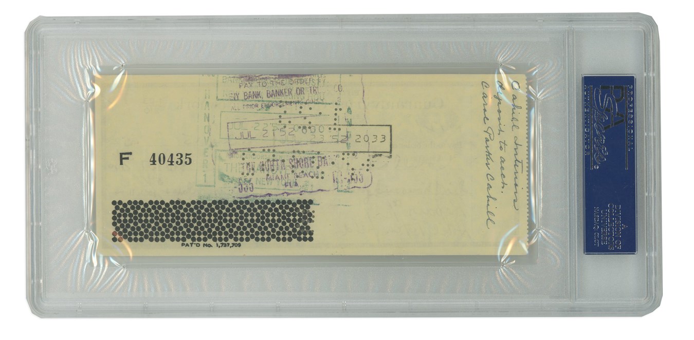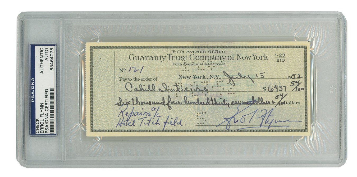 Hollywood swashbuckler Errol Flynn made his mark in romantic films of the 1930s through the '50s, and this personal check was signed by the star performer. Dated July 15, 1952, it is signed by Flynn in Blue pen and made out to Cahill Interiors in the substantial amount of $6,497.54 and noted as "Repairs a/c Hotal Titch Field," apparently also in Flynn's hand. Encapsulated by PSA/DNA as authentic.