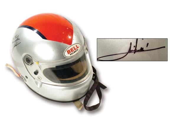 The fastest helmet in this auction. "Bell" brand helmet once protected the head of the racing world's best known driver. Strong wear evident, with "Andretti" in silver stickers on back, clipped air hose below right ear and interior padding brown with sweat from the stress and heat of high-speed racing. Size 7 1/8 sticker inside. From Paul Hill collection, with "To Paul, Best Wishes, Mario Andretti" inscription in 10/10 black sharpie to round out the package.