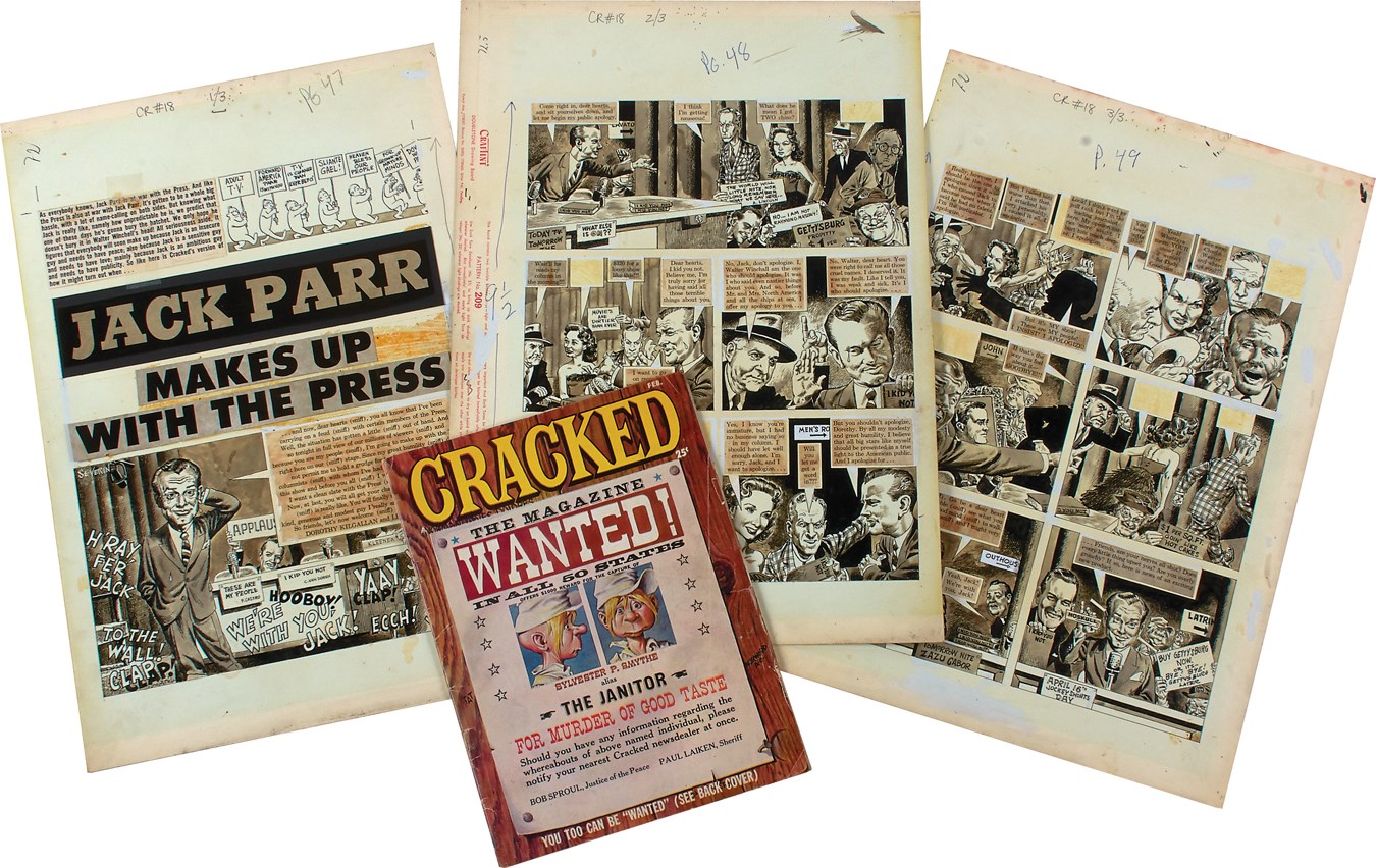 Six years after Mad Magazine broke ground in the realm of monthly satire magazines, Cracked hit the newsstands and thrived for nearly half a century with wit and wackiness. Here's some early art from Sol Brodsky's brainchild from 1961 featuring great pen and ink, and featuring a satire of the Jack Parr Show after his notable war with the media. Some of the captions are missing but the three pages are vintage. The lot also includes an original copy of issue #18, in which the piece runs.