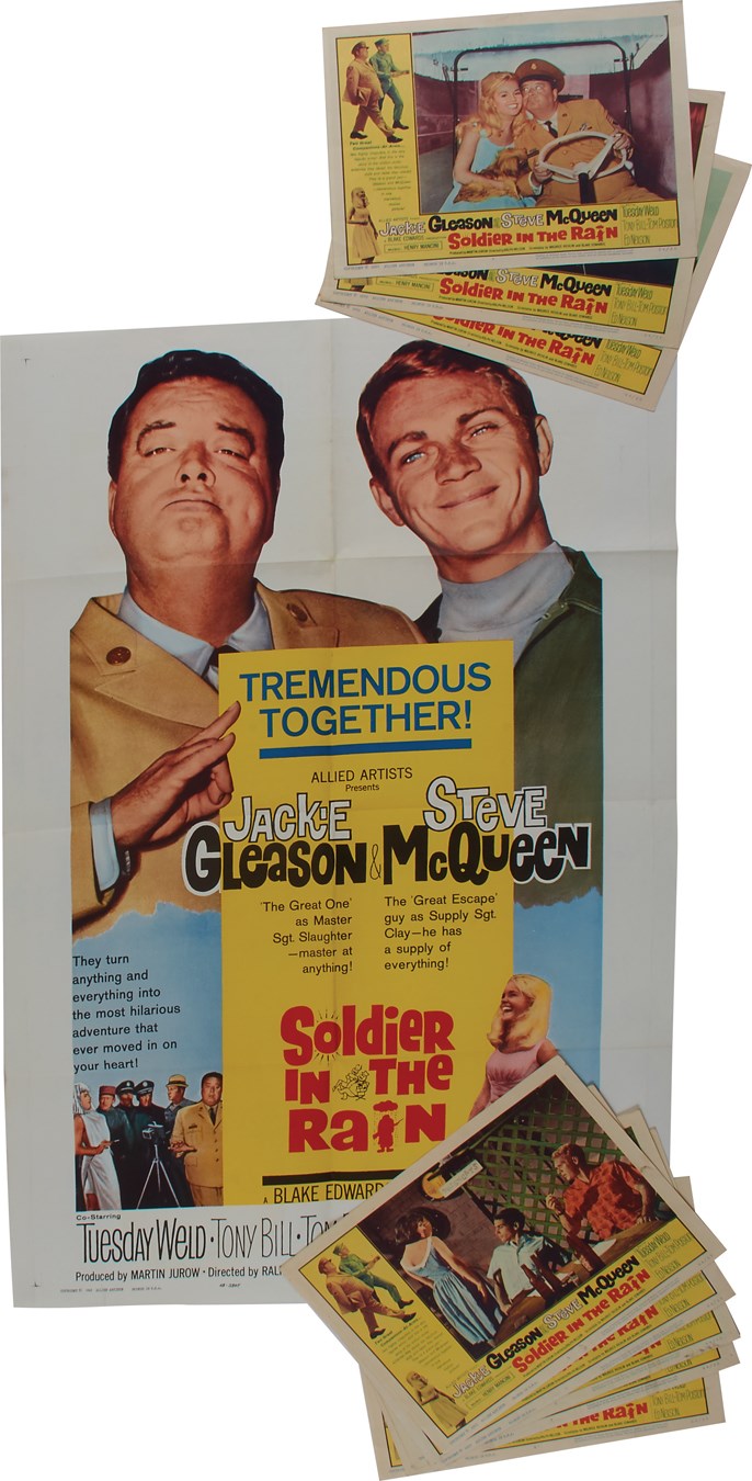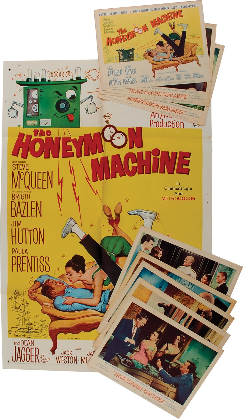 Hollywood icon Steve McQueen is featured in this lot that highlights a pair of films from the prime of his career. The Honeymoon Machine, one of his rare comedies, was released in 1961 and Soldier in the Rain came out in 1963, both following the success of his first star vehicle, The Magnificent Seven, in 1960. Soldier in the Rain had the added bonus of co-starring Jackie Gleason, no stranger to either big or small screen. This lot contains a 27x41" 1-sheet poster for each, along with a rare matching number complete set of eight Lobby Cards corresponding to each the two films. These rare items are a challenge to come by in any condition, but these items are a true treasure with condition ranging from EX-MT.