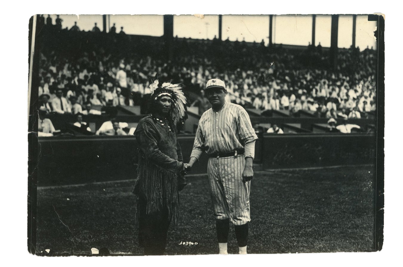 This rarity is a Type I photo of Babe Ruth pictured with person in Native American garb serving as "mascot" for Cleveland Indians. The verso contains a handwritten "Ruth" on back in pencil and no other markings, with the numbers "303960" at bottom of the 7x5" photo on front. While there is vintage wear on the edges with some creasing and a few minor paper loss spots near bottom left, the photo rates otherwise in VG-EX condition.