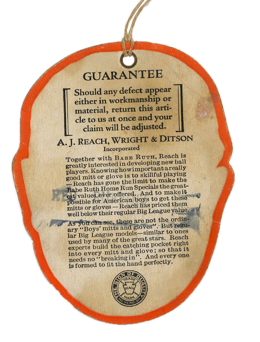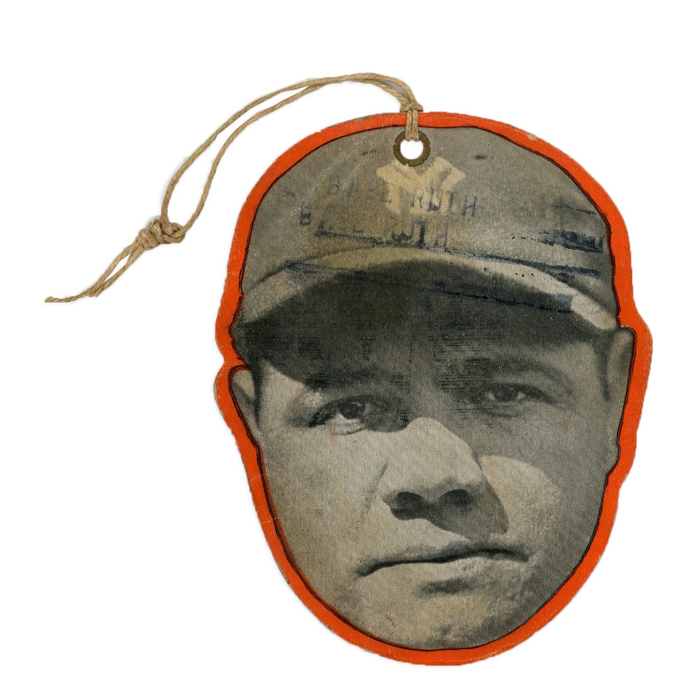 You can tie it to your suitcase, or even hang it on your Christmas tree if you like; Babe Ruth's head comprises this die-cut equipment tag from the A.J. Reach, Wright and Ditson sporting goods company out of Boston, complete with original tie string. The Bambino's head, with orange outline, measures roughly 3.5x4" and features disclaimer copy on the reverse. This is the only such item known to exist, with some stamping marks on his cap.