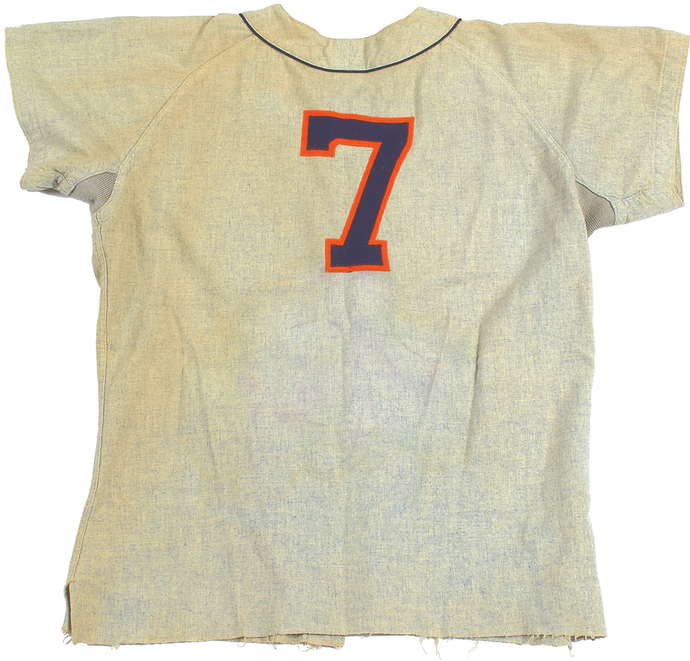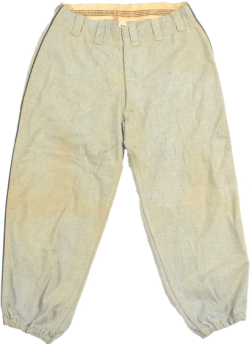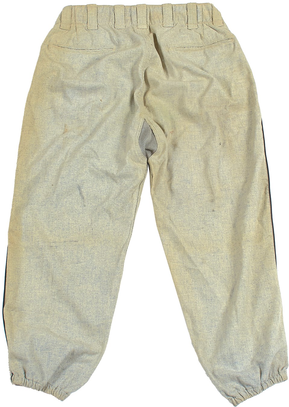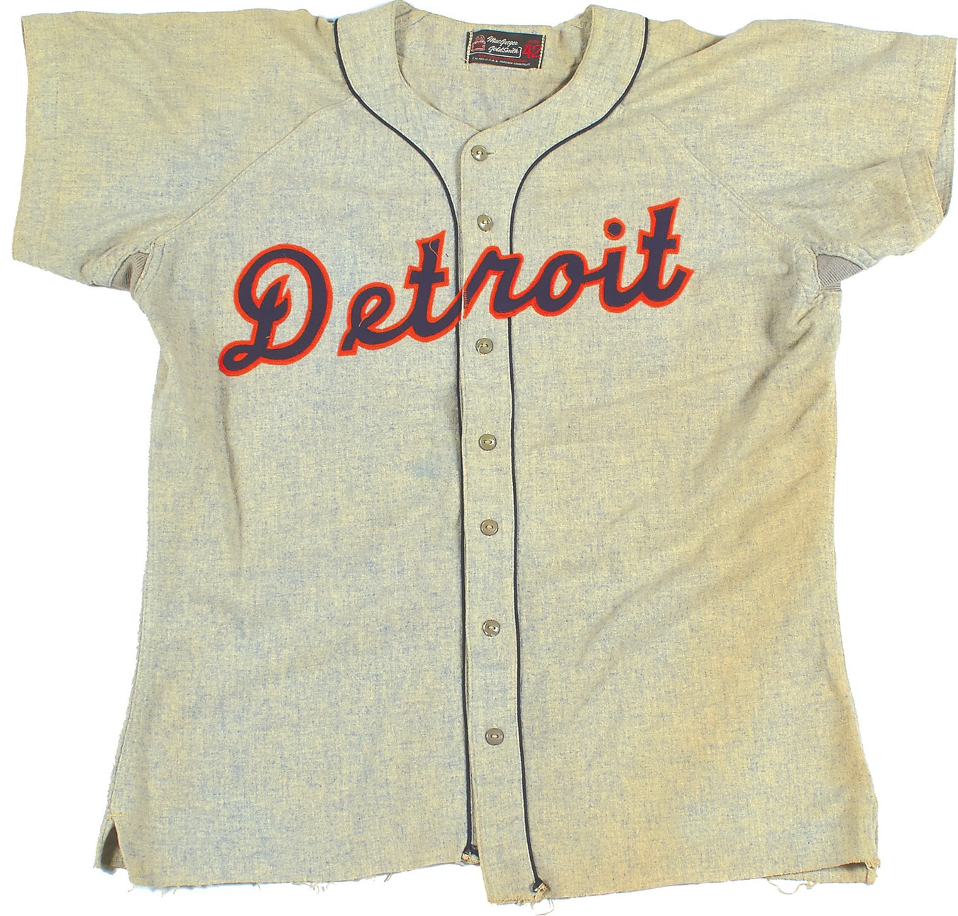 A pair of lifetime .300 hitters donned this beautiful wool road Detroit Tigers uniform, whose distinct style began in 1952. It was also the last year for the style of MacGregor Goldsmith tagging found in the collar of the jersey, thus, both the jersey and pants are from 1952, the last season Hall of Fame third baseman George Kell played with the club, albeit partially. After he was traded to the Red Sox the first week of June, Johnny Pesky took the number 7, thus it is possible that the fellow infielder also wore this uniform. The jersey is a size 42 and both players were about the same size. It contains the all-original "Detroit" on the front in black on orange felt and all-original number "7" on the back in black on orange felt. The jersey is graded an 8 by MEARS with one point deducted for a trimmed tail and one point deducted for some minor stains. Comes with matching pants that have a MacGregor Goldsmith size 36 tag in the waist along with "7" sewn on a swatch. Both the jersey and pants show nice, consistent use.