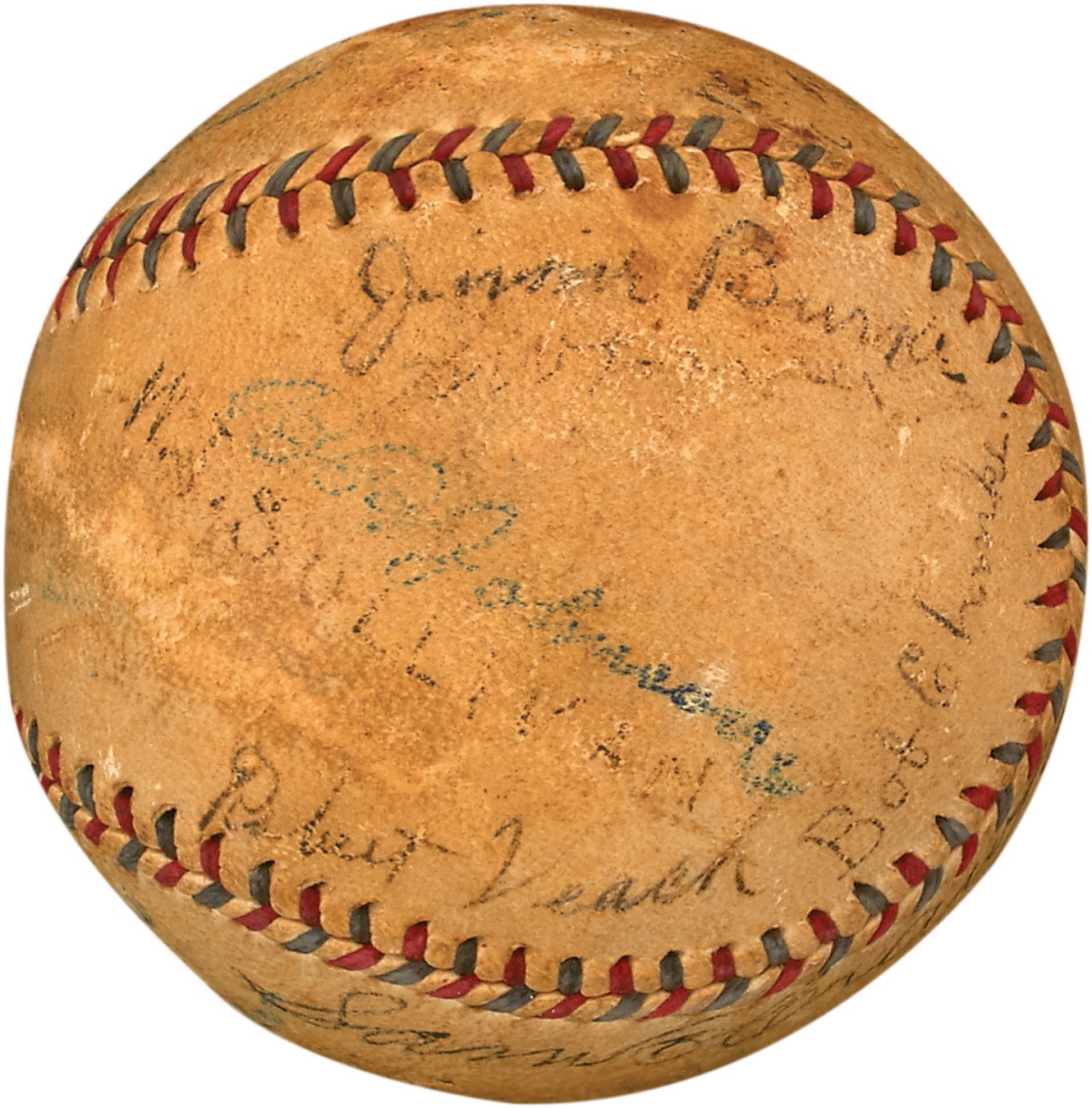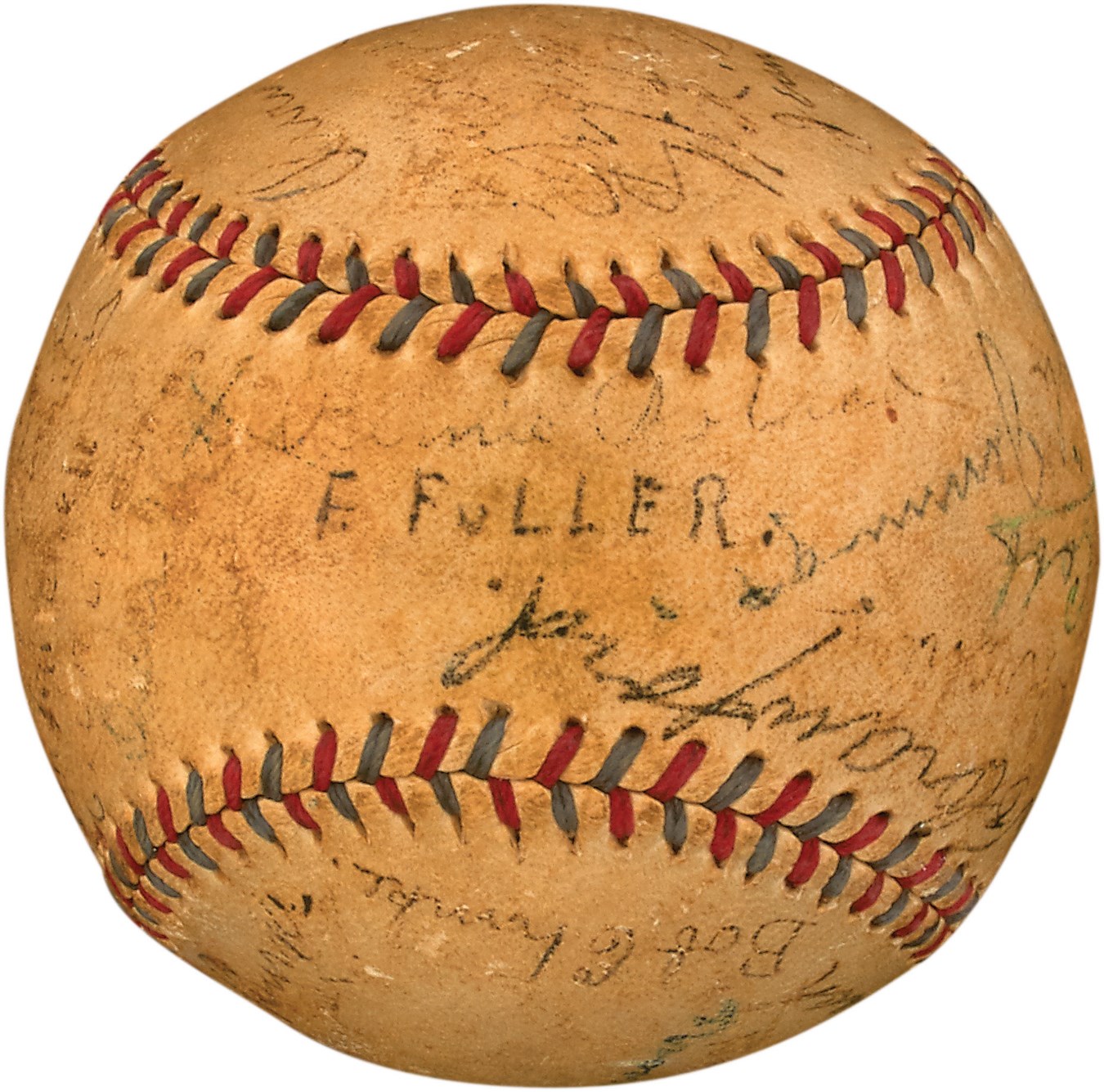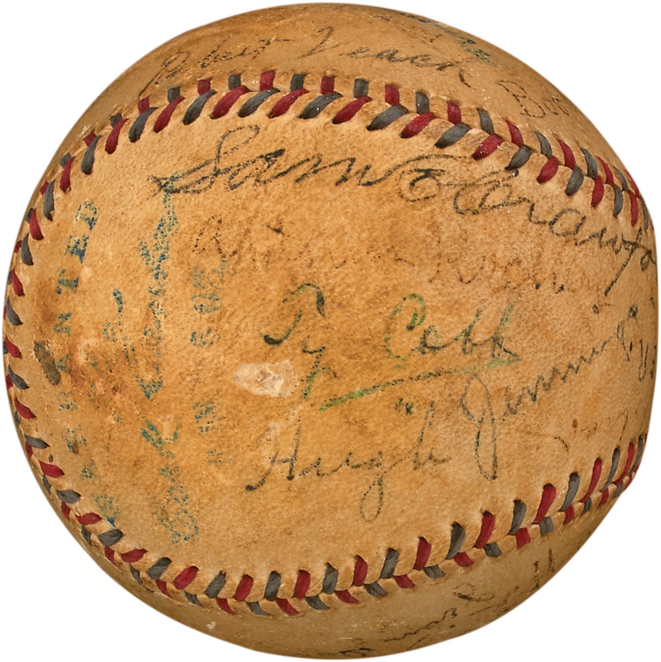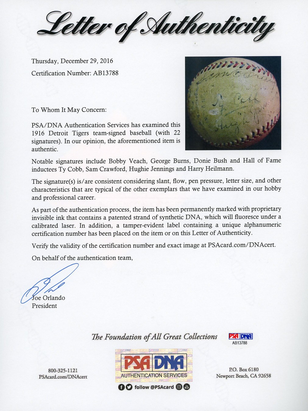 One of the earliest team-signed baseballs that we have handled, this super rare offering from the 1916 Detroit Tigers is on an Official American League (Johnson) baseball, which is in Very Good condition. It has about 20 signatures, some are faded and hard to read, others are still very visible. One panel is of particular note with Sam Crawford (7/10), Ty Cobb (6/10) and Hugh Jennings (6/10), while others include Bobby Veach, Owen Bush, Oscar Vitt, Billy Sullivan, and more. Comes with PSA LOA.