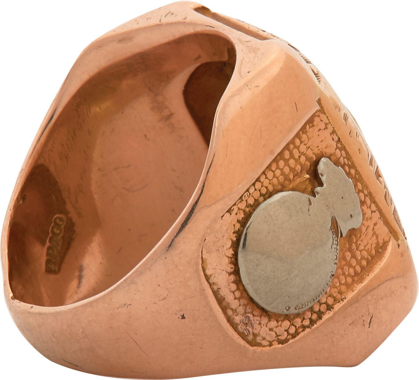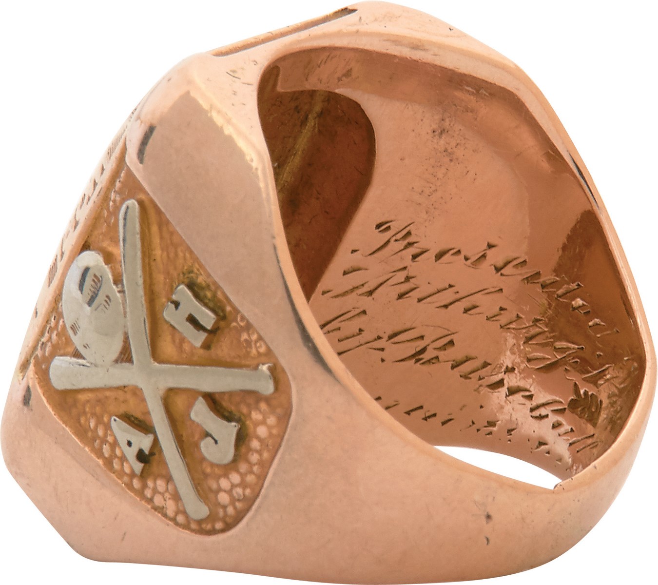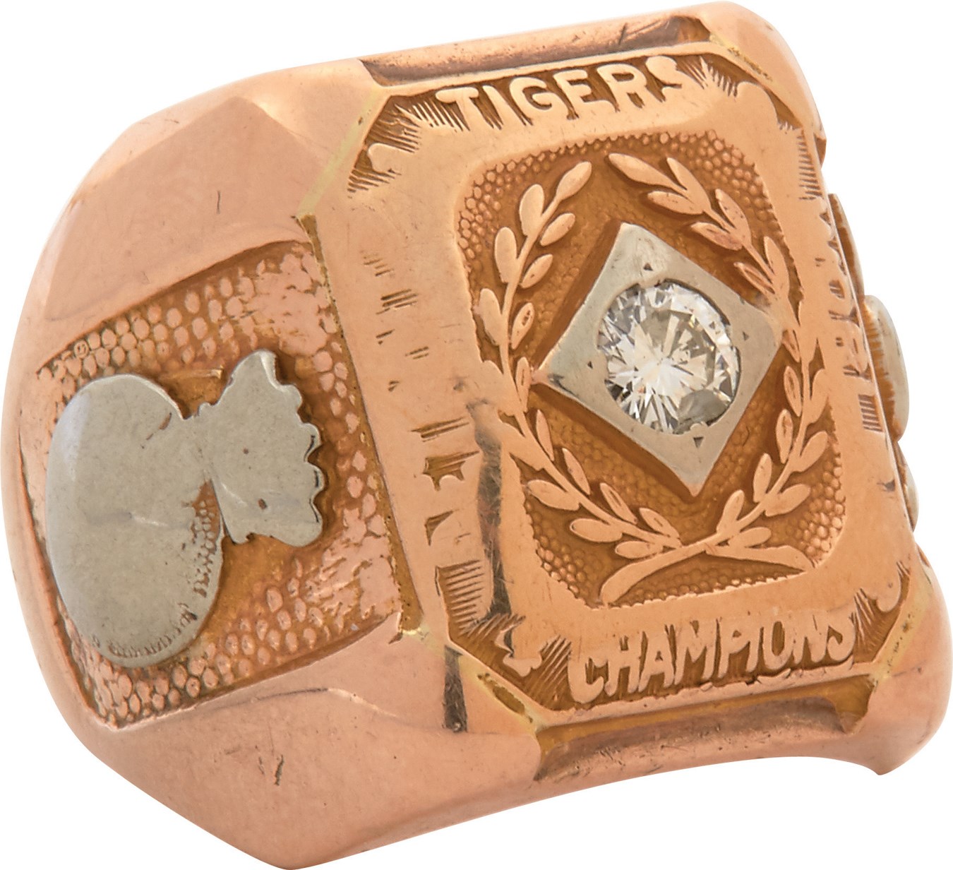 Though he was all of 17 years of age, World War II and pitching injuries conspired to see Art Houtteman signed by the Detroit Tigers and appear in 13 games during the 1945 season. That Detroit team went on to capture the American League Championship as well as the World Series, and offered here is a very rare championship ring, which was cherished and worn by Houtteman. It shows wear and the condition is about 5/10, the inside is stamped 10K and engraved "Presented to Arthur J. Houtteman by Baseball Commissioner," though some of the engraving is worn. The top of ring has a real diamond with the wording "Detroit Tigers World Champions" around the edge, on one shank is the initials "AJH" along with crossed bats and a ball and on the other is a silver globe with flag on top - this side is very worn. Still it is difficult to find a keepsake of this magnitude in any condition. Houtteman would go on to play 12 seasons, and was an All-Star in 1950.