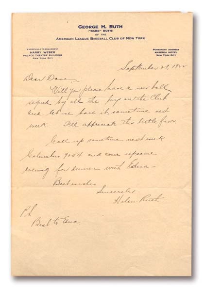 The Babe’s first wife was not comfortable with the public lifestyle the Babe loved, instead choosing to stay home and care for their adopted daughter Dorothy. So she was away from the Babe when a fire rushed through their home and ended her life in 1929. Exceptionally rare handwritten letter refrences obtaining a team signed baseball on “George H. Ruth” letterhead, is entirely in Helen’s hand, and signed in perfect ink at the close. Page is age-toned but otherwise very strong, with original mailing folds.