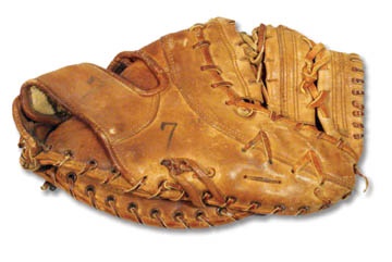 Rawlings glove is begot from his very last game as a professional baseball player. With 512 HRs, Eddie Matthews was elected to the Hall of Fame in 1978, as the greatest hitting 3rd baseman the world had ever known. He is the only player in the Braves' franchise history to wear the Braves uniform in all three sites (Boston, Milwaukee, & Atlanta) over his 15-year span. They retired Eddie's #41 in 1967. This first baseman's glove was worn during his days in Detroit ('67-'68), where he closed out his spectacular career. "Mathews" in faded black marker across pinky. His #"7" (with Detroit) appears on the heel of the thumb and strap over back of hand. As you can see, this glove saw a lot of action, heavy use! Heart Hide brown leather. Obtained from the Mathews family.