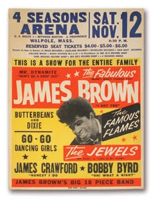 A show for the entire family - the fabulous James Brown and the Famous Flames plus Butterbenas and Dixie and Go Go Dancing Girls. The Godfather of Soul takes his show to the 4 Seasons Arena in Providence, Rhode Island. A breathtaking poster in spectacular condition, corner and edge bumps. 22 x 28".