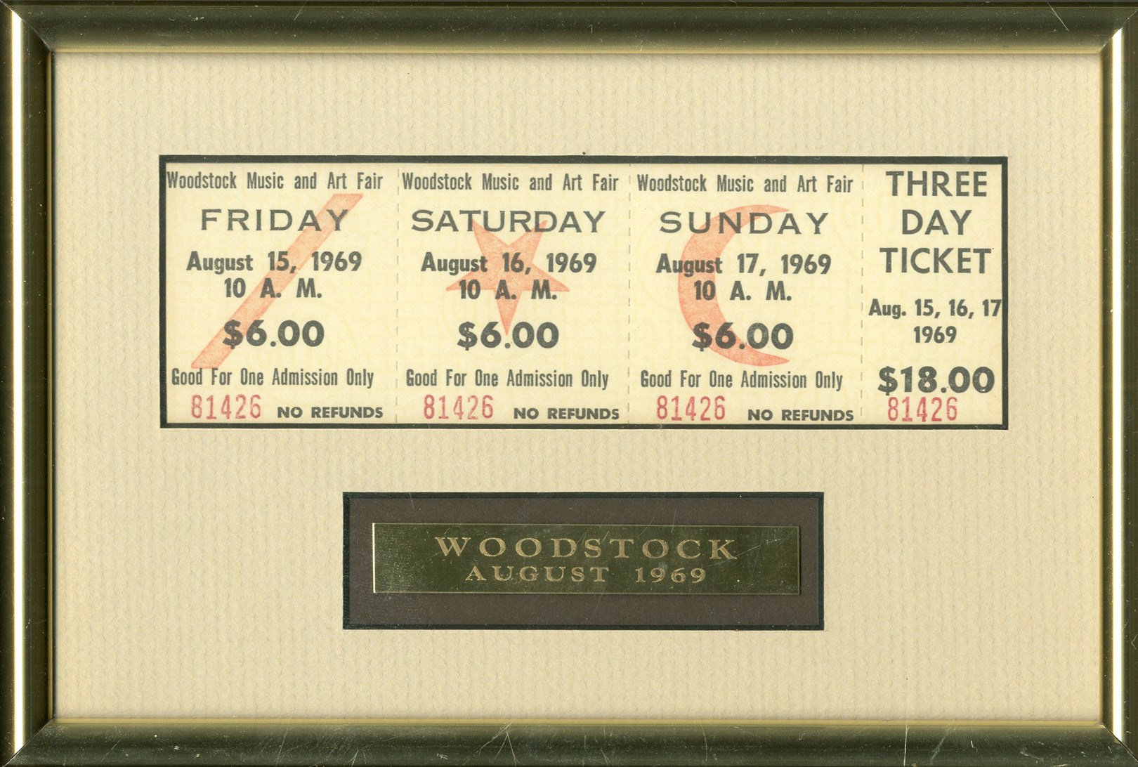Beautifully framed and matted set of unused tickets to the most iconic concert in American history, Woodstock. Held in Bethel, NY, the three-day festival proved to be a seminal moment in our nation's history and continues to define a generation. The set includes tickets for each day the concert was supposed to be held, though when all was said and done it spilled into Monday, with a plaque at the bottom that reads "WOODSTOCK, AUGUST 1969." Appears EX with light fading to the colors. All in all a gorgeous display item.