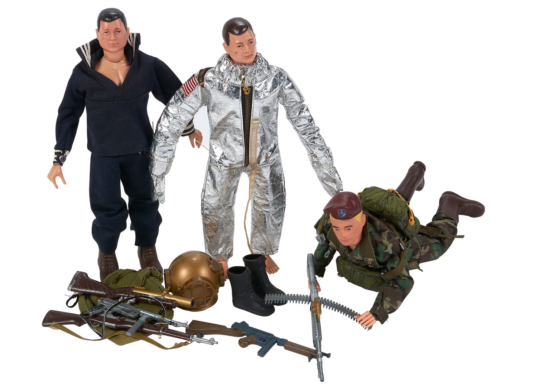 Similar to the dolls Jerry Seinfeld sneakily played with on his famous show, these three G.I. Joe action figures include some rare stuff and lots of extras such as astronaut suit, sea diver helmet, guns and backpack. All the dolls have appropriate 1964-65 marks and "TM/R Patent Pending." There are two soft-headed Joes and one with a hard head.