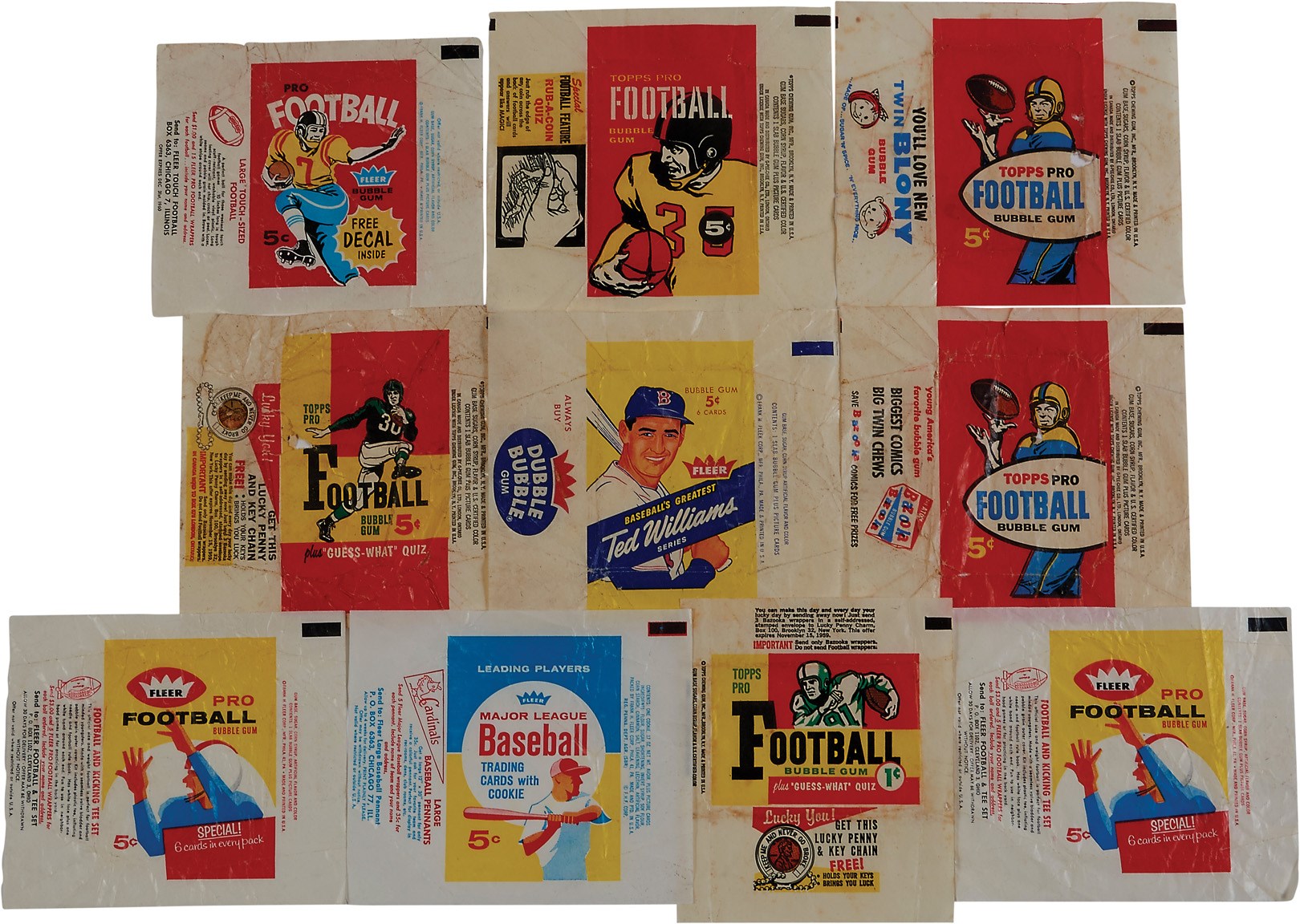 Fresh to the market group with 1959 Fleer Ted Williams 5c VG-EX. Plus Topps football: (2) 1957 Topps 5c (couple of holes), 1958 Topps 5c (nice EX+), 1959 Topps 1c (small tear EX), 1959 Topps 5c (FR-GD). Fleer football: 1960 Fleer 5c (VG), 1962 Fleer (2) 5c (EX), 1963 Fleer 5c (EX+).