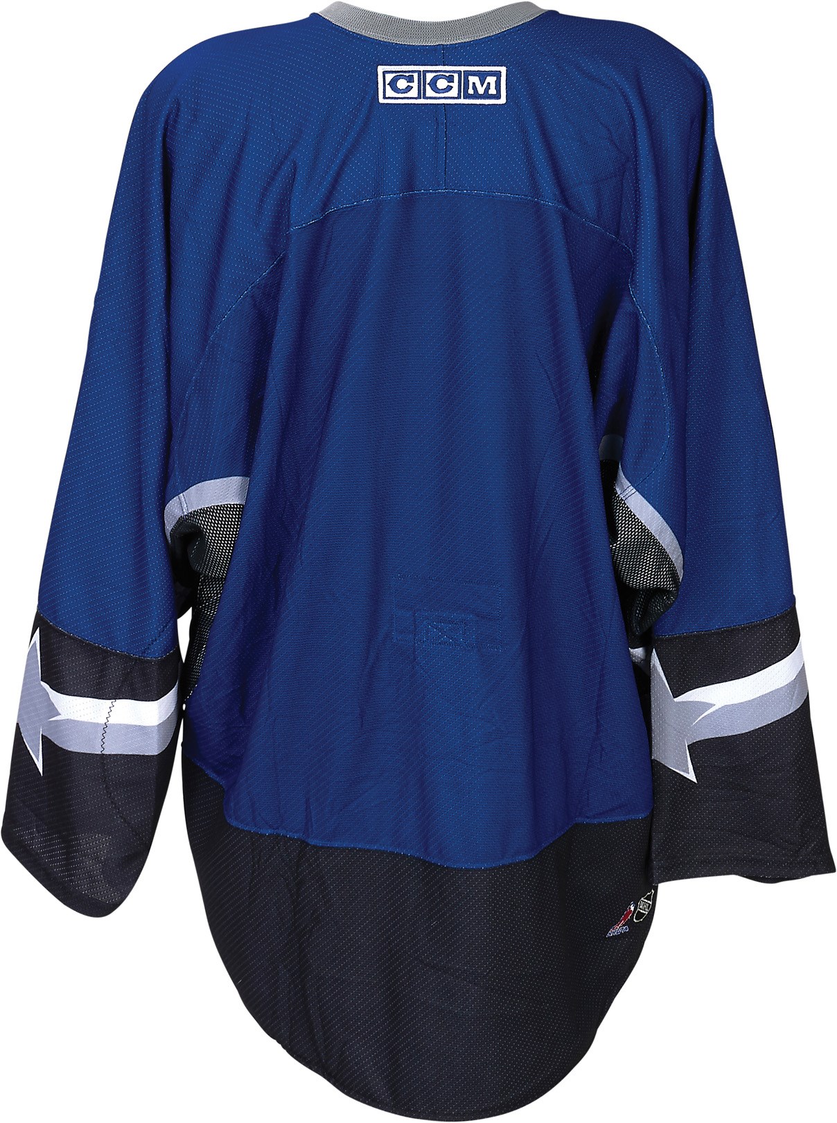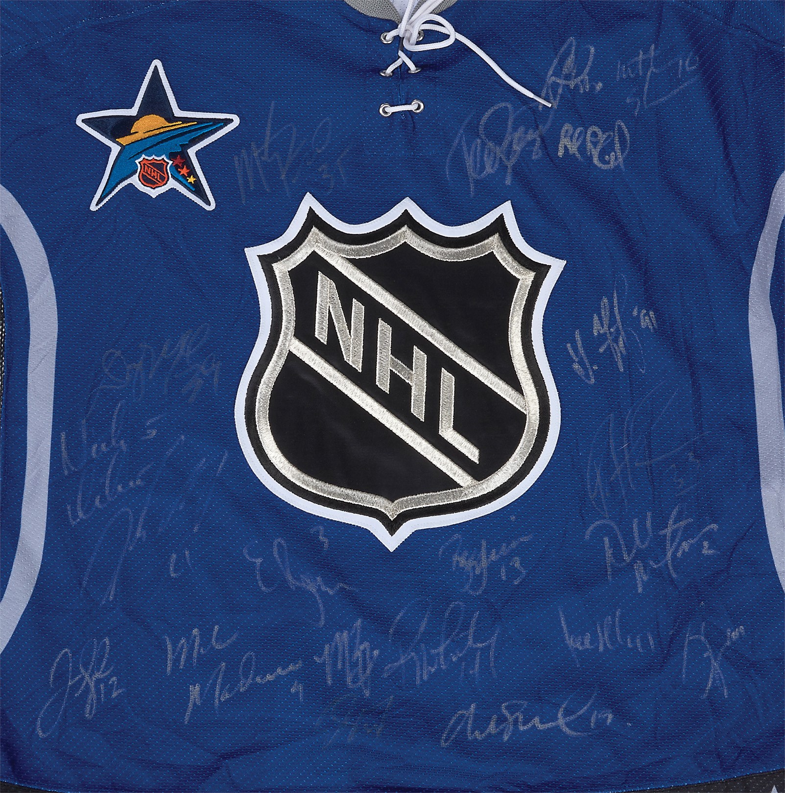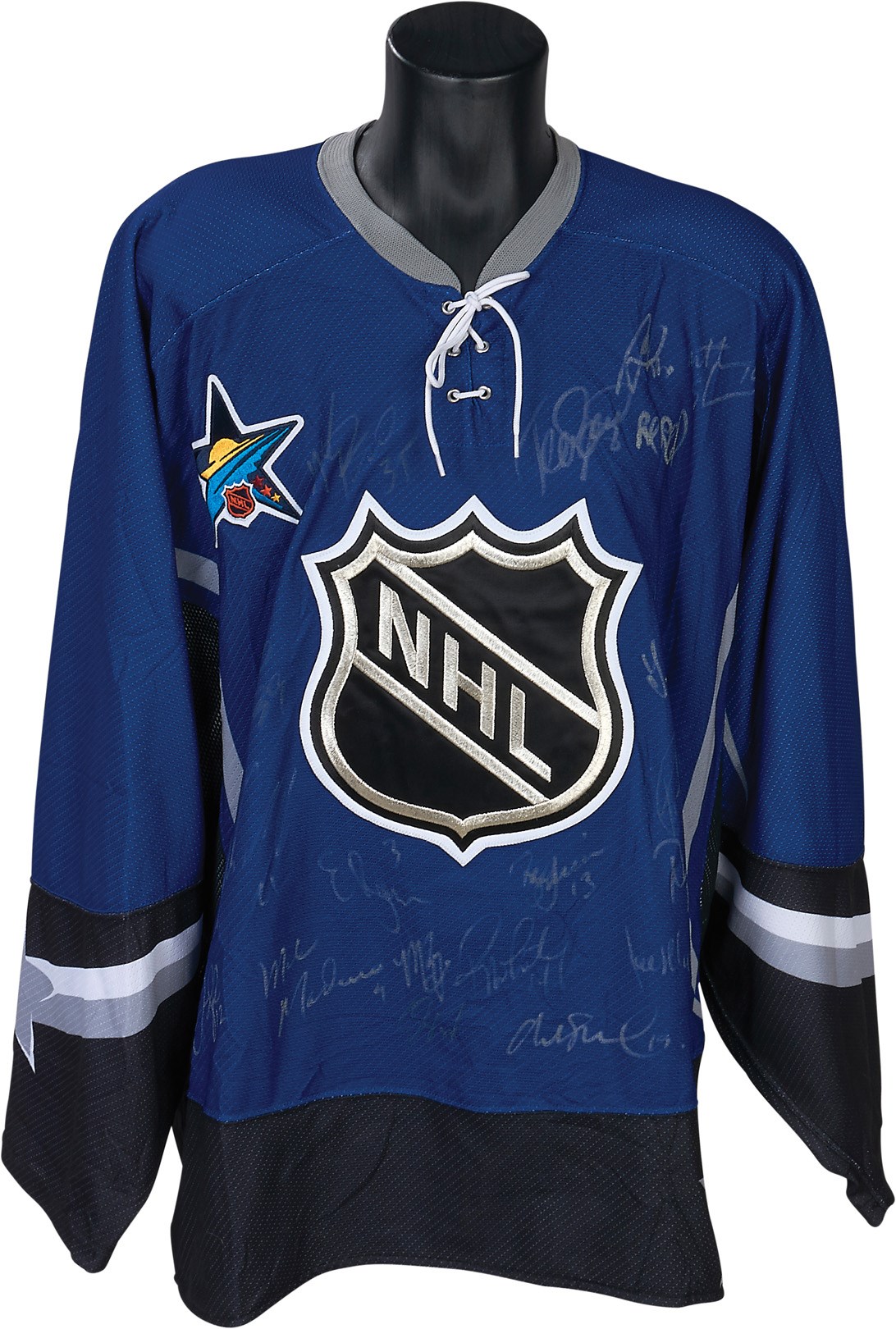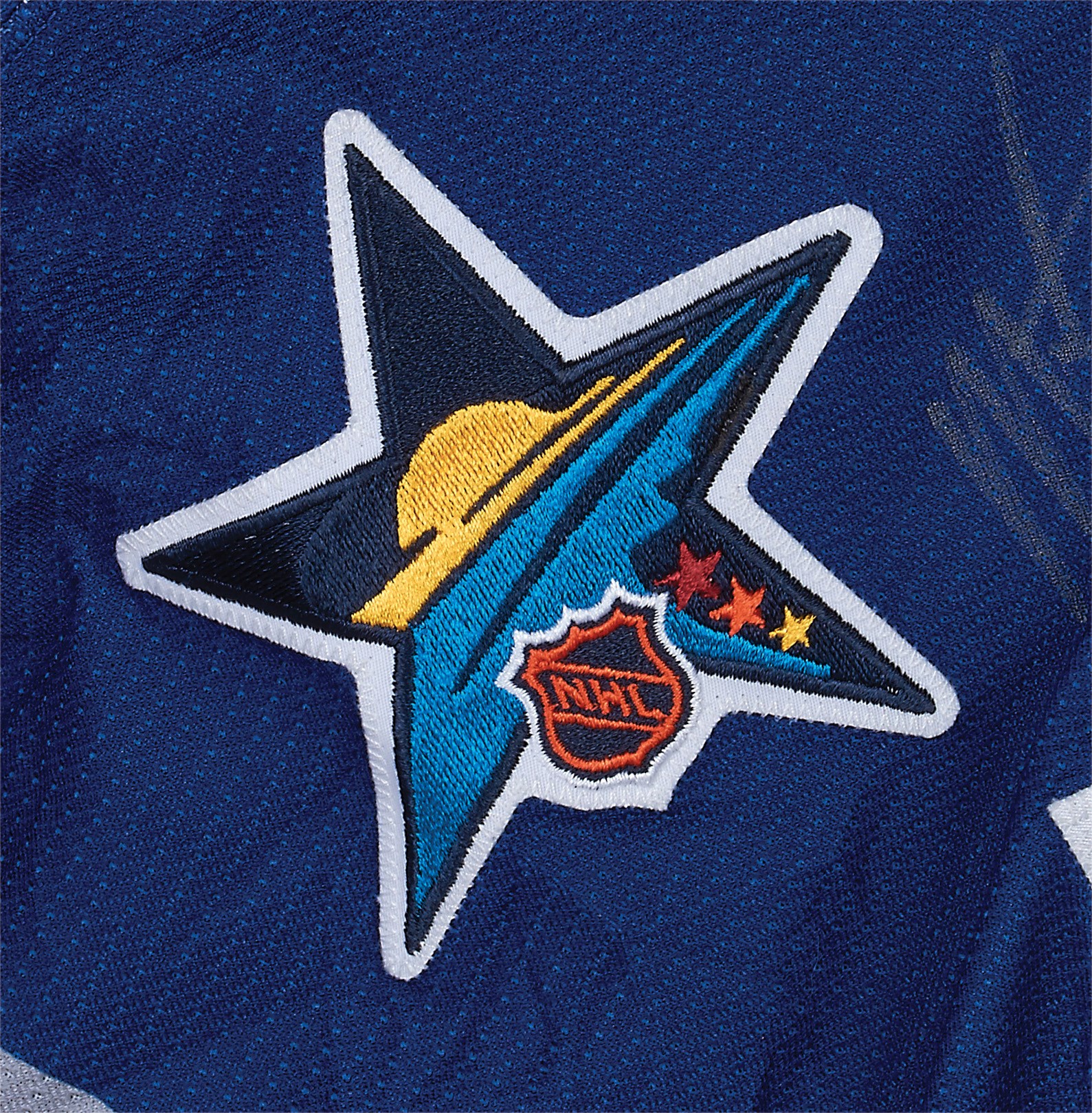 This 2002-03 signed NHL jersey comes from a powerhouse Western Conference All-Star team that beat the East in overtime of the 53rd NHL All-Star Game. The game issue jersey has not been numbered and has a size 56 tag in the collar. It features a bold NHL logo in its center with the All-Star game patch adjacent to it, and has been signed on the front by 19 players on the team in 7/10 silver Sharpie. Most notable among the distinguished signers are Mike Modano, captain of the squad, Patrick Roy, and Sergei Fedorov.