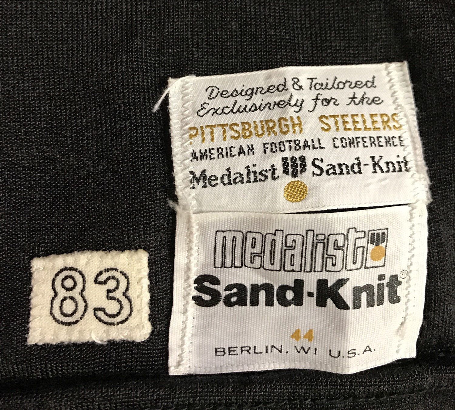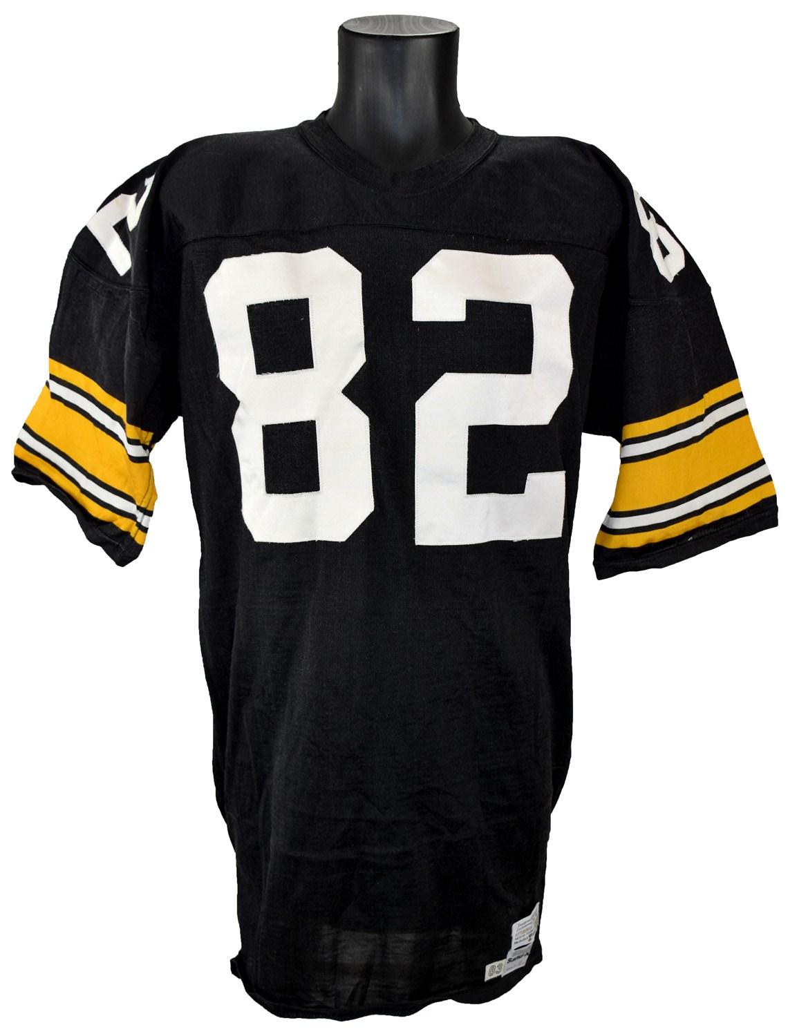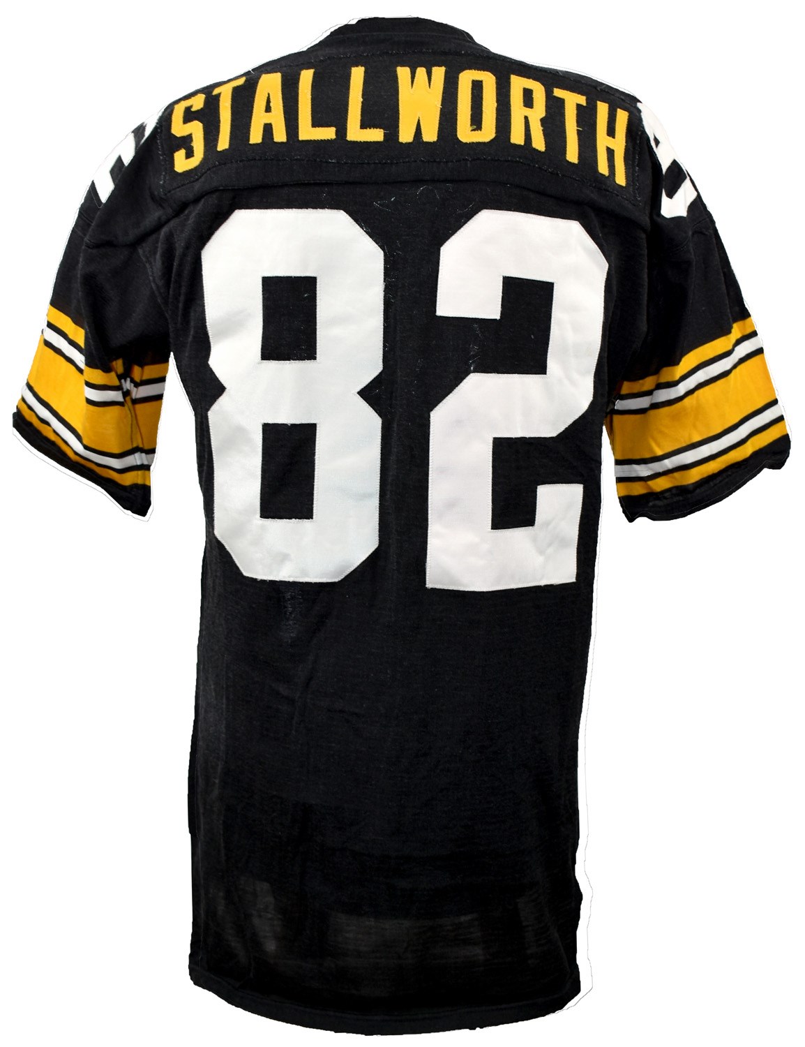 Taken in the fourth round of the 1974 NFL Draft, John Stallworth did more than just make good on the modest draft capital the Steelers spent to select him, he became one of the best players in franchise history and one of the all-time great receivers in the entire league. Stallworth, a graduate of Alabama A&M, spent a year refining his craft on the bench before being inserted into the starting lineup in his sophomore season. The reliable receiver developed quite the rapport with quarterback Terry Bradshaw, as the partnership would go on to combine for an impressive four Super Bowl victories as part of the "Steel Curtain" teams of the 1970's. Stallworth spent his entire 14-year career in Pittsburgh, accumulating gaudy totals of 537 receptions, 8723 receiving yards, and 63 touchdown receptions. He was named to the Pro Bowl three times and was inducted into the Pro Football Hall of Fame in 2002. This classic Steelers black, home jersey was game worn by Stallworth during the 1983 season. The jersey features "STALLWORTH" sewn in gold lettering on a black name plate on the back, while his number "82" appears stitched in white on the front, back, and both shoulders. A Medalist Sand-Knit tag can be found on the tail, denoting the jersey's size as 44, with an adjacent "83" tag representing the year it was made. Some pilling is present, as well as a few team repairs, but the jersey remains a fantastic piece of Steelers memorabilia. All jerseys come directly from the Steelers archive and come with a letter from the Steelers.