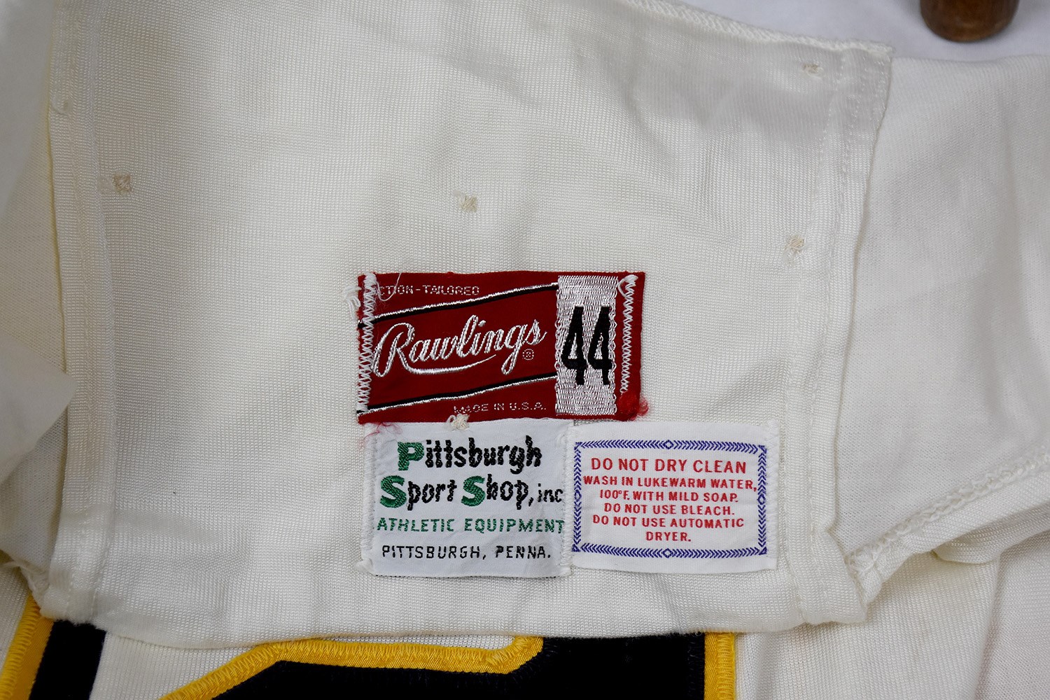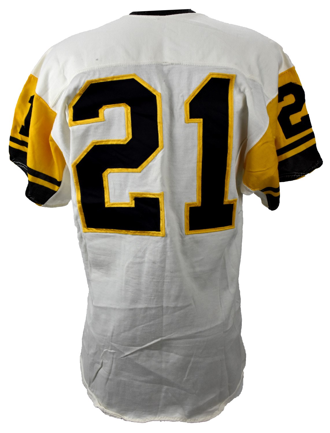 This fantastic, game-worn jersey belonged to Jim Bradshaw, who played safety for the Steelers for five seasons during the mid 1960's. This simple yet elegant early style was worn by the team from 1962 to 1965, and features a white jersey with the Steelers classic black and gold accents. Bradshaw's number "21" is stitched on the front and back in bold black lettering with gold trim, and can also be found on both shoulders. A Rawlings size 44 tag appears in the front tail along with a Pittsburgh Sport Shop tag. The jersey has custom shortened sleeves, while the body has also been shortened. It has seen nice use with a tear at the left sleeve and some pilling inside. All jerseys come directly from the Steelers archive and come with an LOA from the Steelers.
