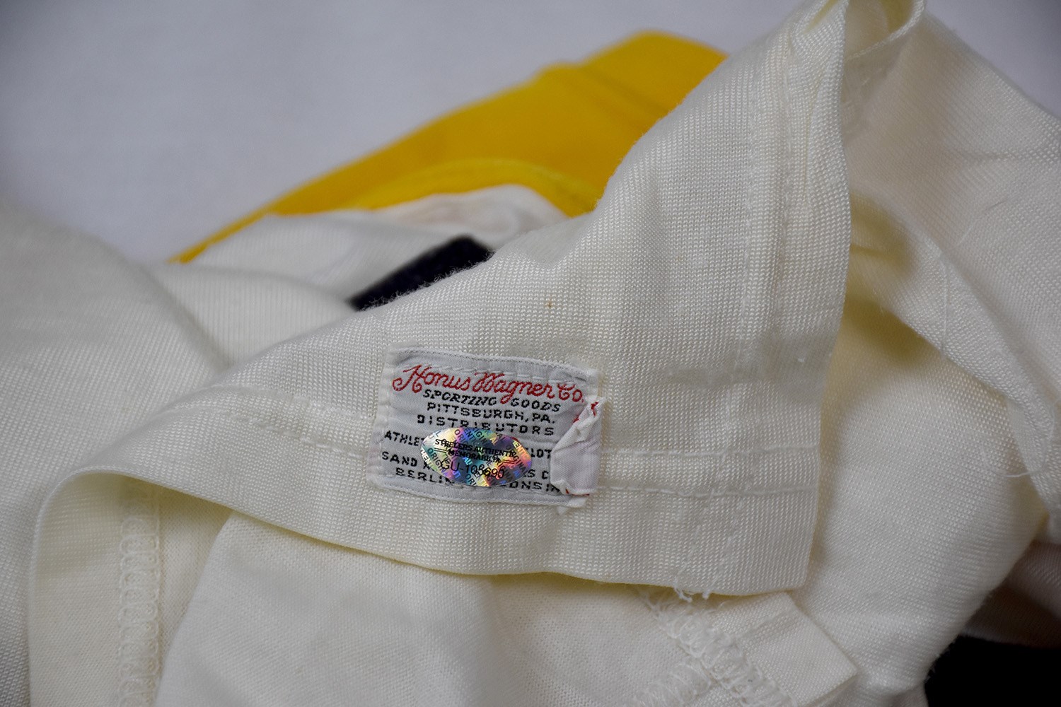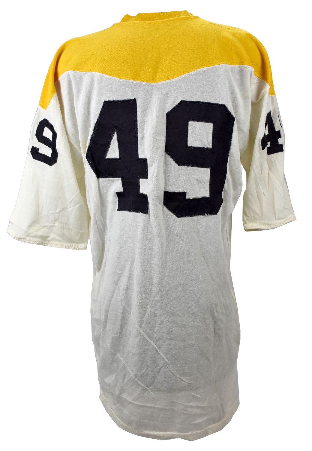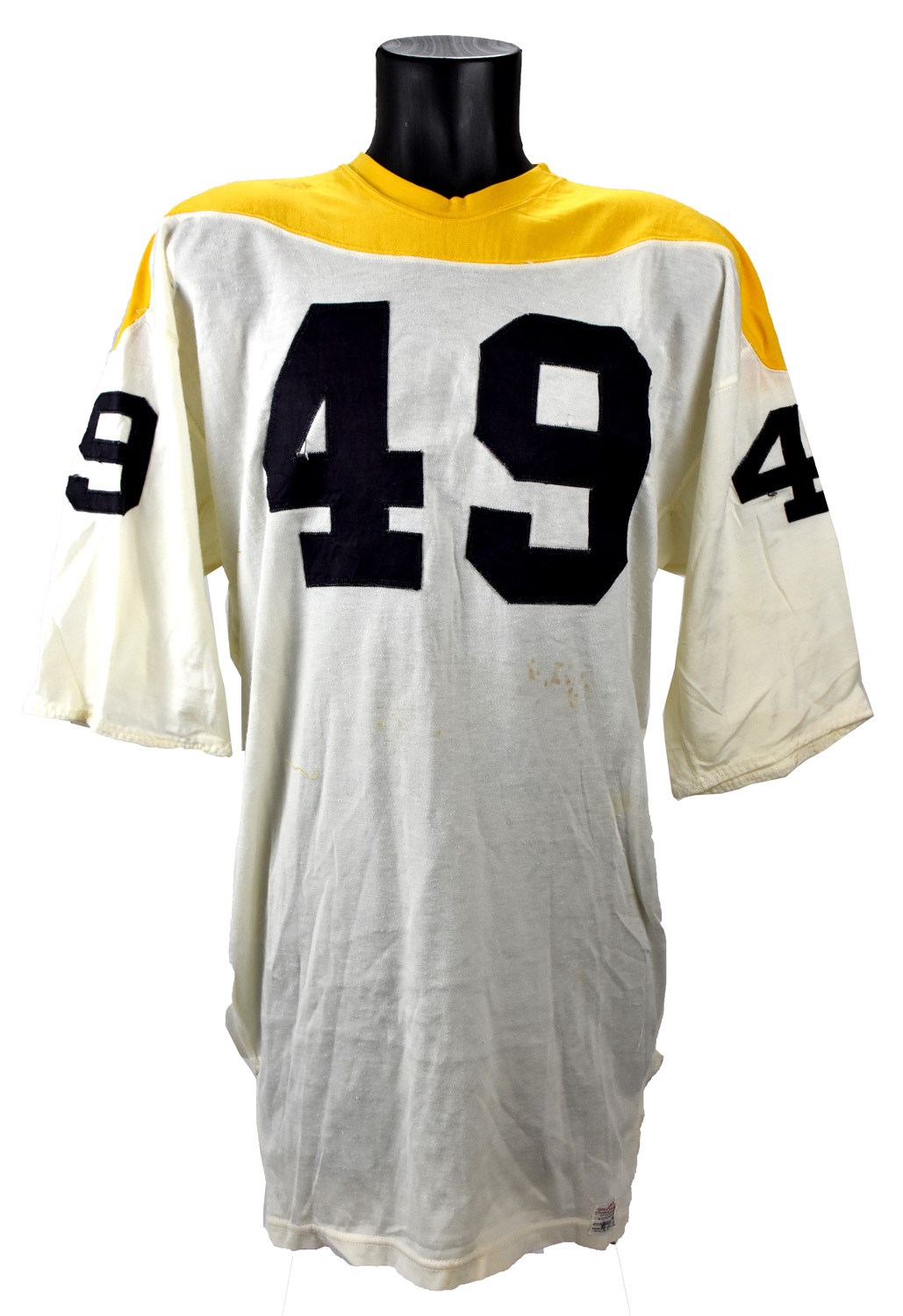 This game-worn jersey belonging to running back Amos Bullocks comes from the scarce and desirable "Batman" style the Steelers used for only two years (1966 & 67'). Bullocks' career followed a strange trajectory that ultimately led him to the Steelers in 1966. He was drafted by the Dallas Cowboys in 1962 but was traded to a Canadian Football League team a few years later to acquire the rights of a CFL player they had drafted in 1963. After breaking his ankle in his first season in the CFL, Bullocks was waived by the BC Lions. He spent the next year out of football entirely, but received a try-out from the Steelers after penning a letter to then head coach Bill Austin. Bullocks was signed to the team's taxi squad but eventually earned a spot on the regular roster, and in the final game of the year logged 29 carries for 83 yards and a touchdown. The jersey is mostly white save for a gold yoke that adorns the top of the uniform. Bullocks' number "49" appearing in black on the front, back, and both shoulders. A Honus Wagner Sporting Goods tag can be seen on the tail, denoting the jersey's size as "44". The jersey has seen nice use with some staining, four team repairs at the right shoulder area, and some pilling inside. All jerseys come directly from the Steelers archive and come with an LOA from the Steelers.