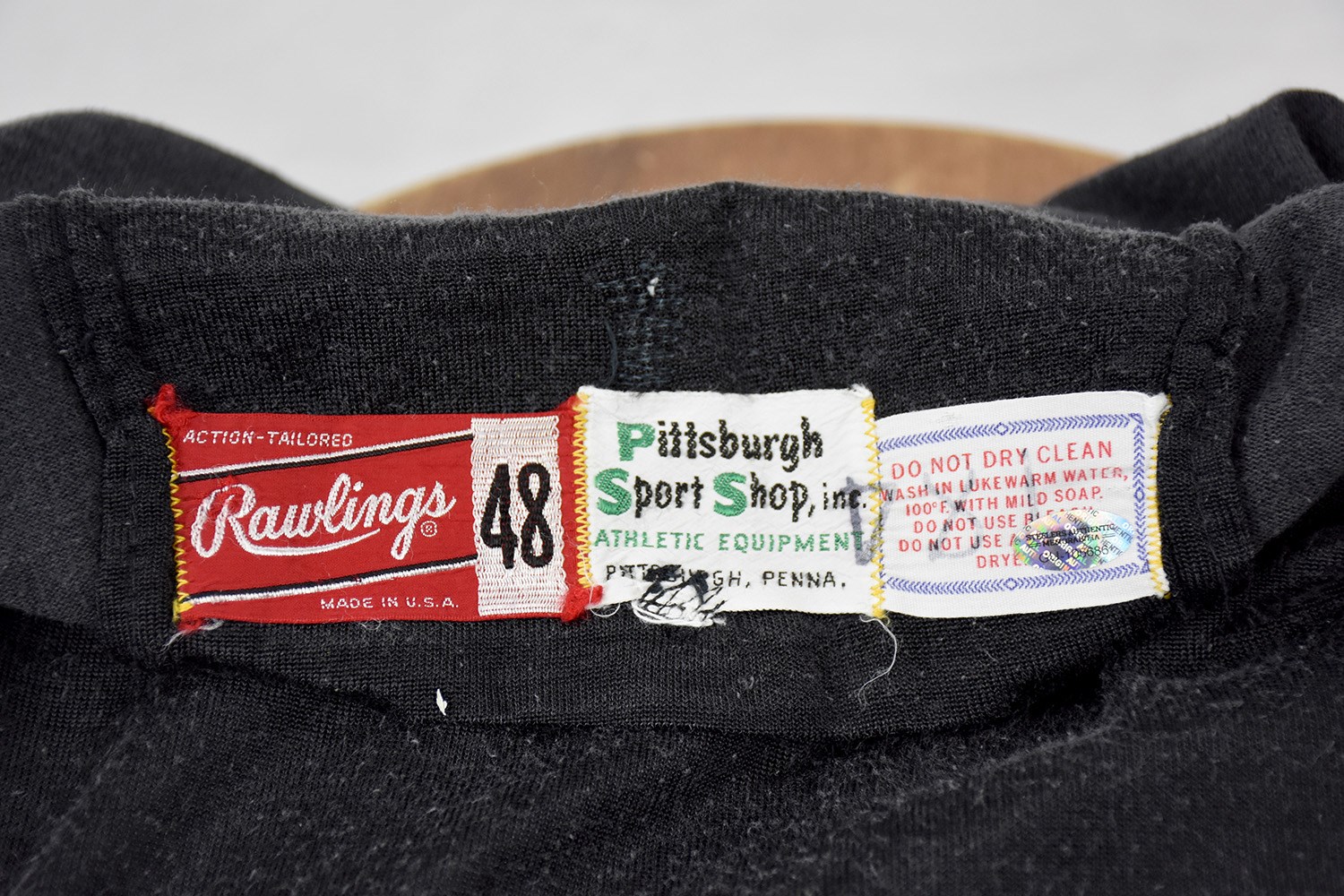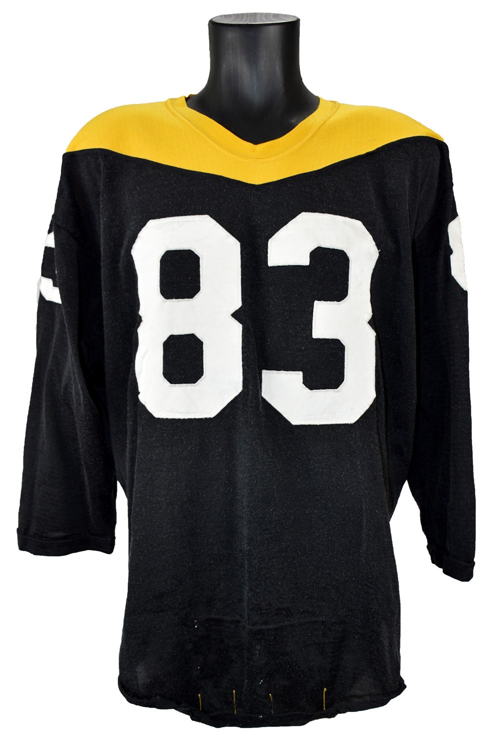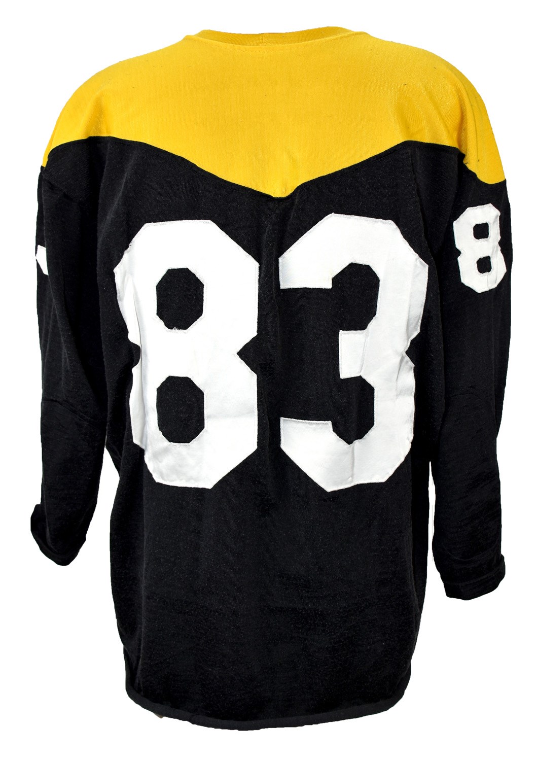 This unique jersey belonging to placekicker Mike Clark comes from the scarce and desirable "Batman" style the Steelers used for only two years (1966 & 67'). Clark, who wore it during the 1966 & 1967 seasons, was selected to the Pro Bowl in 1966. The jersey is mostly black and is adorned with a gold yoke at the top of the uniform with Clark's number "83" appearing in white on the front, back, and both shoulders. It has seen nice use with heavy pilling inside, and the crotch piece has been removed. Inside the front tail, a Rawlings size 48 tag can be found along with a Pittsburgh Sport Shop tag. All jerseys come directly from the Steelers archive and come with an LOA from the Steelers.