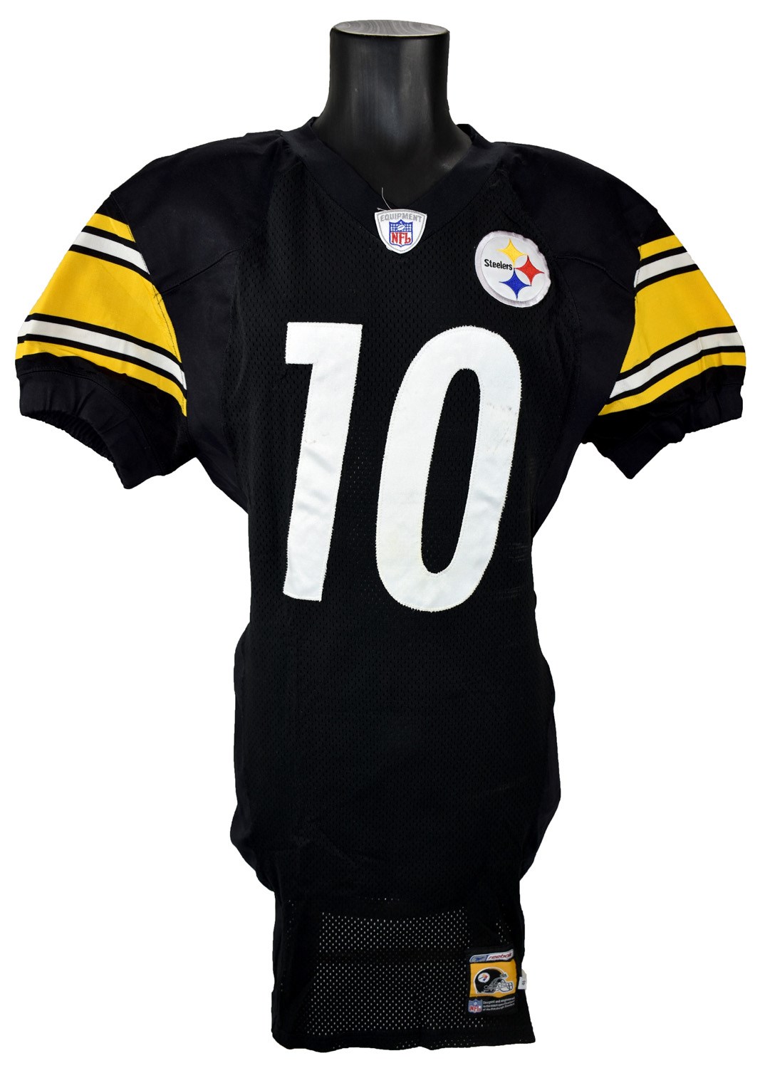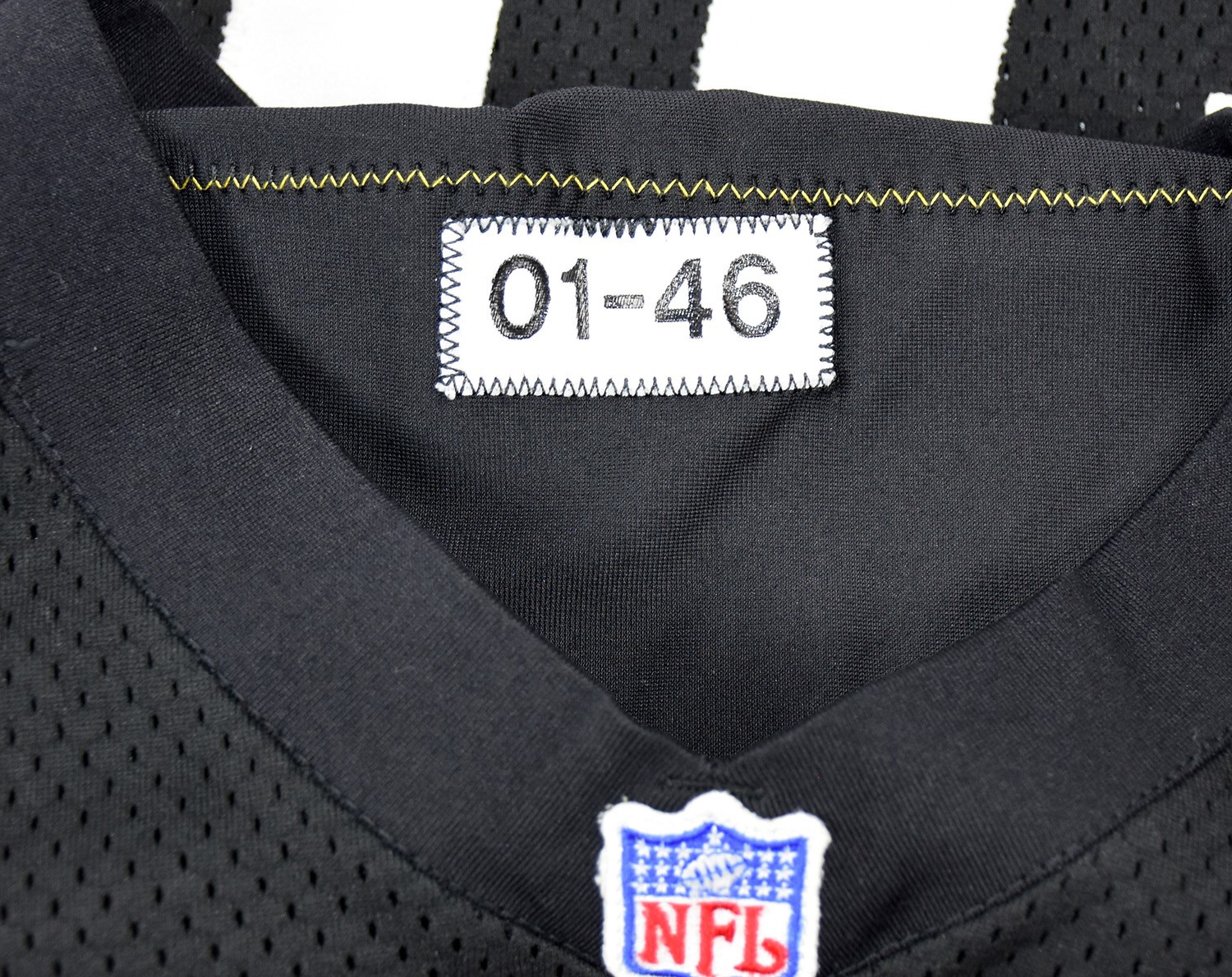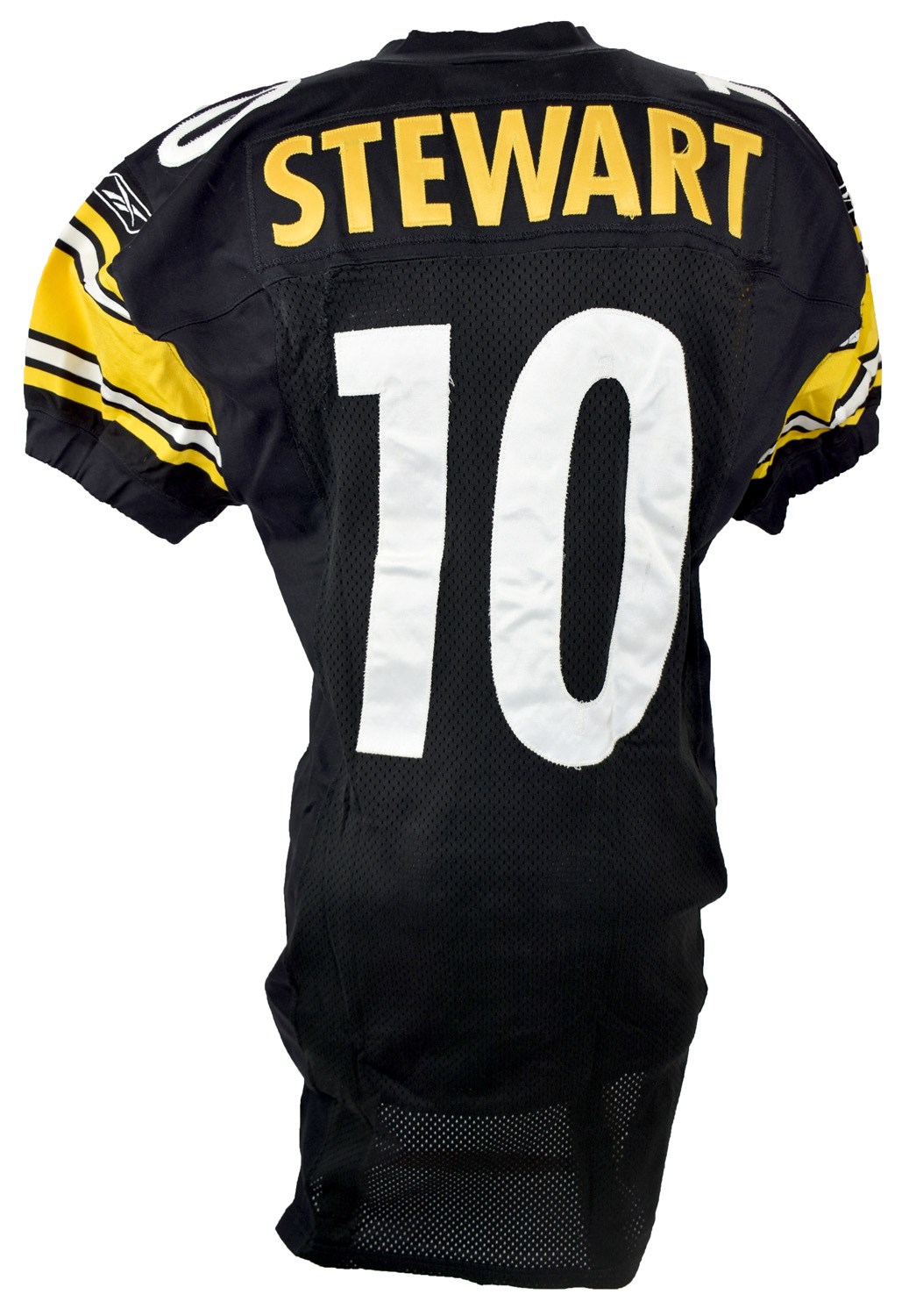 Though it didn't end in Super Bowl glory, the 2001 season was one to remember for Kordell Stewart and the Pittsburgh Steelers. After a few lackluster years to close out the 1990's, Stewart and the Steelers rebounded in 2000, just missing out on the playoffs with a 9-7 record. They continued to build on the momentum in 2001, posting a conference best 13-3 record and vanquishing the reigning Super Bowl champion Baltimore Ravens in the divisional round of the playoffs before falling to the New England Patriots in the AFC Championship Game. This classic black, home jersey was game worn in 2001 by Stewart, who also made the Pro Bowl that year and was named AFC Offensive Player of the Year. "STEWART" appears on the back in gold letters sewn on a black name plate, while his number "10" can be found stitched on the front, back, and both shoulders. The Reebok jersey has a tag inside its collar that reads "01-46" representing the year it was made and its size. It has seen nice use with two team repairs to the right sleeve and one repair to the back, as well as other marks from use. Stewart capped out his career with an astounding 38 rushing touchdowns, ranking him fourth all-time among NFL Quarterbacks. All jerseys come directly from the Steelers archive and come with an LOA from the Steelers.