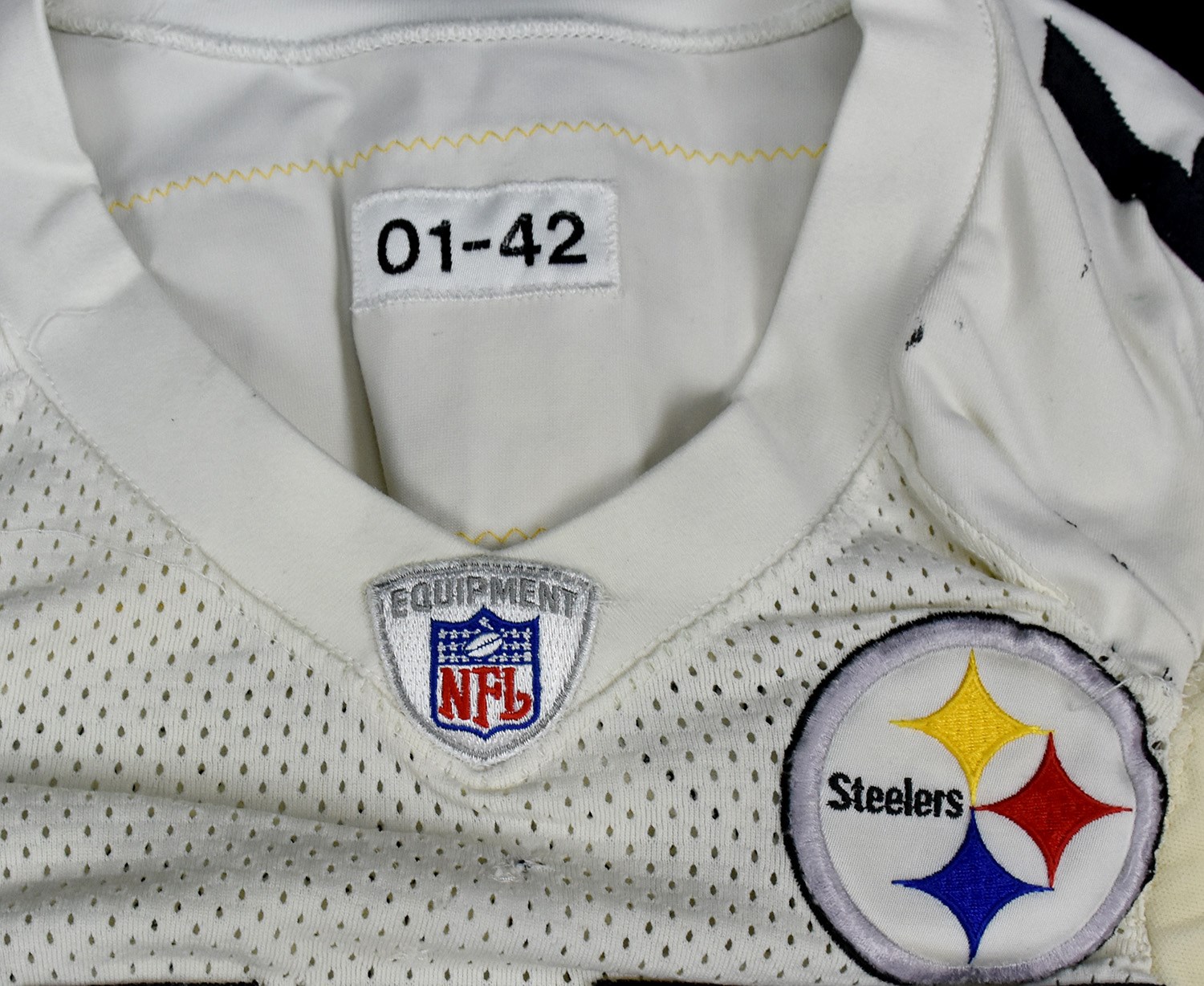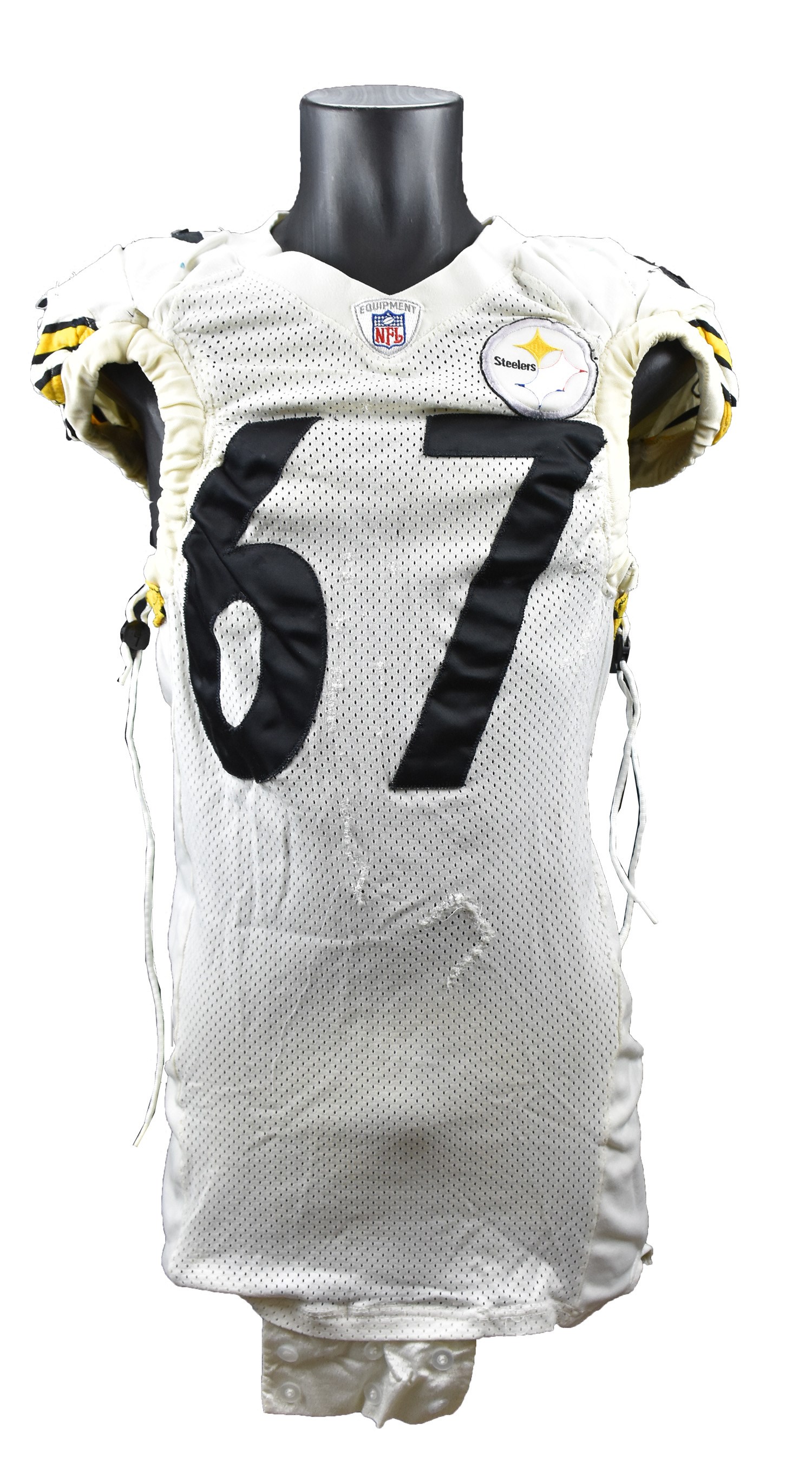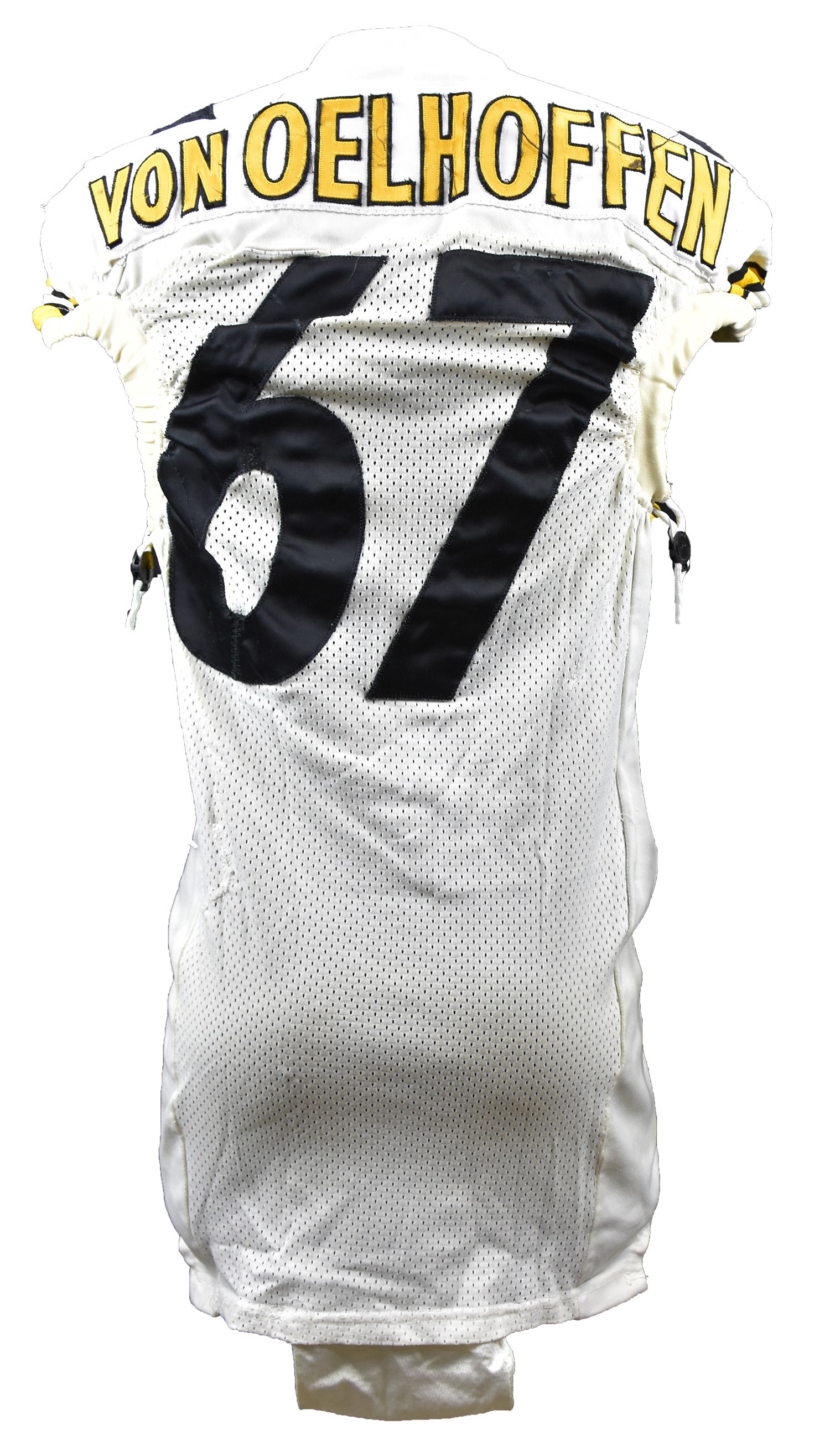 The Hawaiian defensive lineman was signed by the Steelers in 2000 and went on to start in all but one game in his six years with the team. The pinnacle of his tenure in the Steel City came in the 2005 season, when he was part of the squad that defeated the Seattle Seahawks in Super Bowl XL. This white, road jersey was made by Reebok and game worn by von Oelhoffen in 2001. His lengthy surname stretches from shoulder to shoulder in gold lettering on a white name plate on the back of the jersey, while his number "67" appears sewn in black on the front, back, and both shoulders. The jersey has seen fantastic use, with more than 18 team repairs visible, as well as lots of heavy wear and abrasions. The size and year and it was made can be found on a tag inside the collar, which reads "01-42". The sleeves have custom draw strings, as von Oelhoffen was ostensibly a large man. This jersey has been photo-matched to a Fleer football card. All jerseys come directly from the Steelers archive and come with an LOA from the Steelers.