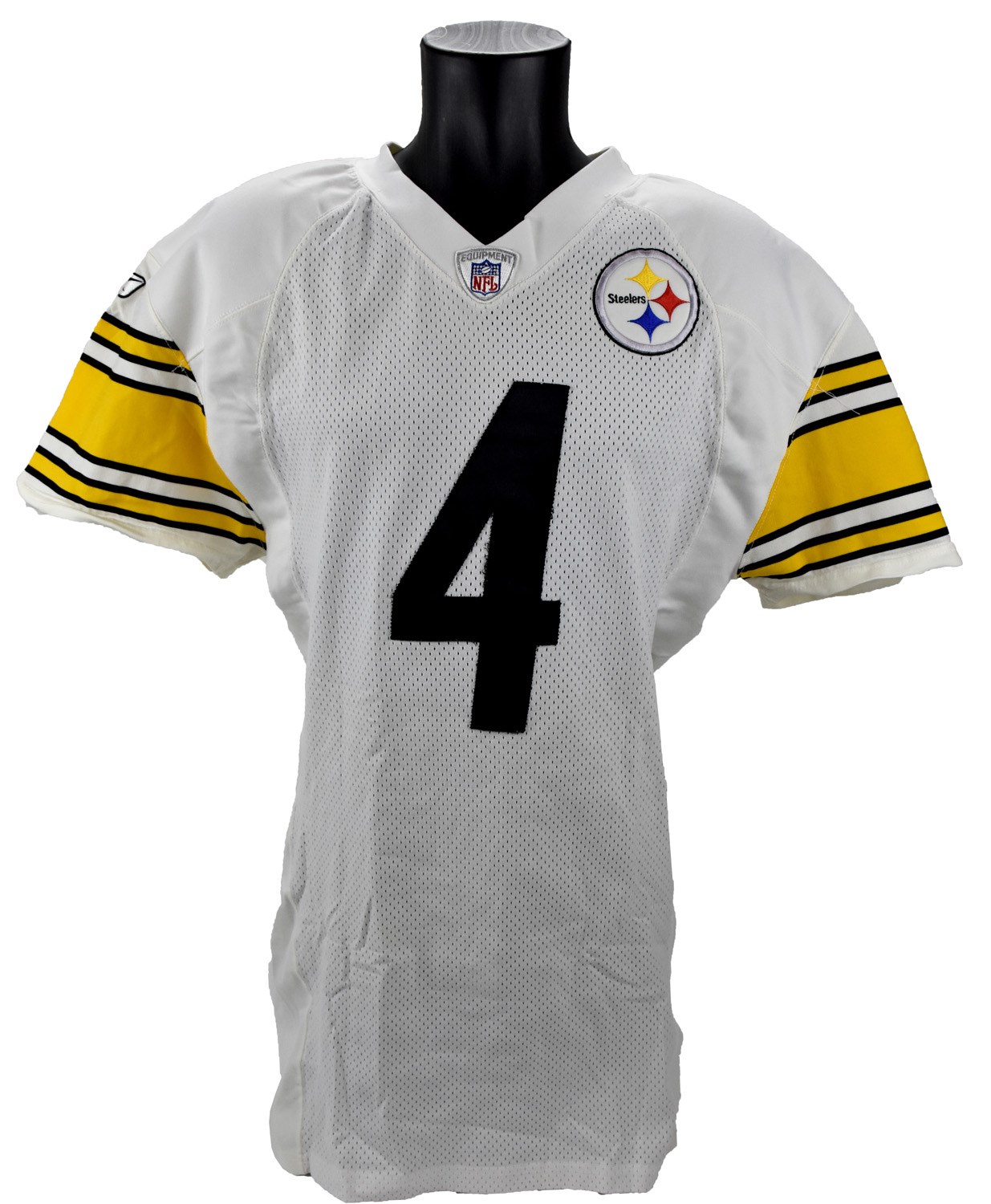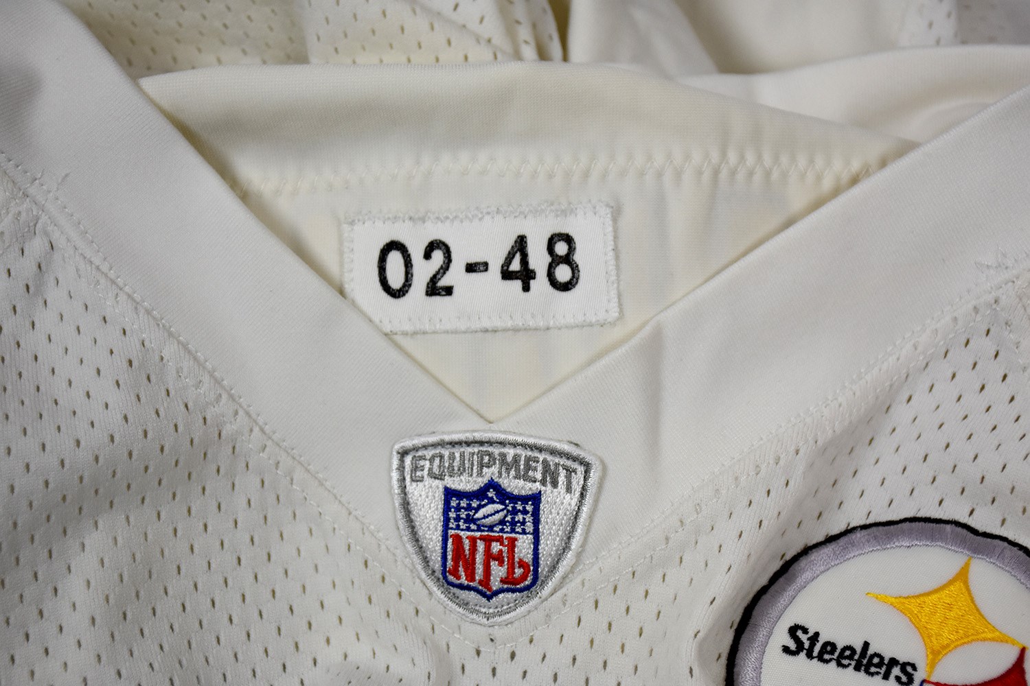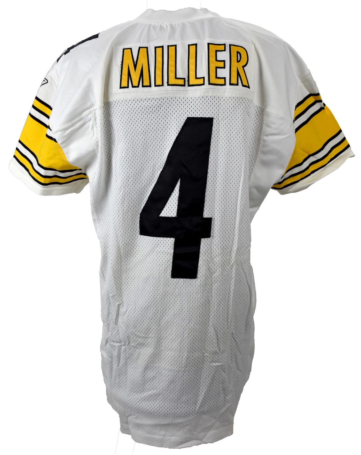 Punter Josh Miller spent the better part of a decade with the Steelers in the late 1990's and early 2000's. The former college All-American established himself nicely in Pittsburgh, holding down the team's punting duties for eight seasons and even being named a Pro Bowl alternate in 1999. This white, road jersey made by Reebok was worn by Miller during the 2002 season. His number "4" appears sewn in black on the front, back, and both shoulders, while his name can be found in gold lettering with a black outline on a white name plate on back. Inside the collar, a tag denotes the year it was made and its size as "02-48". All jerseys come directly from the Steelers archive and come with an LOA from the Steelers.