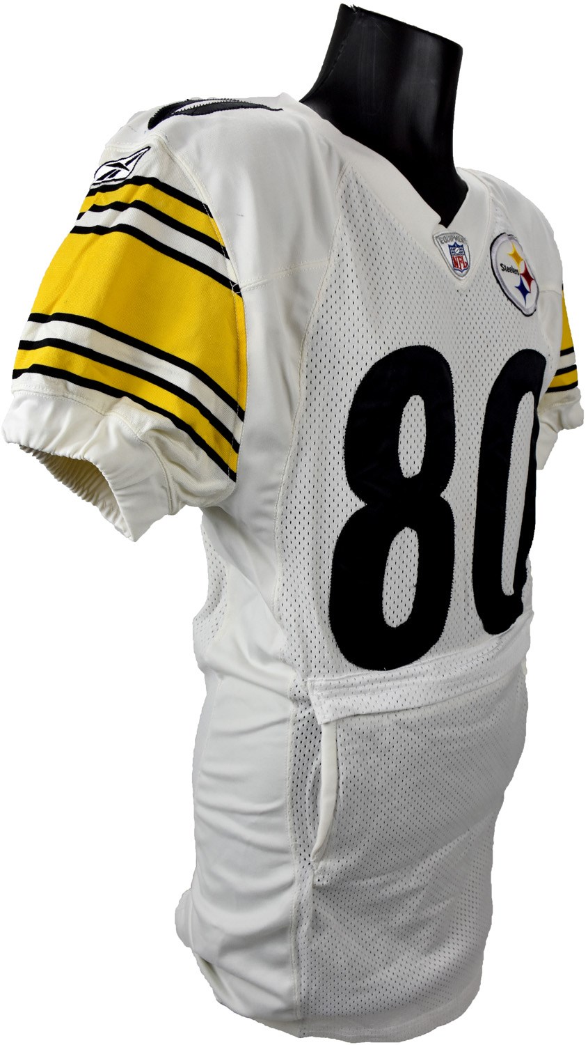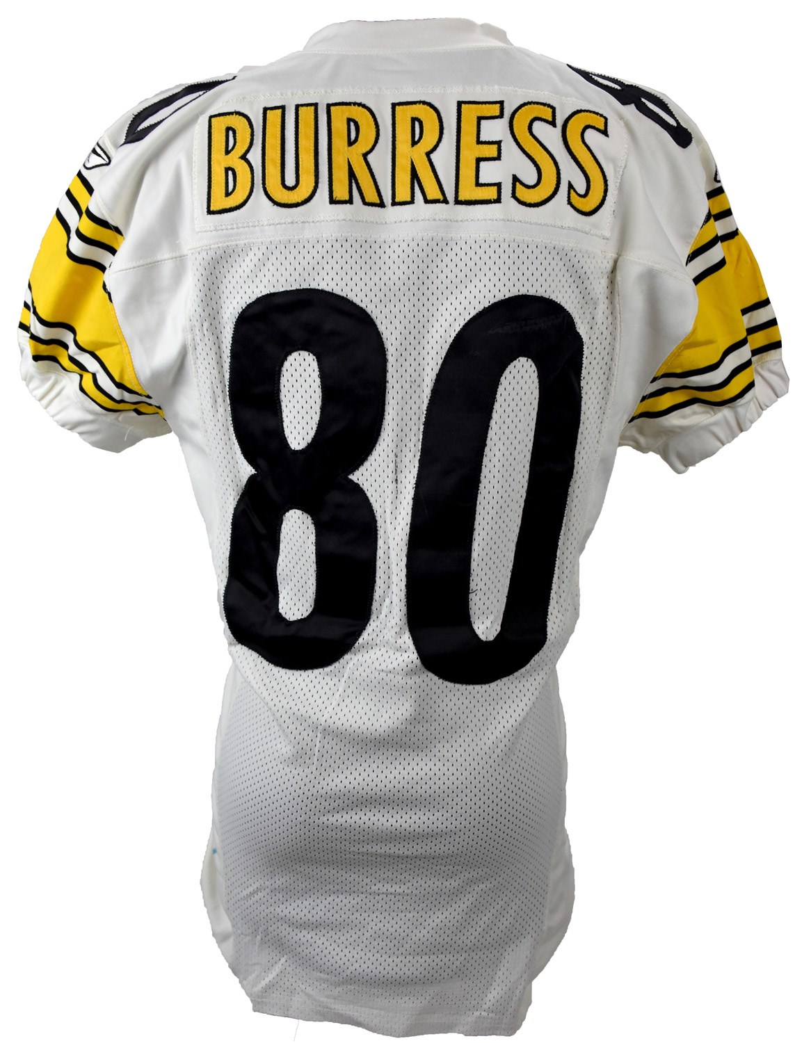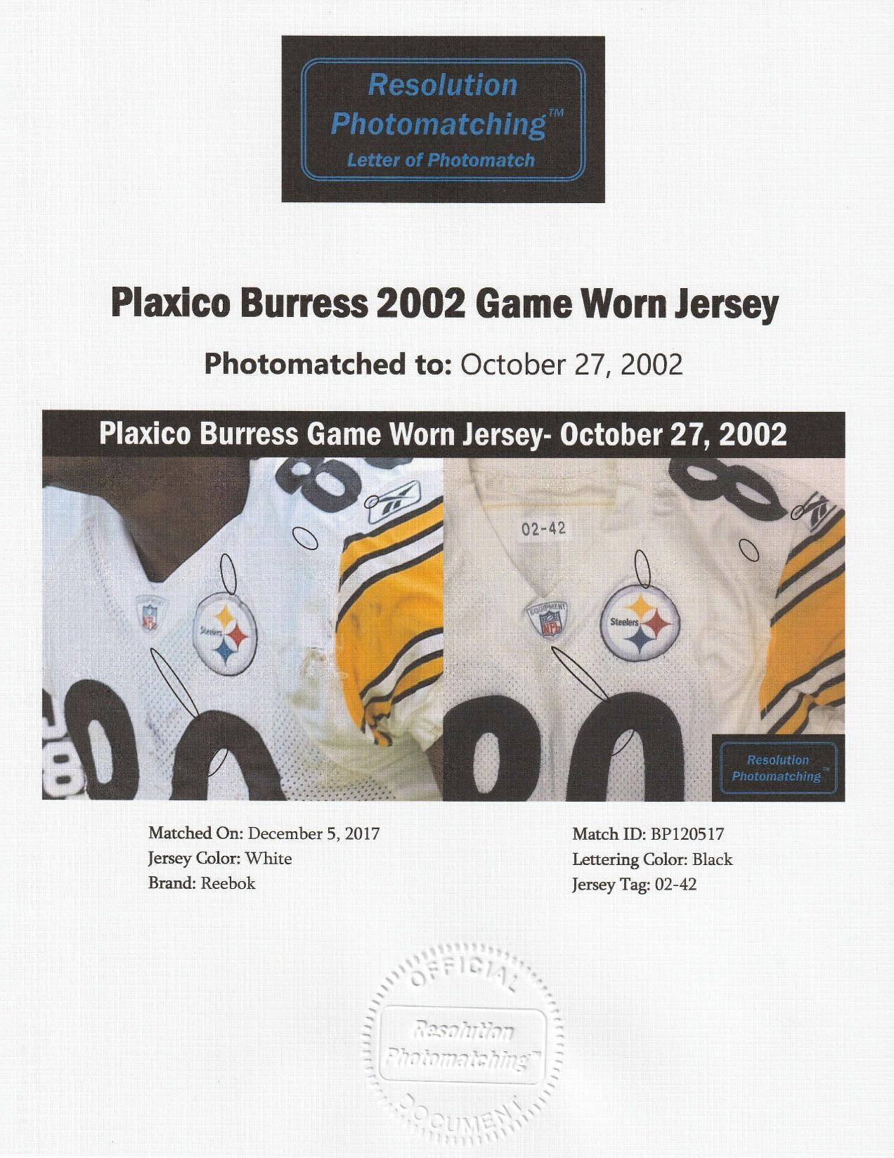 Plaxico Burress has had many memorable moments in the NFL, but his time in Pittsburgh was largely defined by forming a peerless wide receiver duo with Hines Ward. The skilled tandem torched secondaries in the early 2000's, twice logging more than 1000 receiving yards apiece, making them the first pair in Steelers history. This jersey, game worn by Burress, comes from the second year he and Ward accomplished the feat: 2002. The white road, jersey has a tag inside its collar denoting the year it was made and its size as "02-42". "BURRESS" appears in gold lettering with black trim on a white name plate on the back of the Reebok jersey, while his number "80" is stitched in black on the front, back, and both shoulders. The uniform has custom, fleece-lined pockets, as well as a pouch with a zipper. It shows nice use with some hit marks and scuffs. Though Burress left the Steel City in 2004, he would come back to close out his career in the black and gold (2012-13'). Photo-matched to October 27th, 2002 and November 3rd, 2002. On October 27th, Plaxico had 55-yards receiving on 5 receptions, two of them being touchdowns. Comes with LOA from Resolution Photomatching. All jerseys come directly from the Steelers archive and come with an LOA from the Steelers.