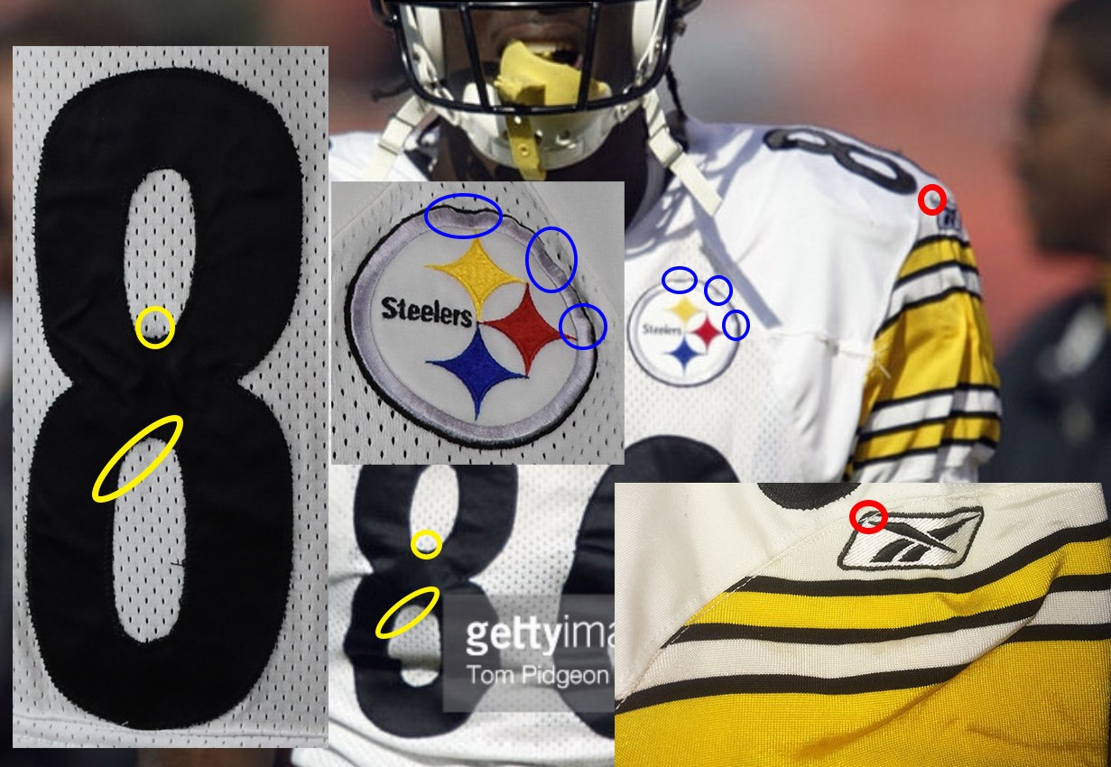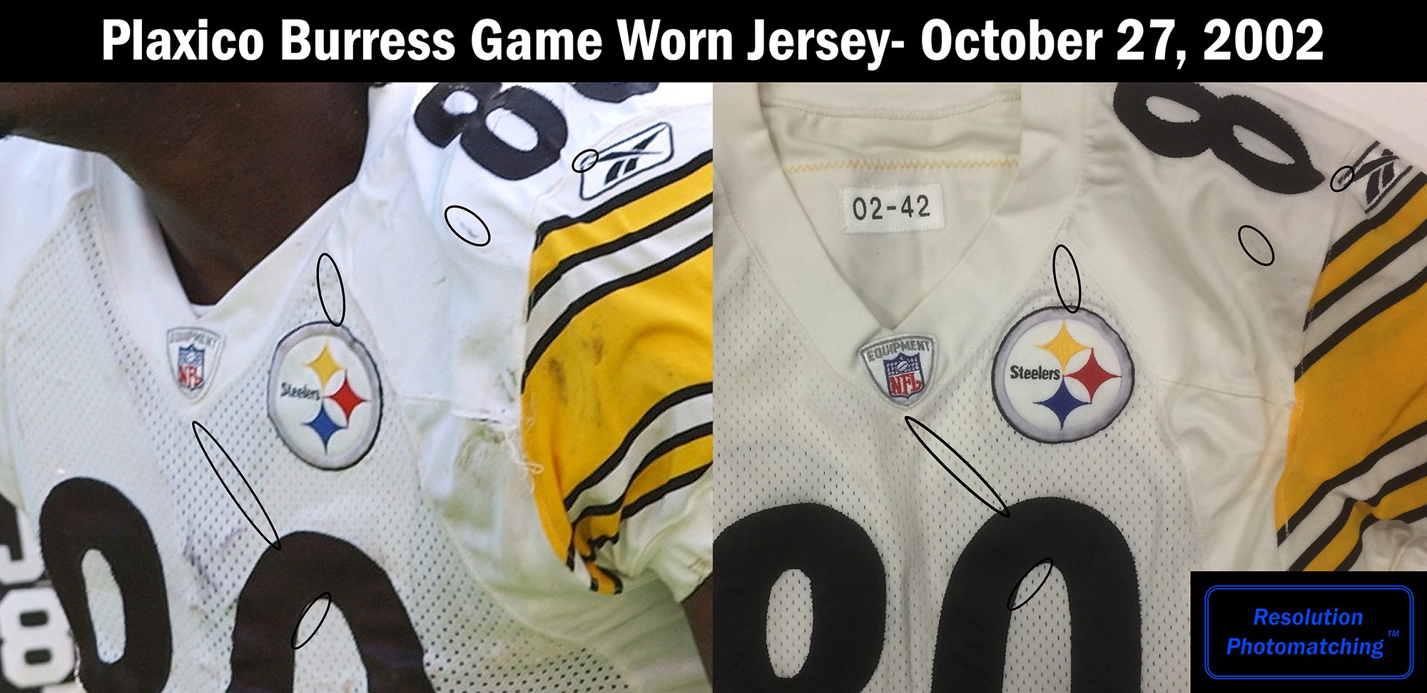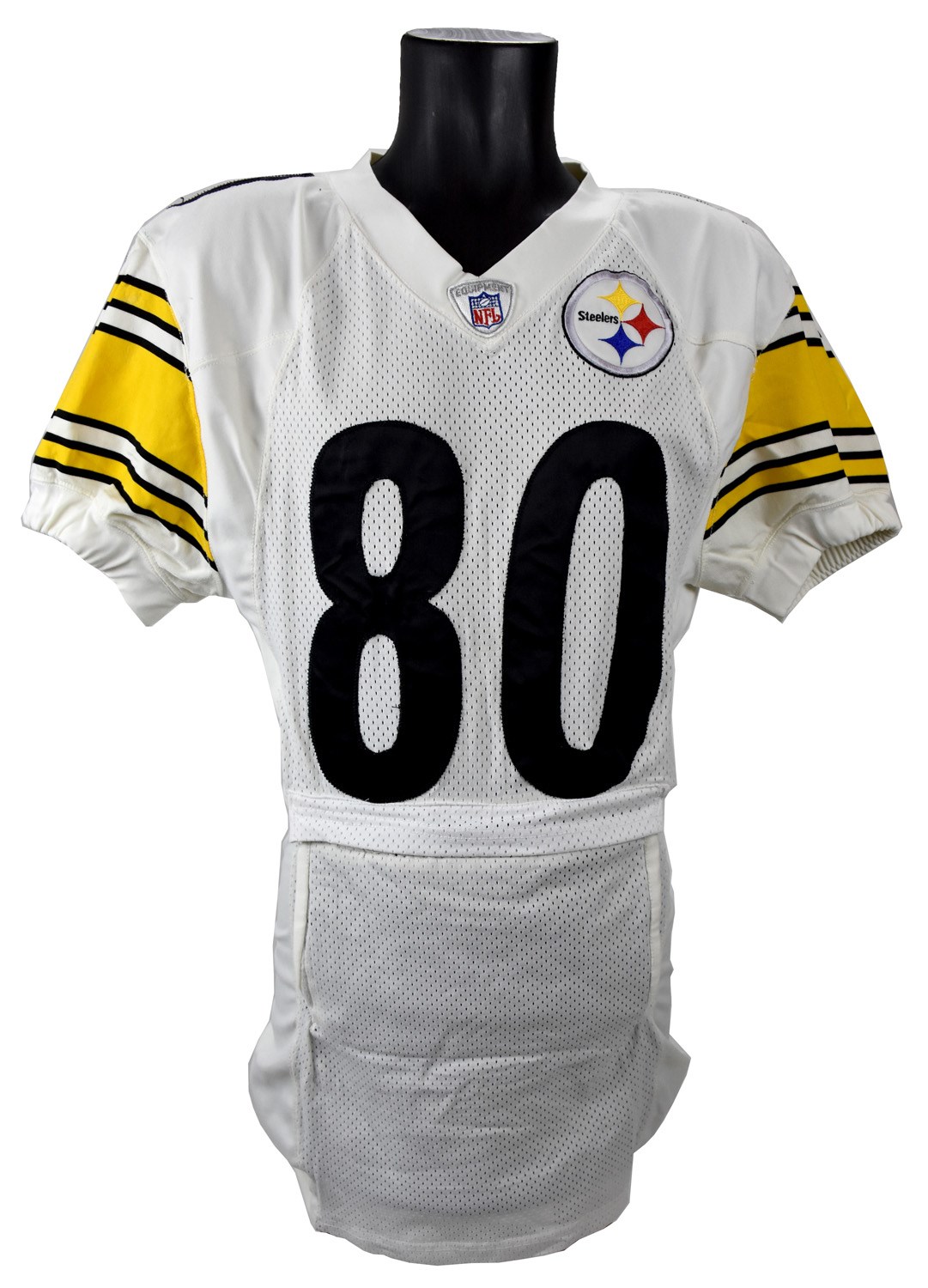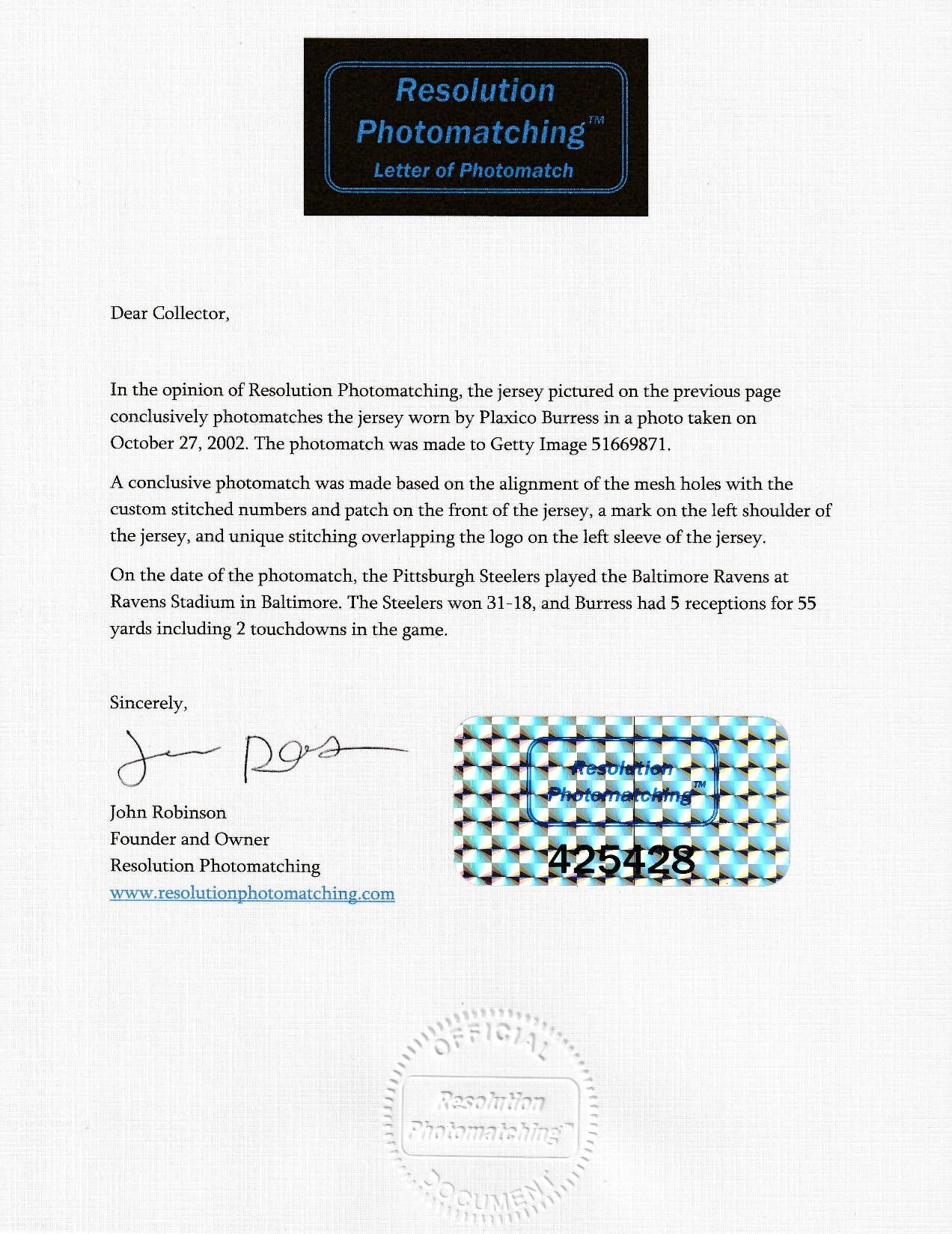 Plaxico Burress has had many memorable moments in the NFL, but his time in Pittsburgh was largely defined by forming a peerless wide receiver duo with Hines Ward. The skilled tandem torched secondaries in the early 2000's, twice logging more than 1000 receiving yards apiece, making them the first pair in Steelers history. This jersey, game worn by Burress, comes from the second year he and Ward accomplished the feat: 2002. The white road, jersey has a tag inside its collar denoting the year it was made and its size as "02-42". "BURRESS" appears in gold lettering with black trim on a white name plate on the back of the Reebok jersey, while his number "80" is stitched in black on the front, back, and both shoulders. The uniform has custom, fleece-lined pockets, as well as a pouch with a zipper. It shows nice use with some hit marks and scuffs. Though Burress left the Steel City in 2004, he would come back to close out his career in the black and gold (2012-13'). Photo-matched to October 27th, 2002 and November 3rd, 2002. On October 27th, Plaxico had 55-yards receiving on 5 receptions, two of them being touchdowns. Comes with LOA from Resolution Photomatching. All jerseys come directly from the Steelers archive and come with an LOA from the Steelers.