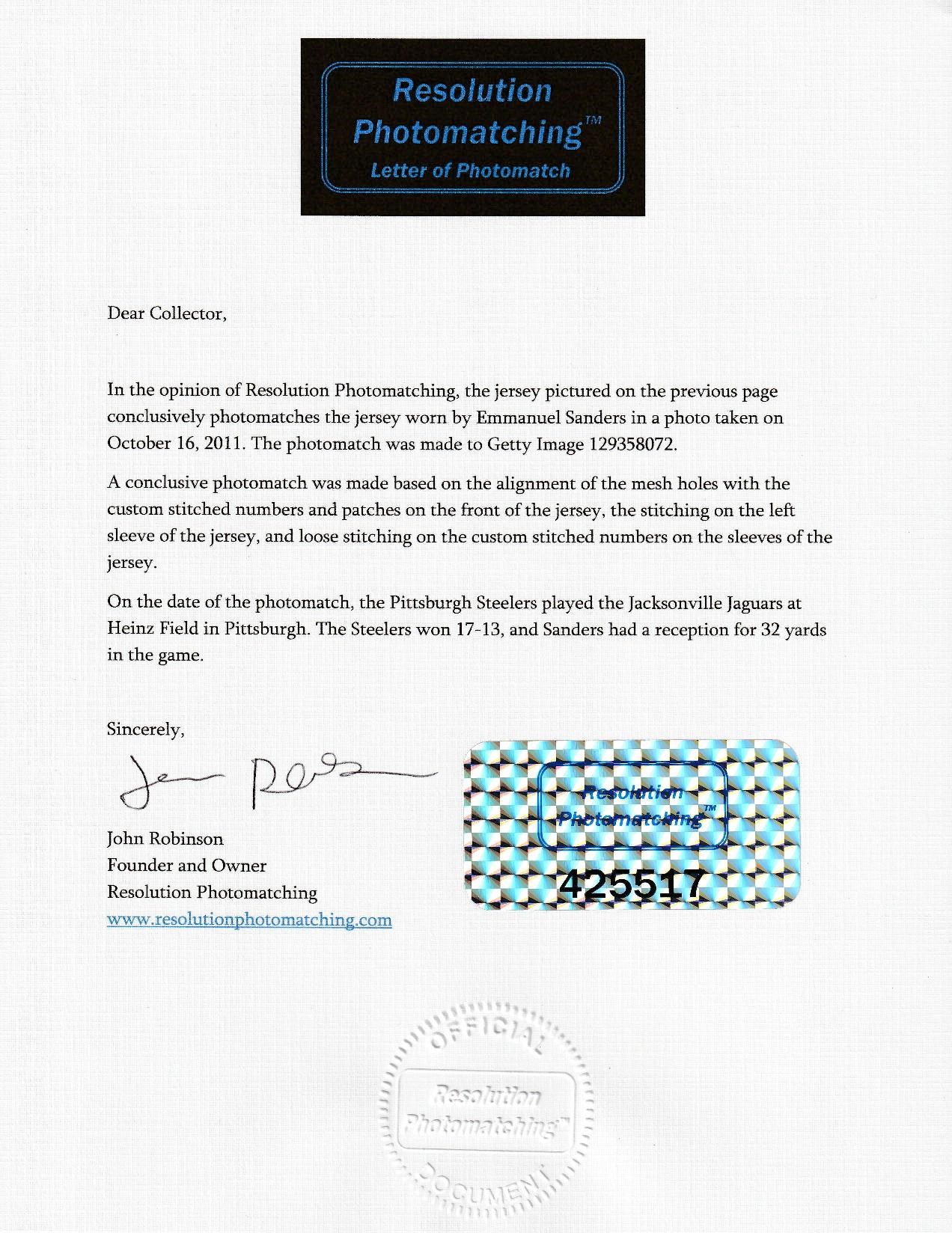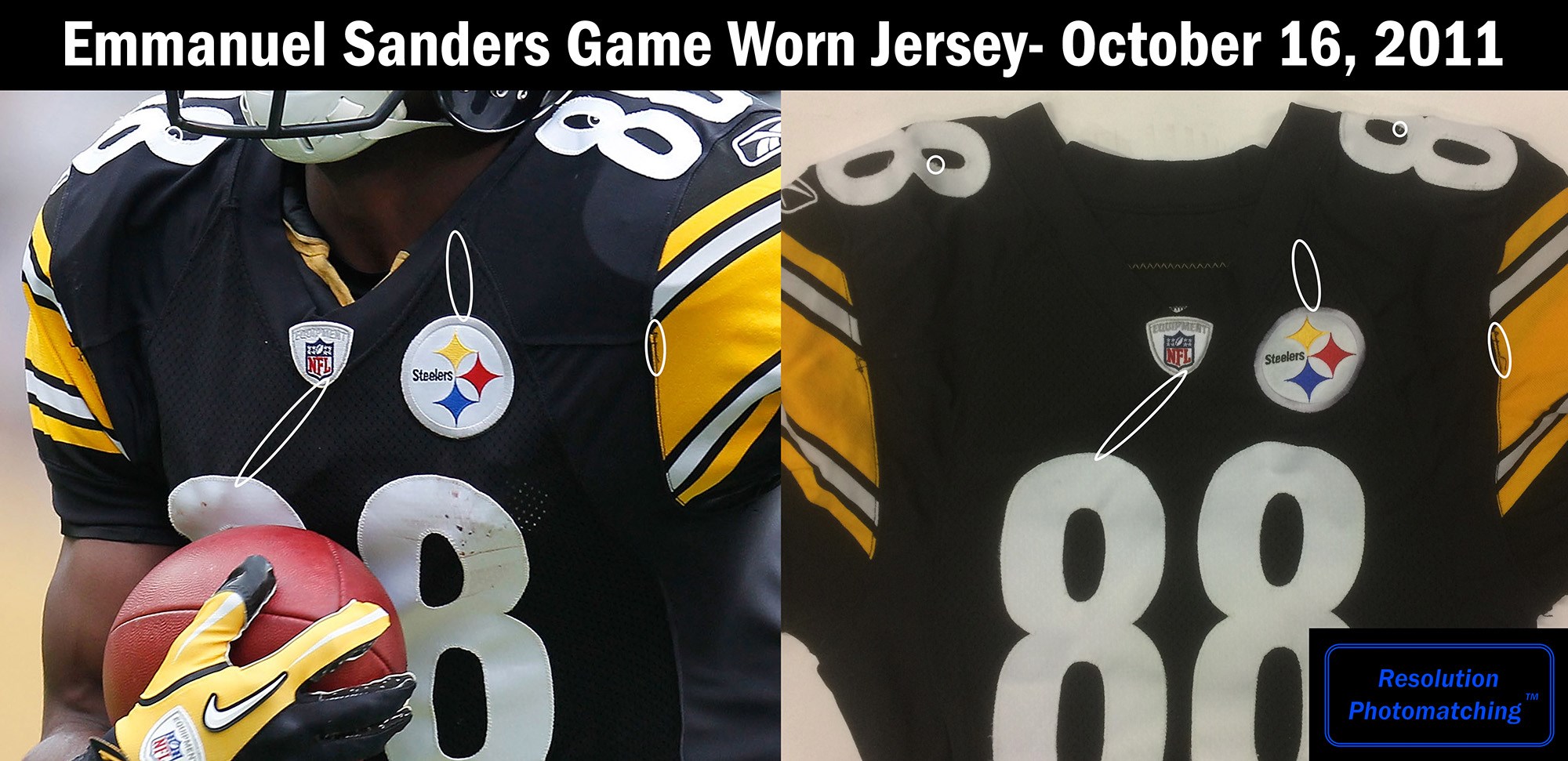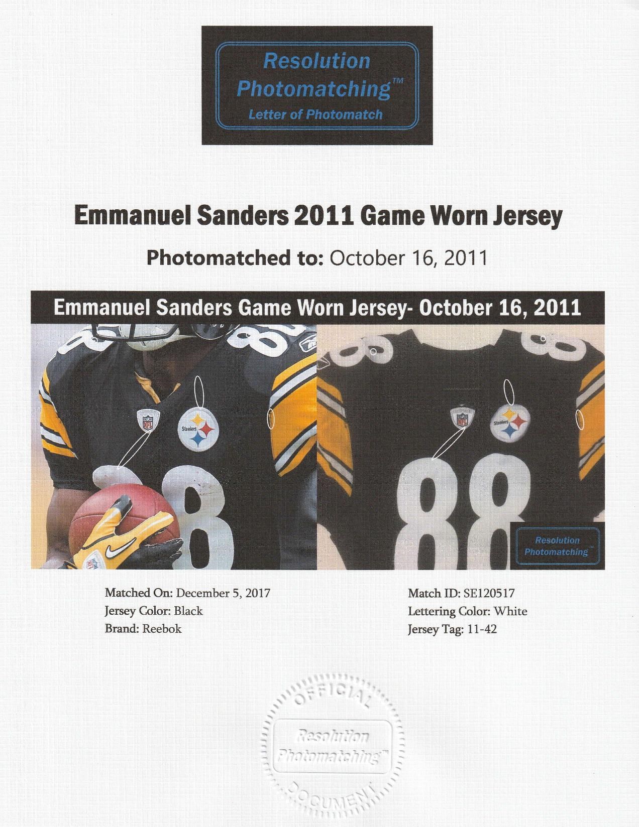 Lot # 17: 2011 Emmanuel Sanders Pittsburgh Steelers Game Worn Jersey - Photo-Matched to Multiple Games (Resolution Photomatching LOA)