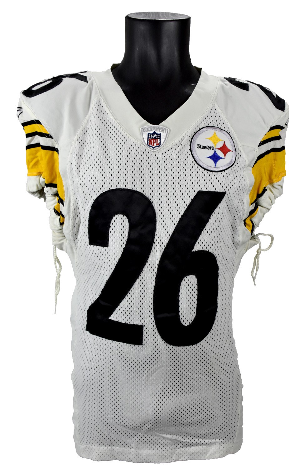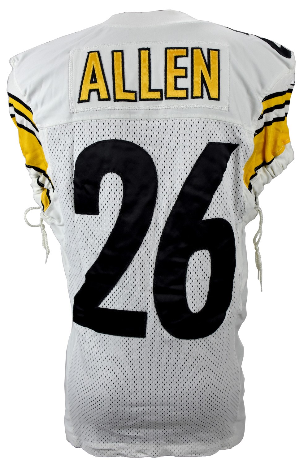 Safety Will Allen played two stints with the Steelers and this white, road jersey was game worn during the first of those. An All-American while at Ohio State University, Allen was drafted in the fourth round of the 2004 NFL Draft by the Tampa Bay Buccaneers and made his way to Pittsburgh in 2010. The Reebok jersey has Allen's number "26" sewn in black on the front, back, and both shoulders, and "ALLEN" appears in gold letters with black trim on a white name plate on the back. A tag inside the collar is missing but the jersey was originally made for the 2009 season, though it was a hold-over and not actually used until 2011. There are only two small team repairs and some light marks to speak of, and the sleeves have adjustable drawstrings. Photo-matched to the AFC Wild Card Game on January 8th, 2012. Comes with LOA from Resolution Photomatching. All jerseys come directly from the Steelers archive and come with an LOA from the Steelers.