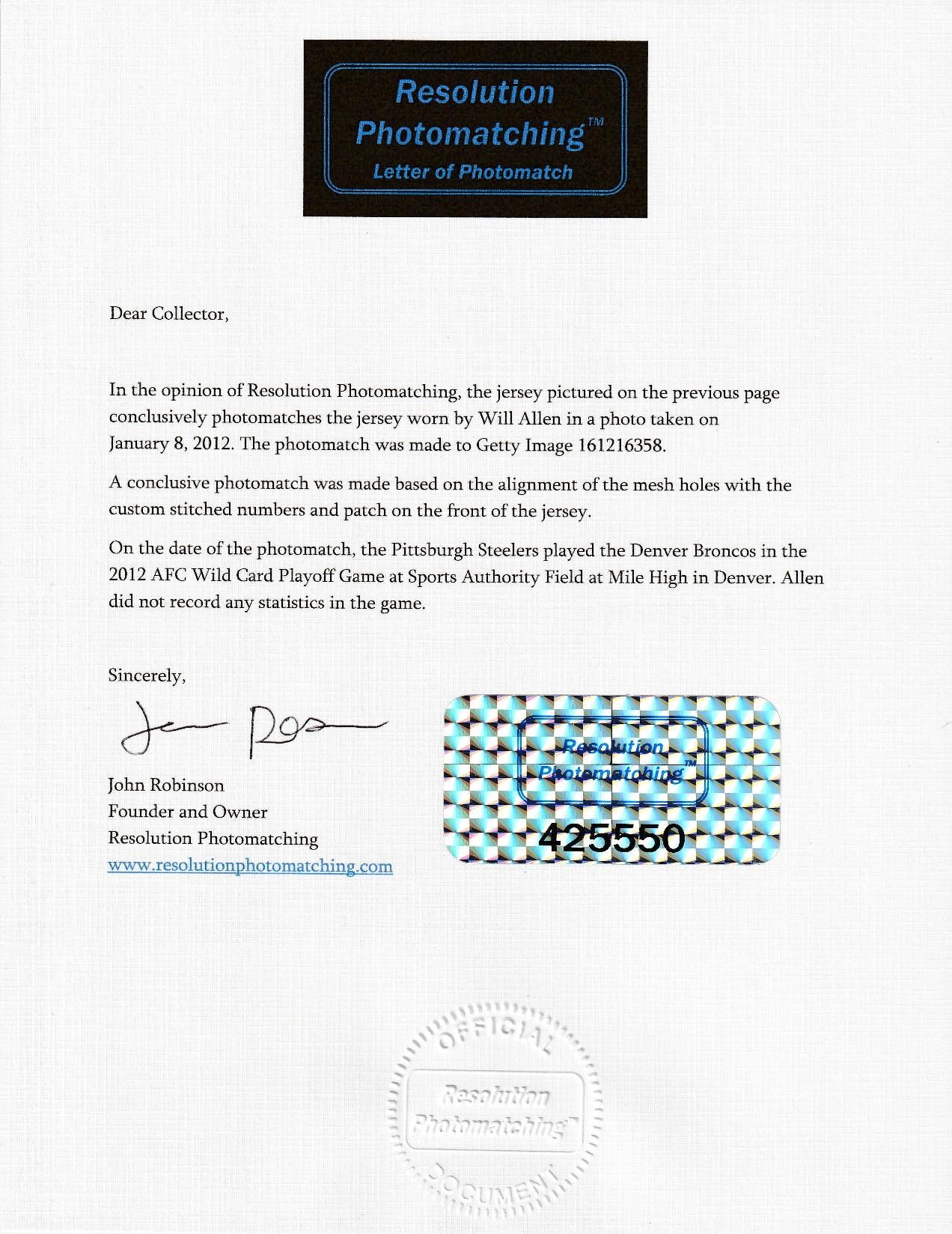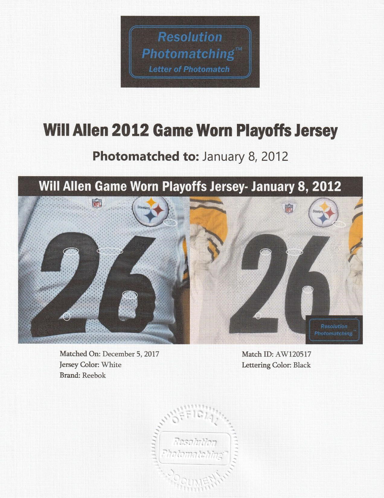 Lot # 19: 2011 Season Will Allen Pittsburgh Steelers AFC Wild Card Game Worn Jersey (Photo-Matched, Resolution Photomatching LOA)
