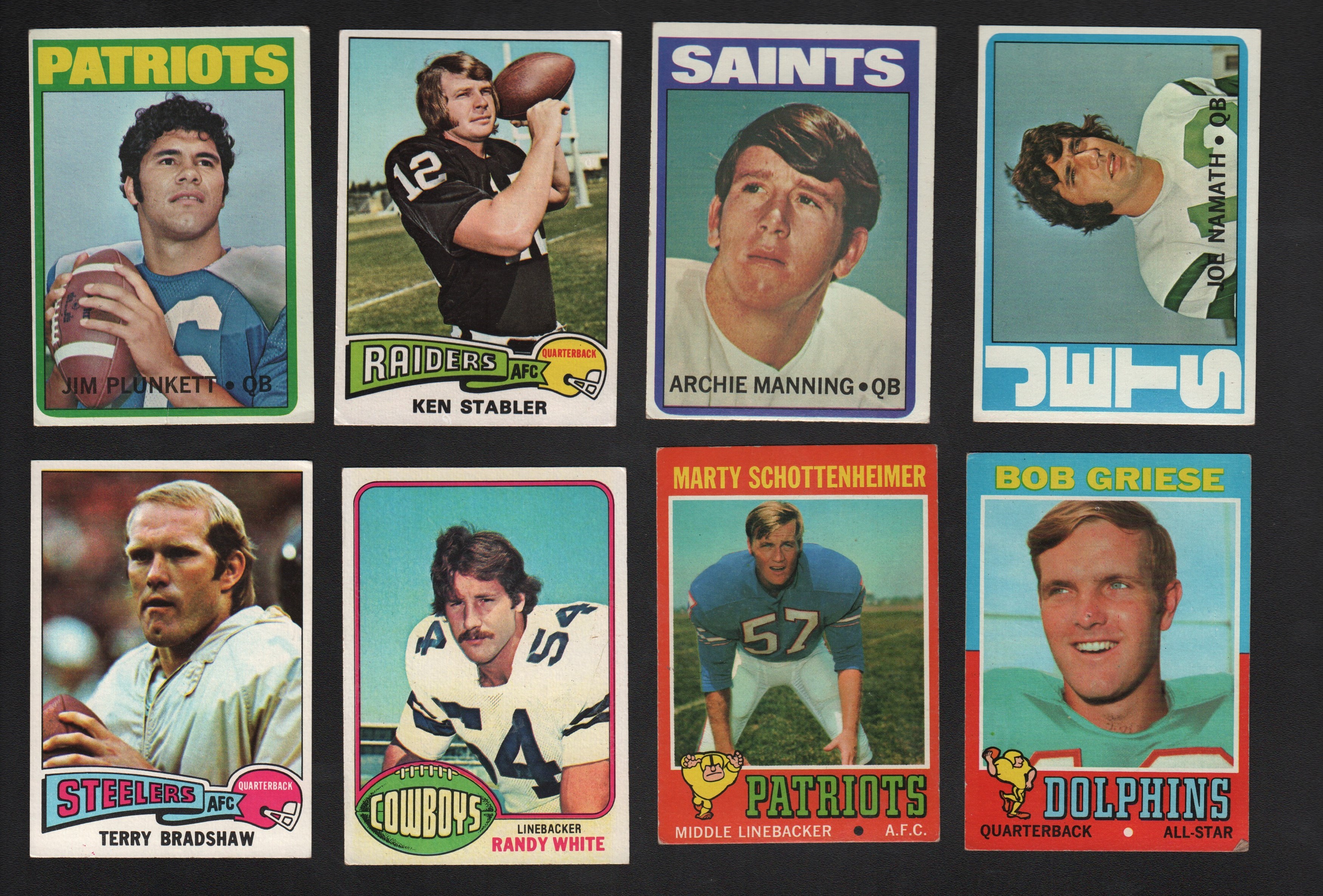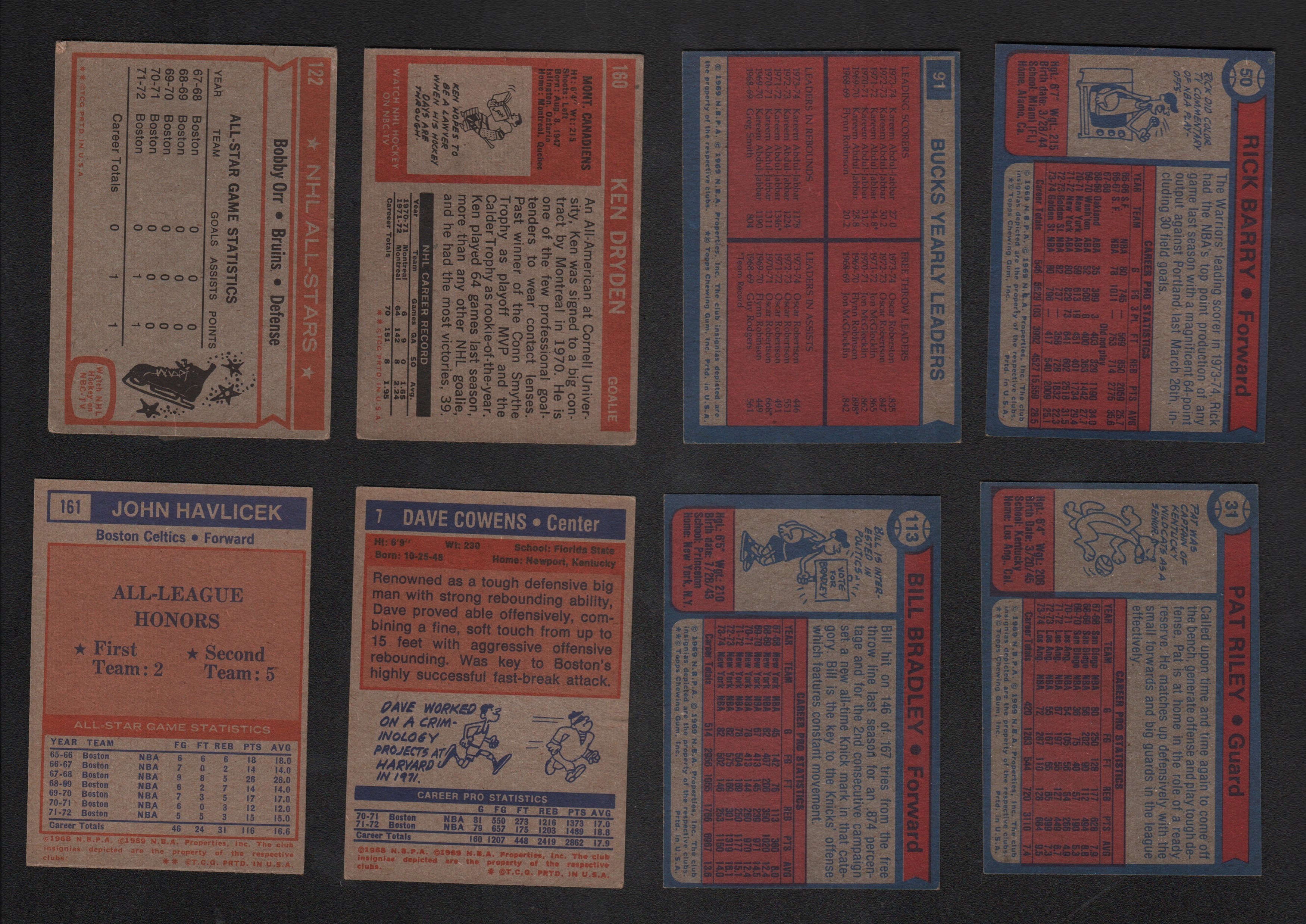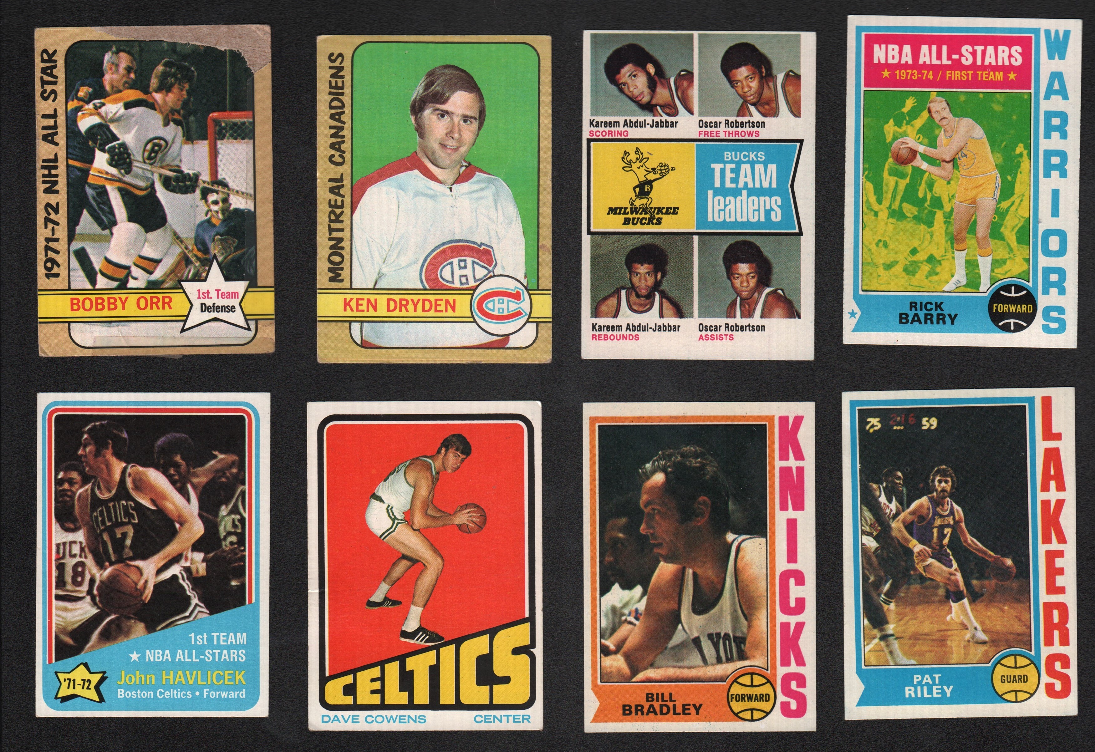 Over 1,200 cards are fresh to the market. Most are mid 1970s with some earlier 1970s. Some highlights include Joe Namath, Randy White, Paul Hornung, Bobby Orr, Ken Dryden, Bill Bradley, John Havlicek, Pat Riley. All the cards came from a kid's collection compiled over the years.